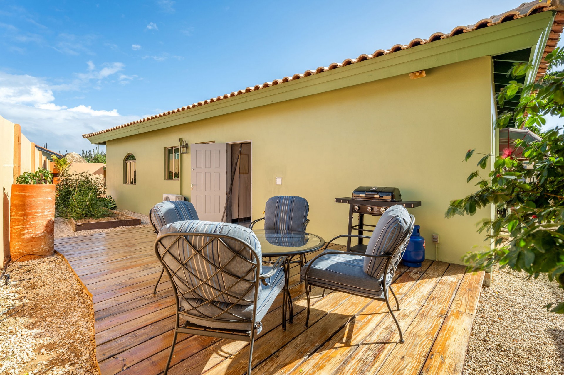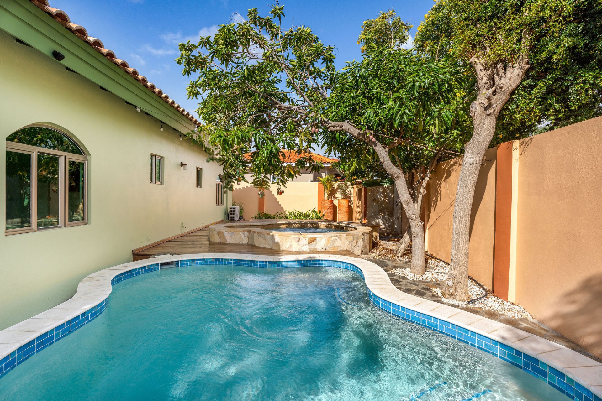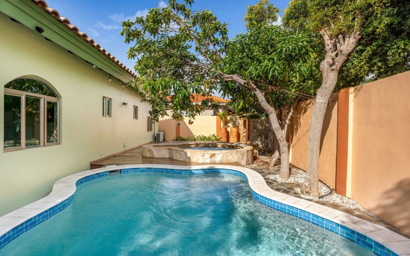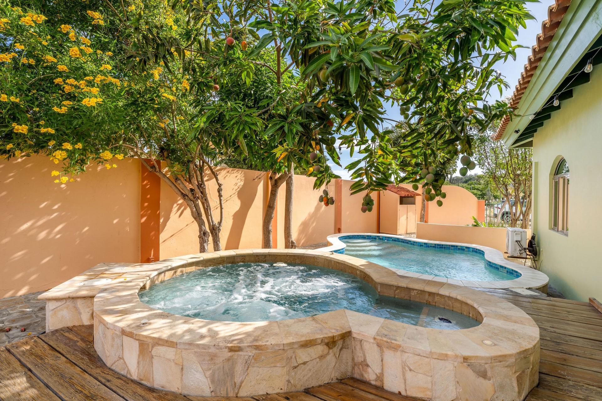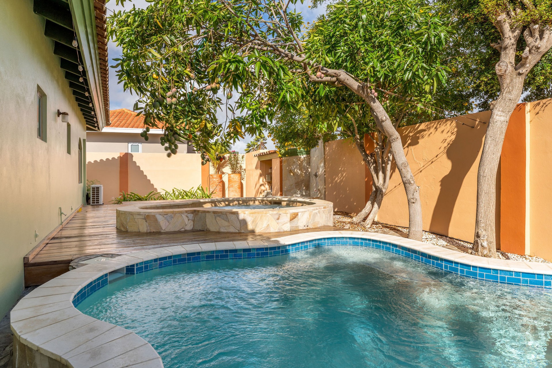 Surrounding the home are multiple outdoor lounge areas, allowing you to enjoy the peaceful ambiance of Casibari Stones & Gardens at any time of day. The beautifully landscaped garden features mature trees, lush plants, palm trees and even a mango tree, creating a private and serene outdoor setting. A true highlight of this property is the outdoor relaxation area, which includes both a jacuzzi-style pool and a separate swimming pool, making it the perfect place to unwind, cool off, and enjoy Aruba’s year-round sunshine.