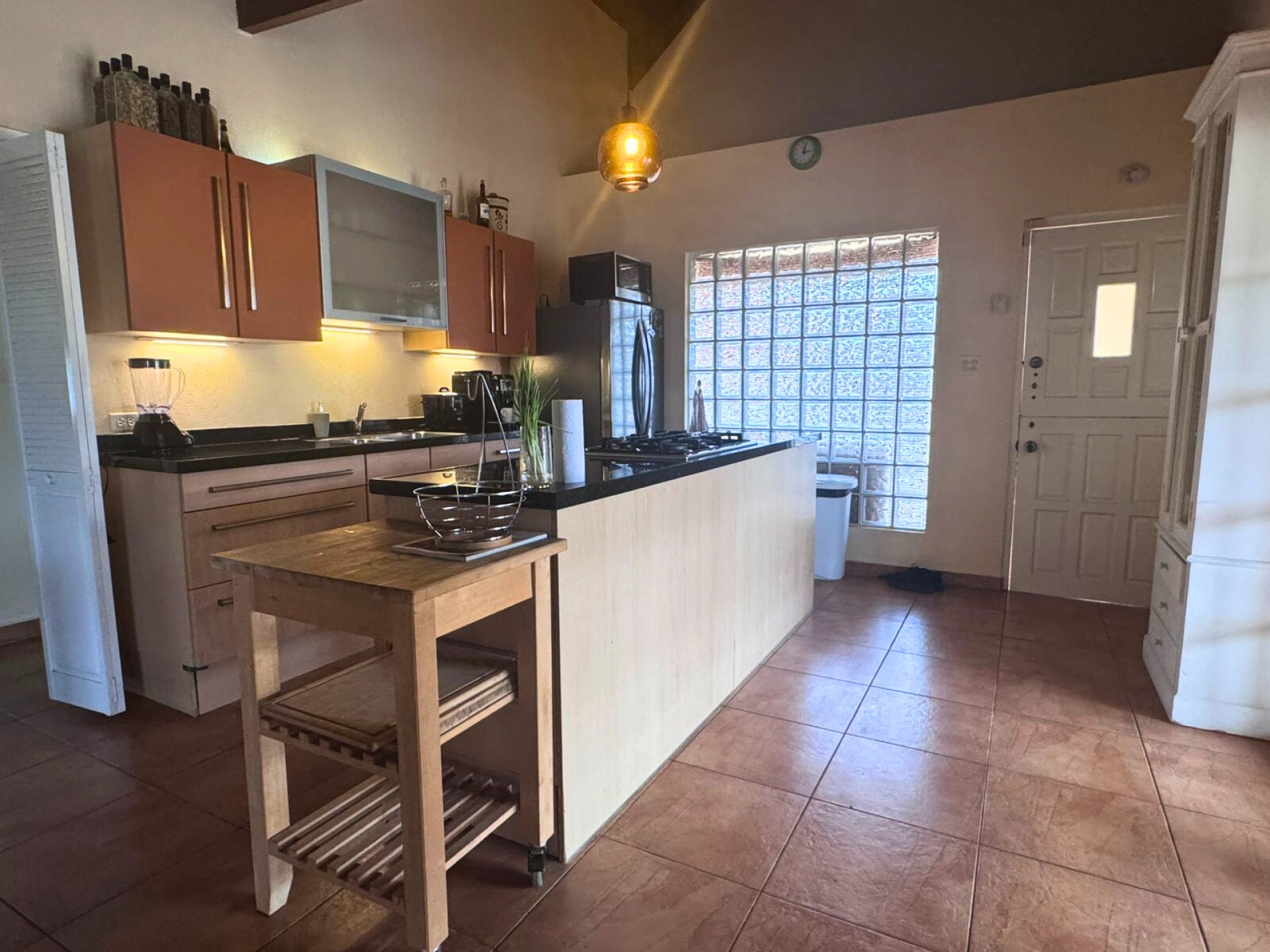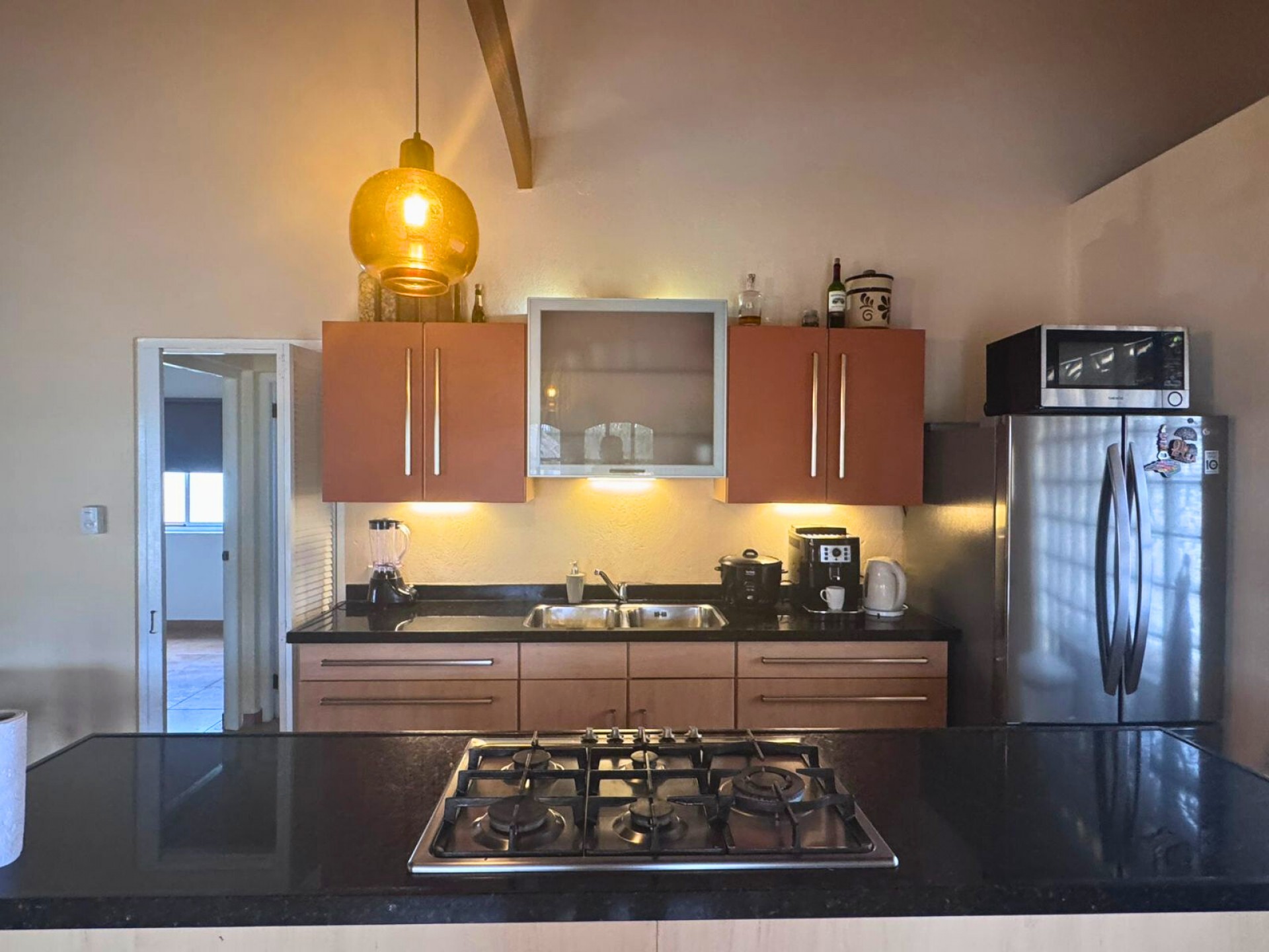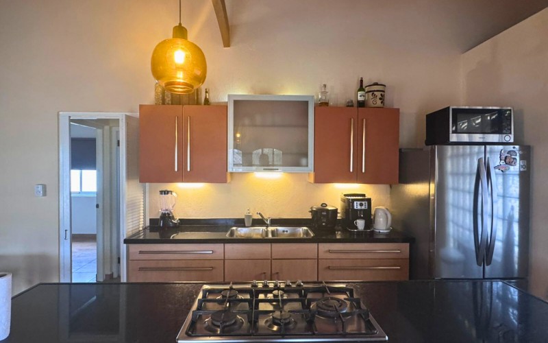 Modern kitchen with 5-burner gas cooktop and electric oven