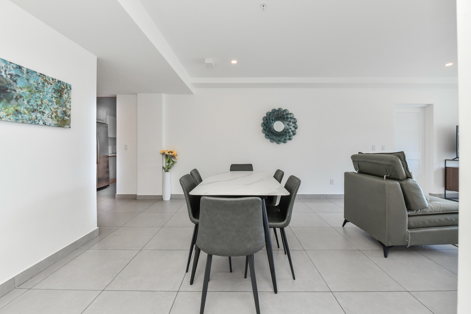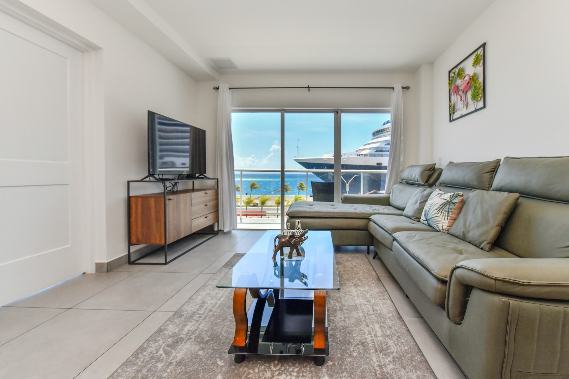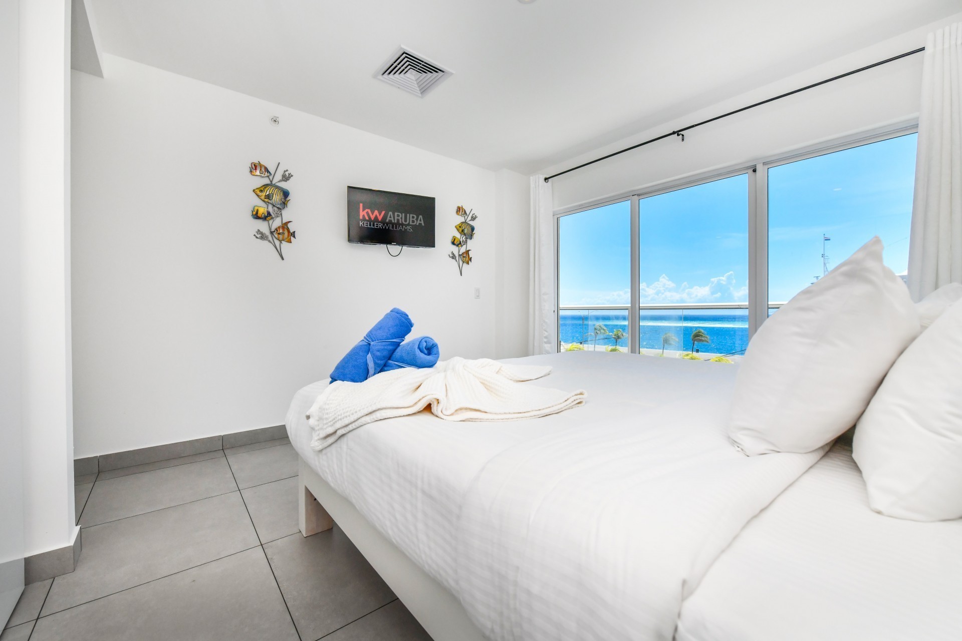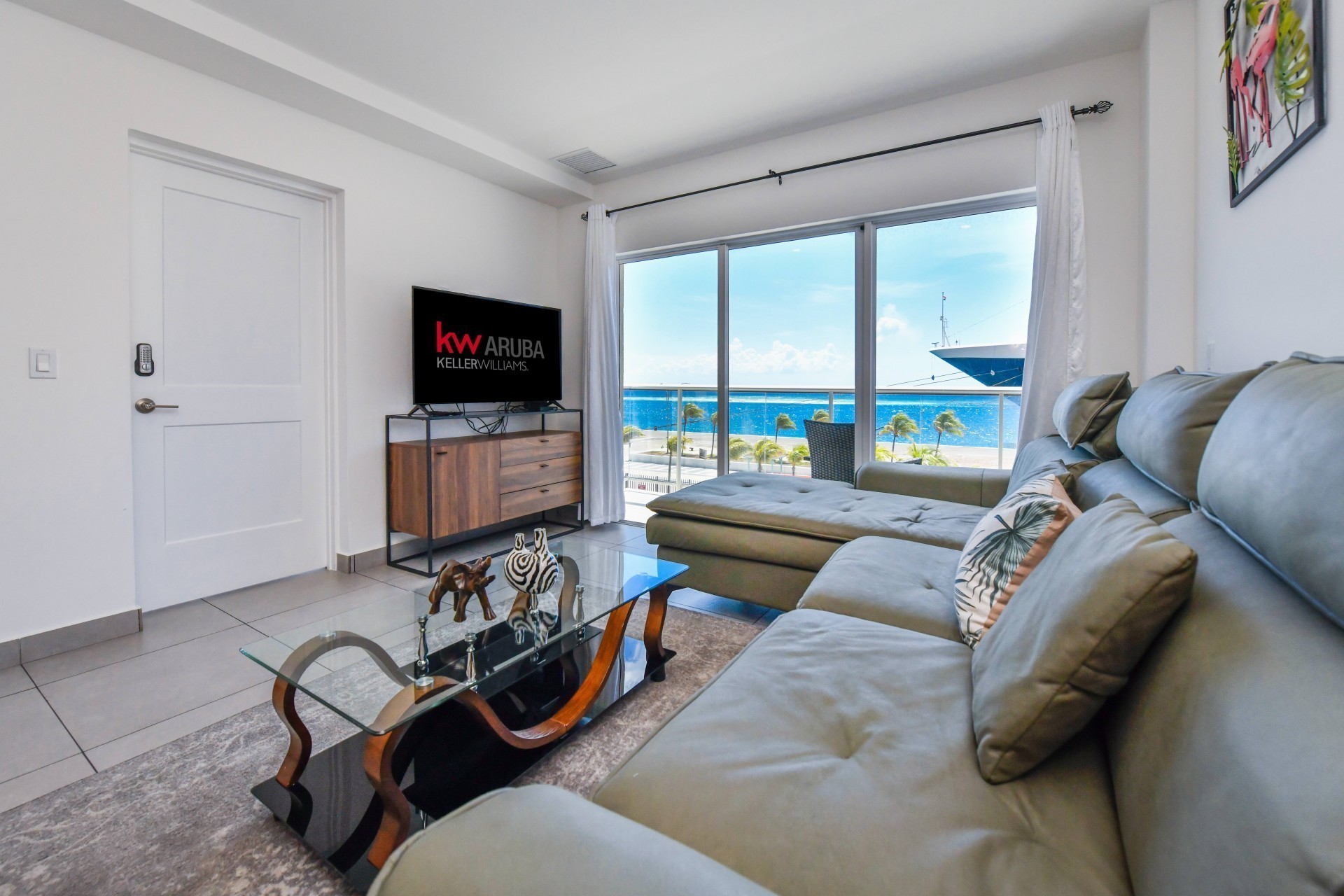 Inside, the open-concept design showcases breathtaking ocean views from floor-to-ceiling windows, filling the home with natural light and a refreshing sense of space. The kitchen is strategically positioned to subtly divide the dining and living areas, creating a natural flow throughout the residence. Seamless indoor-outdoor living is at the heart of the design, with sliding glass doors opening from the living room onto a spacious balcony—perfect for enjoying Aruba’s sunsets and ocean breeze.