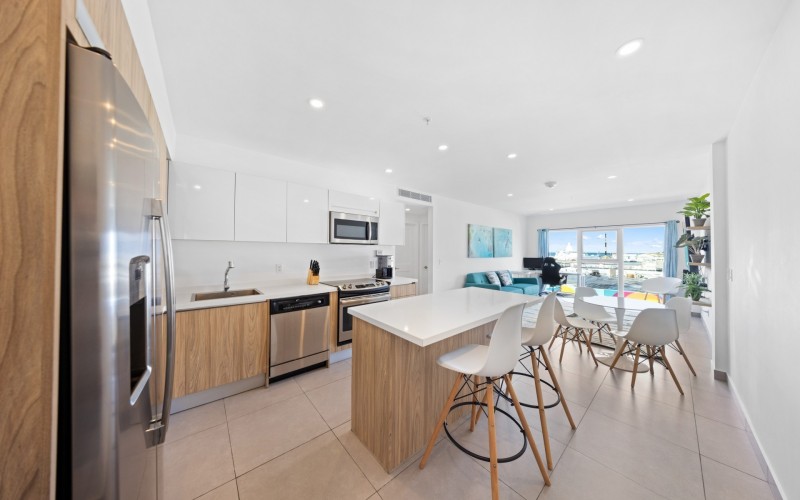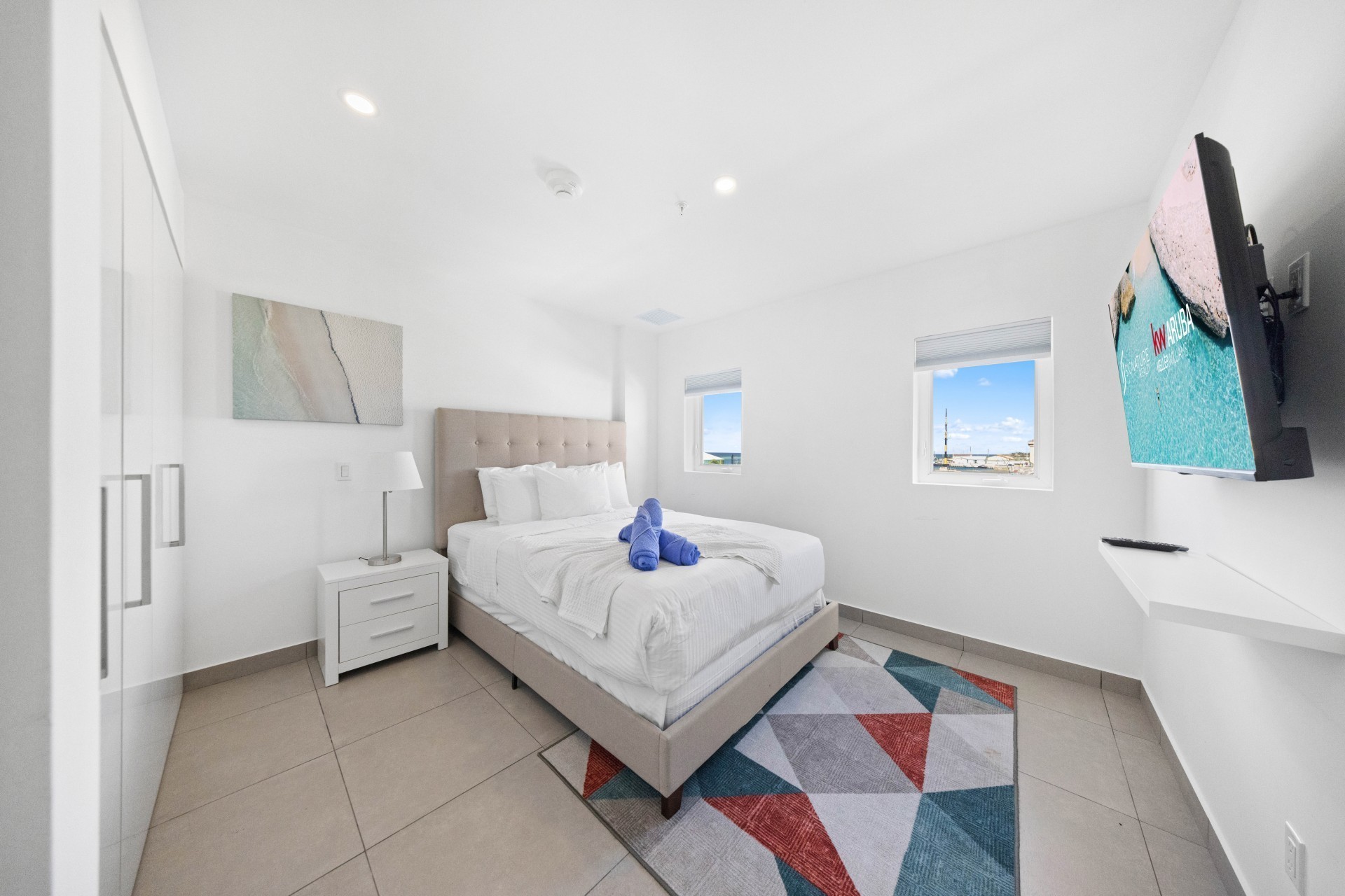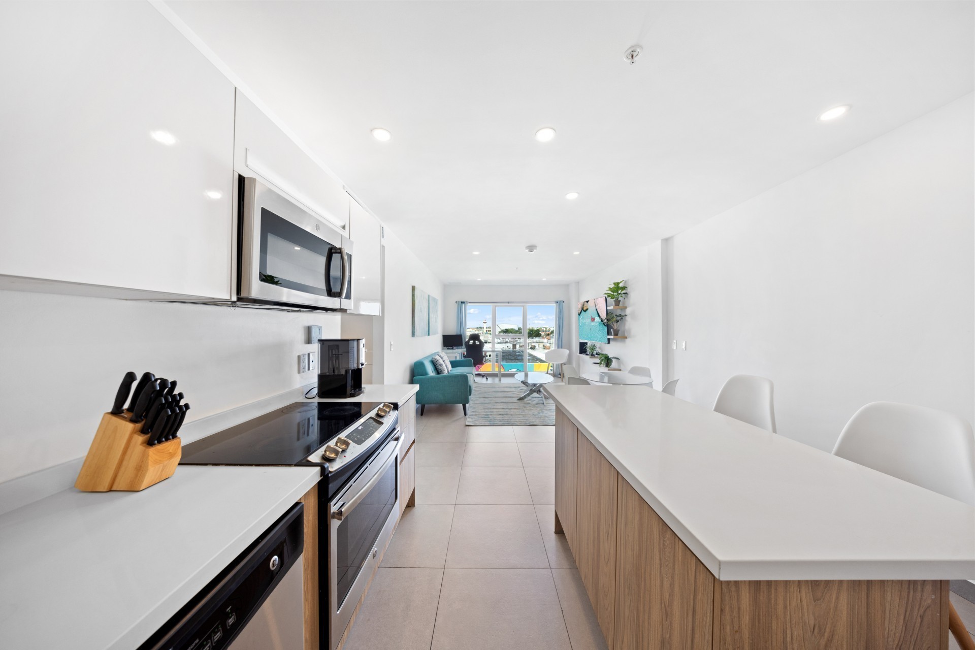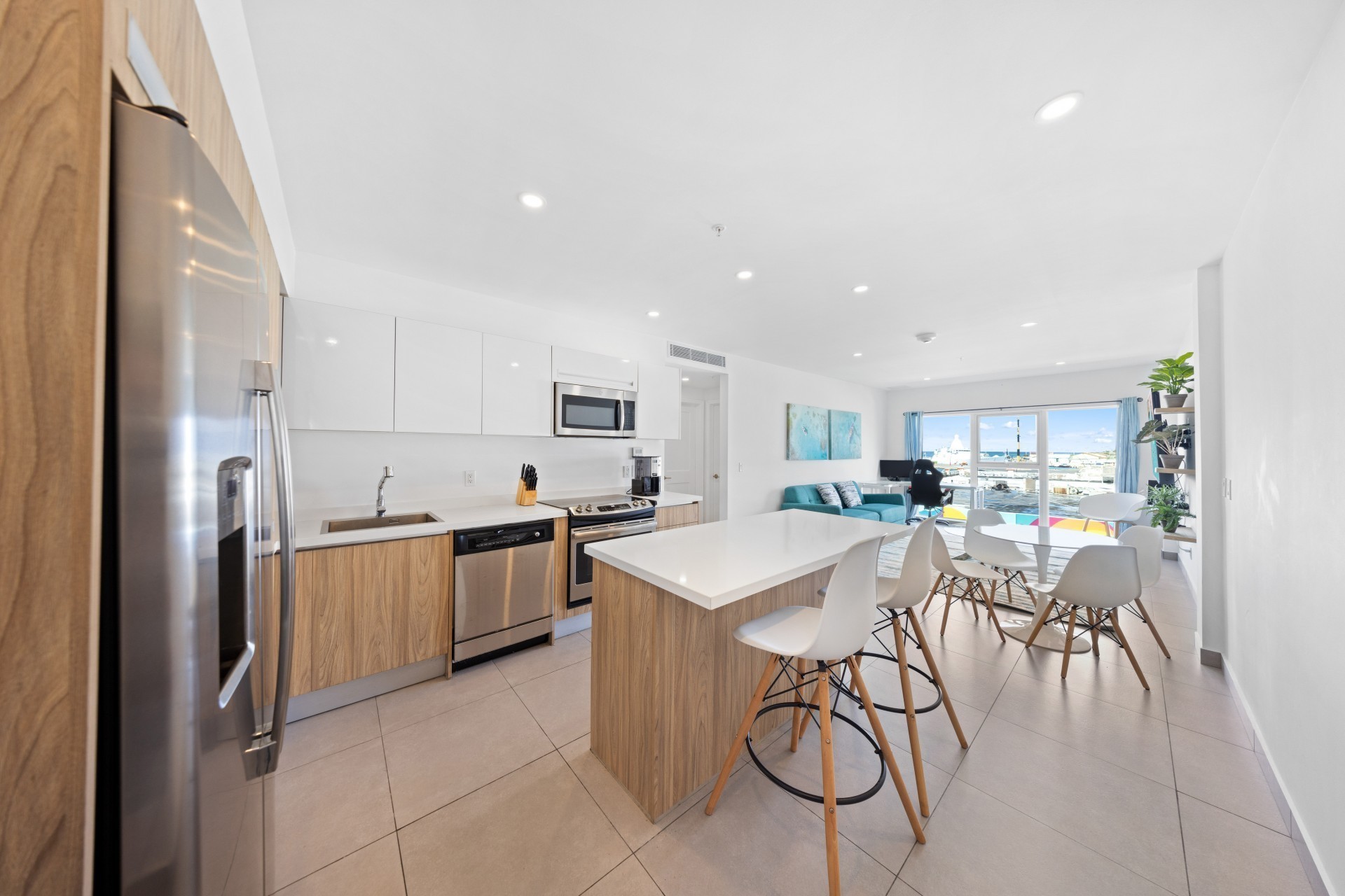 Inside, the condo welcomes you with an open layout where your eyes are immediately drawn through the large windows to views of the harbor and ocean. The kitchen is fully equipped, complete with a sleek island and seating, while a washer and dryer are neatly tucked away for convenience. The living area is perfectly sized for a vacation retreat—cozy, stylish, and functional.