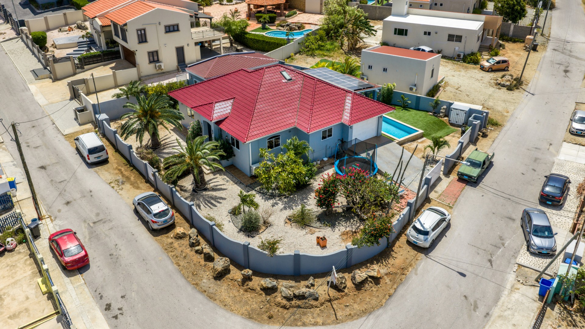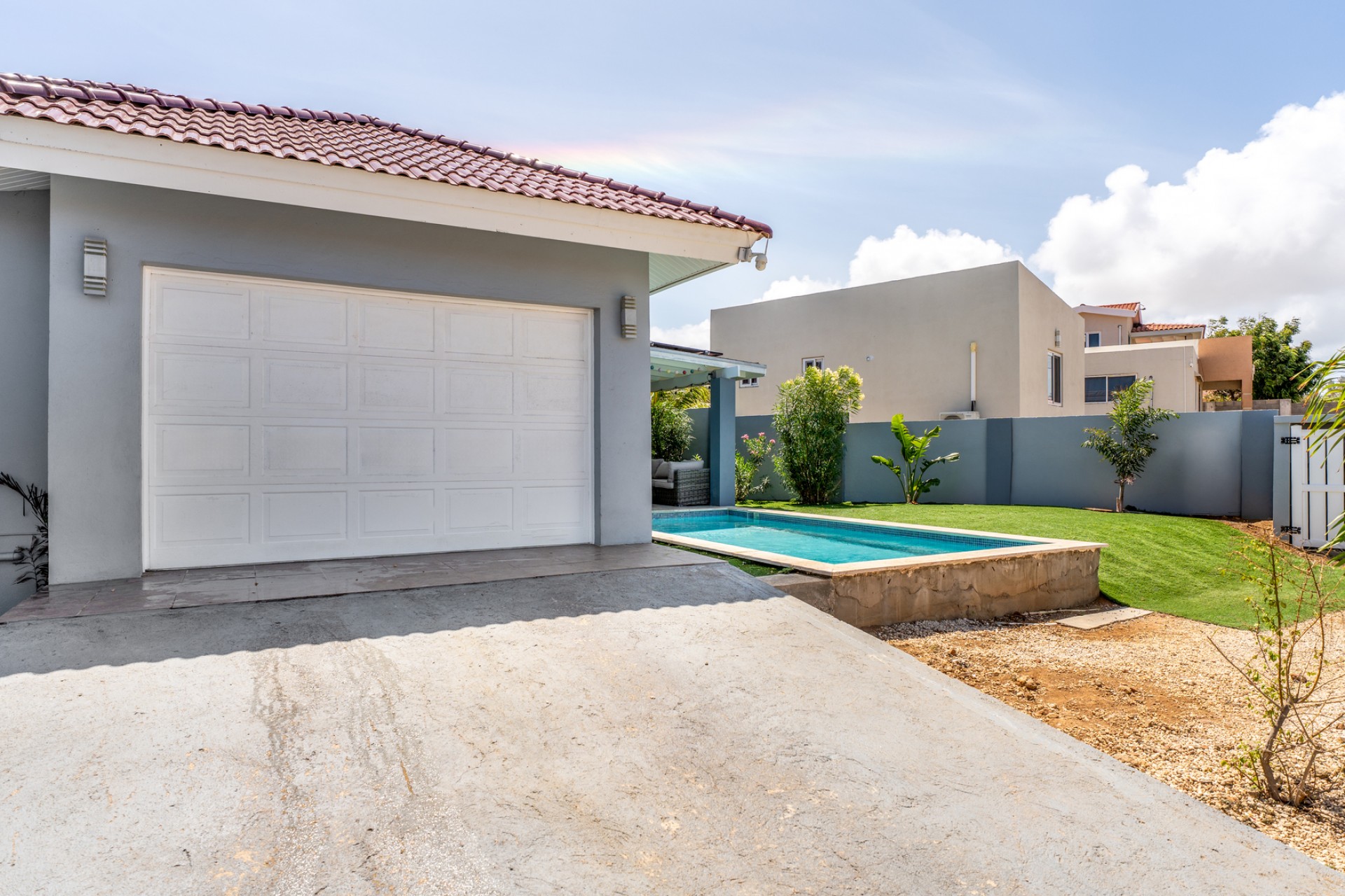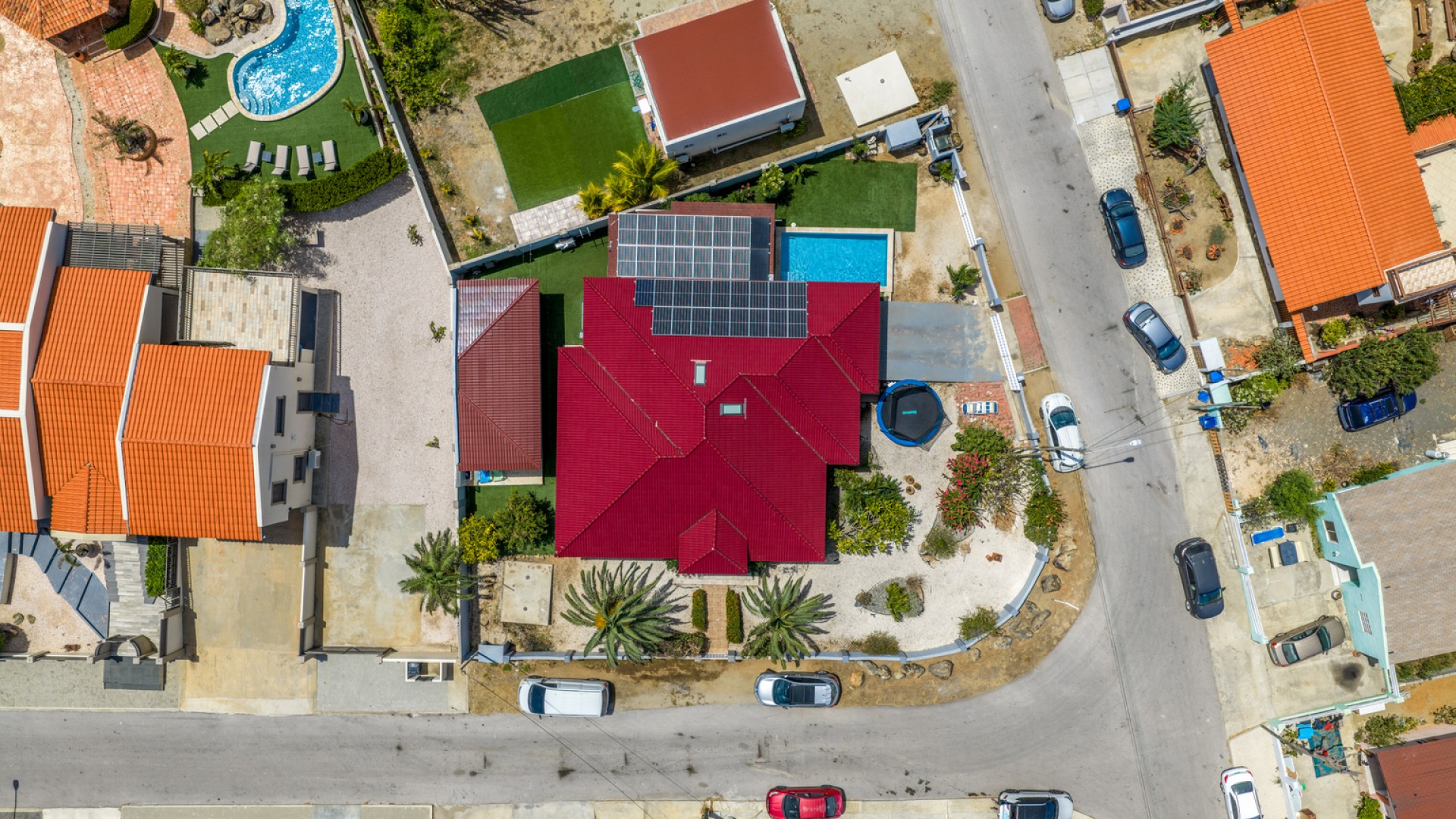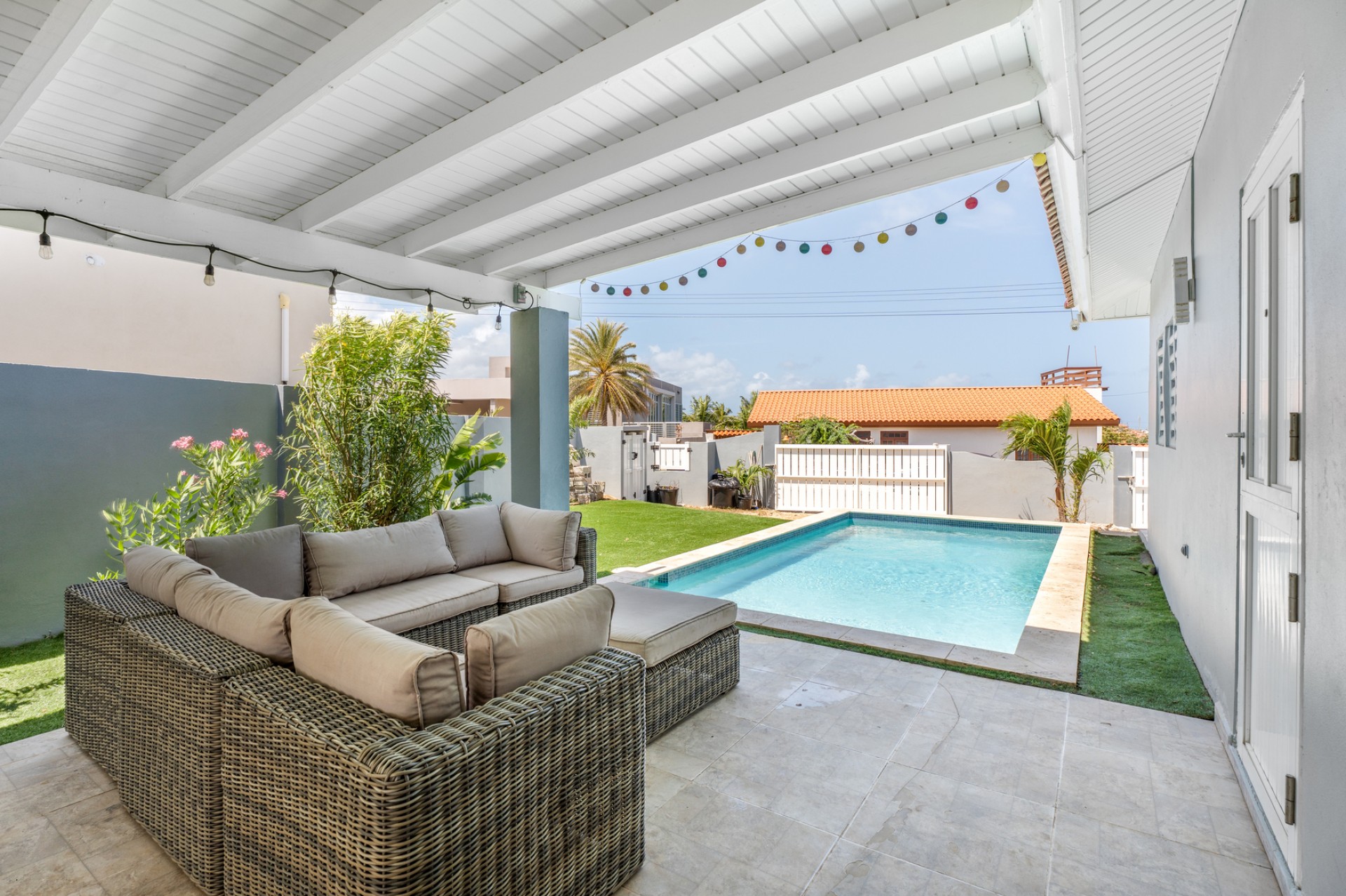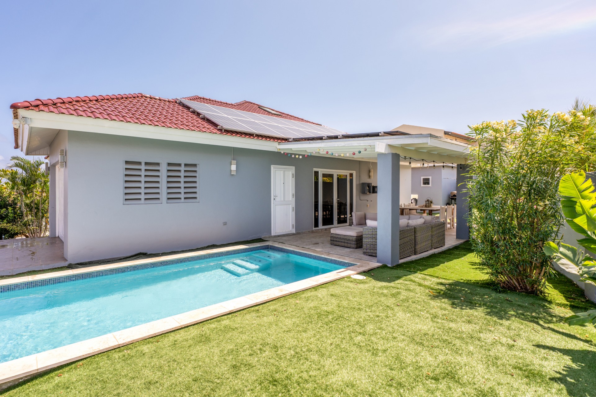The outdoor area already includes a private pool, creating the perfect base for a tropical backyard where indoor and outdoor living can seamlessly come together. The property is also equipped with solar panels, enhancing energy efficiency and long-term sustainability.