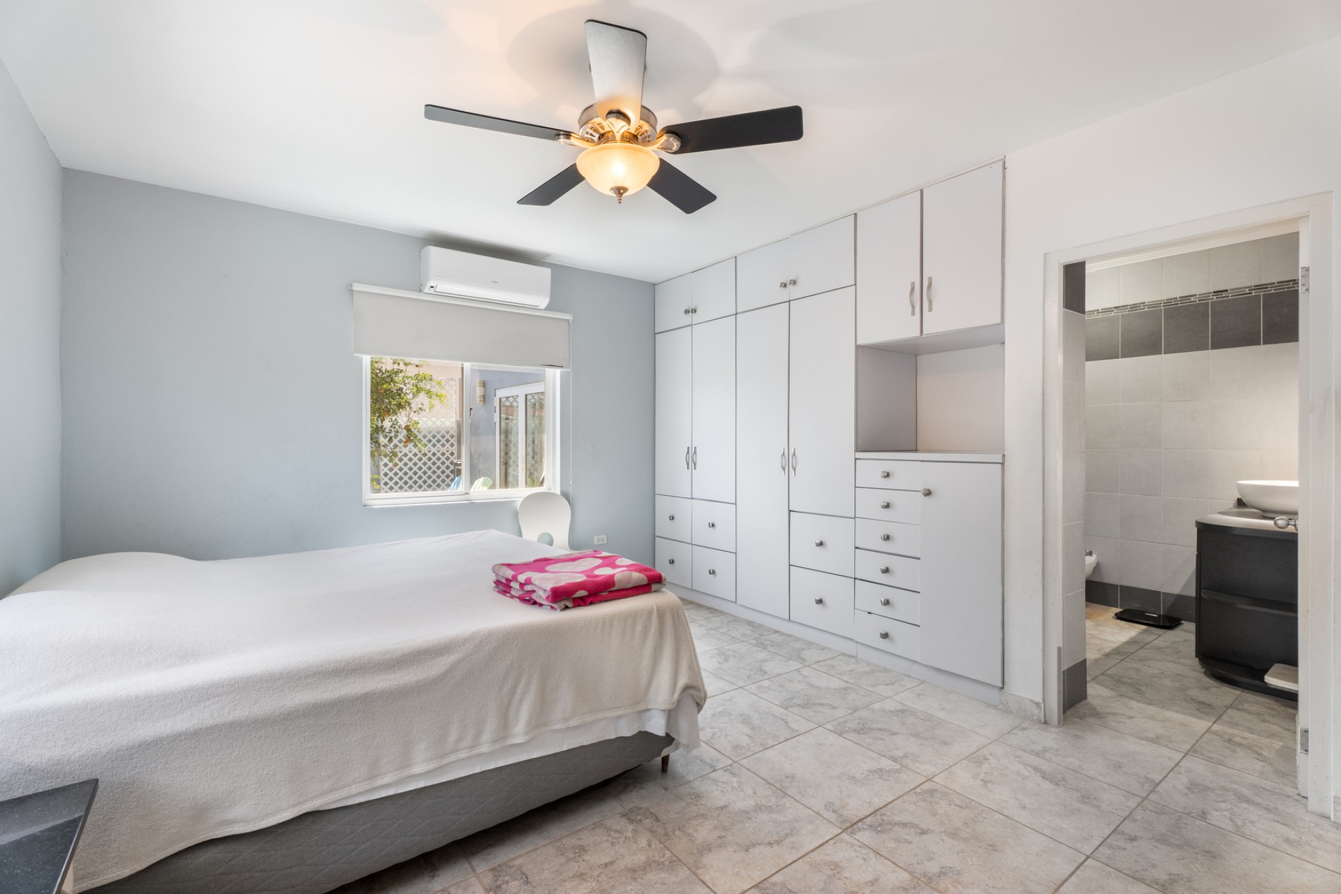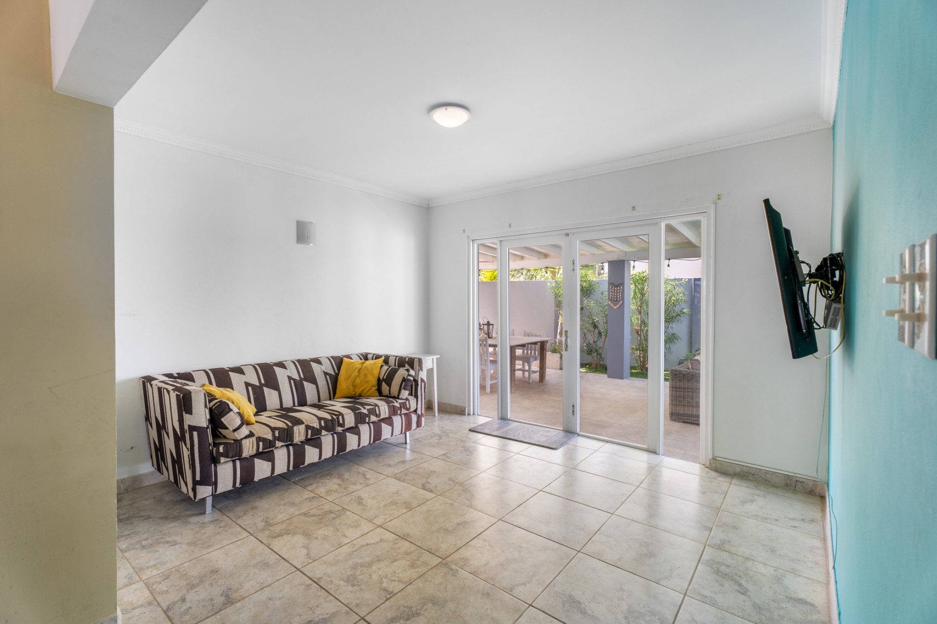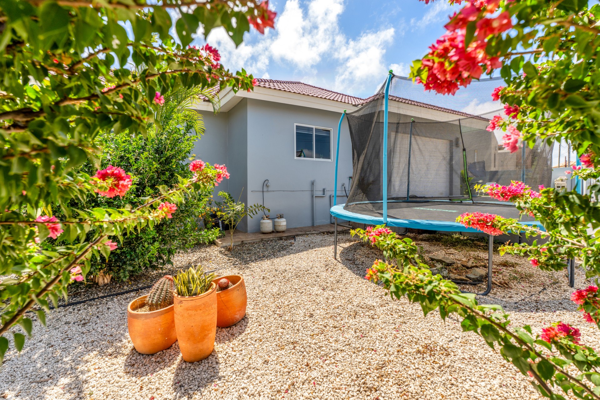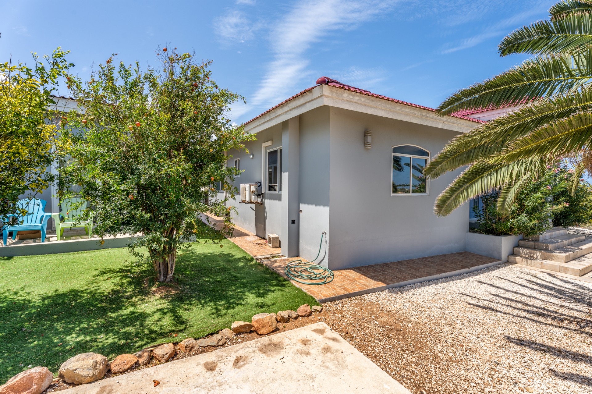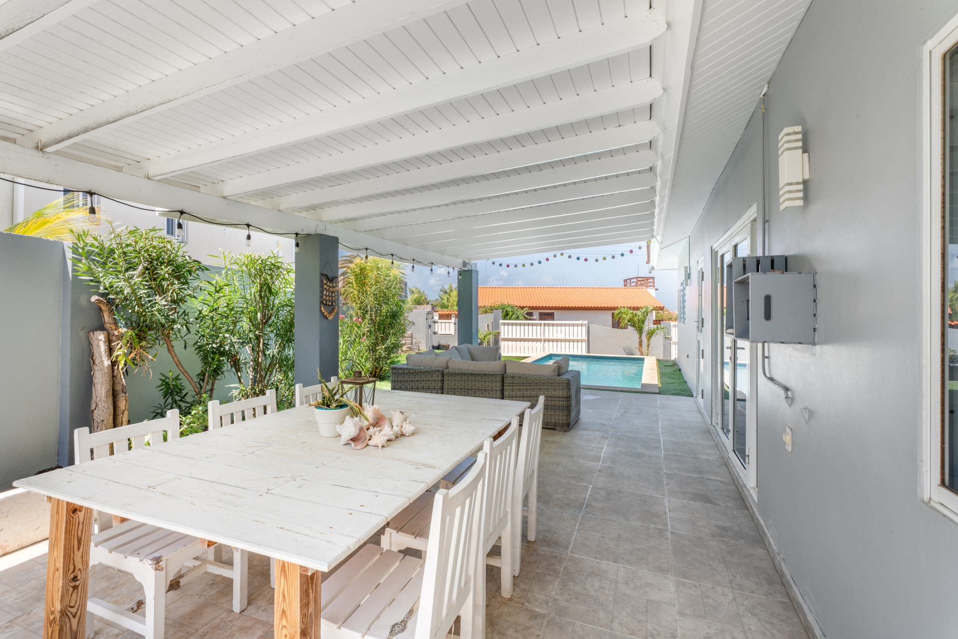 The outdoor area already includes a private pool, creating the perfect base for a tropical backyard where indoor and outdoor living can seamlessly come together. The property is also equipped with solar panels, enhancing energy efficiency and long-term sustainability.