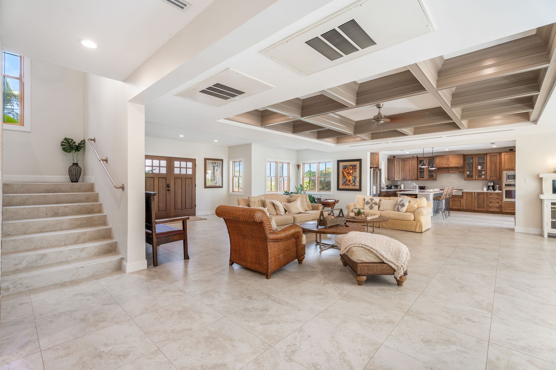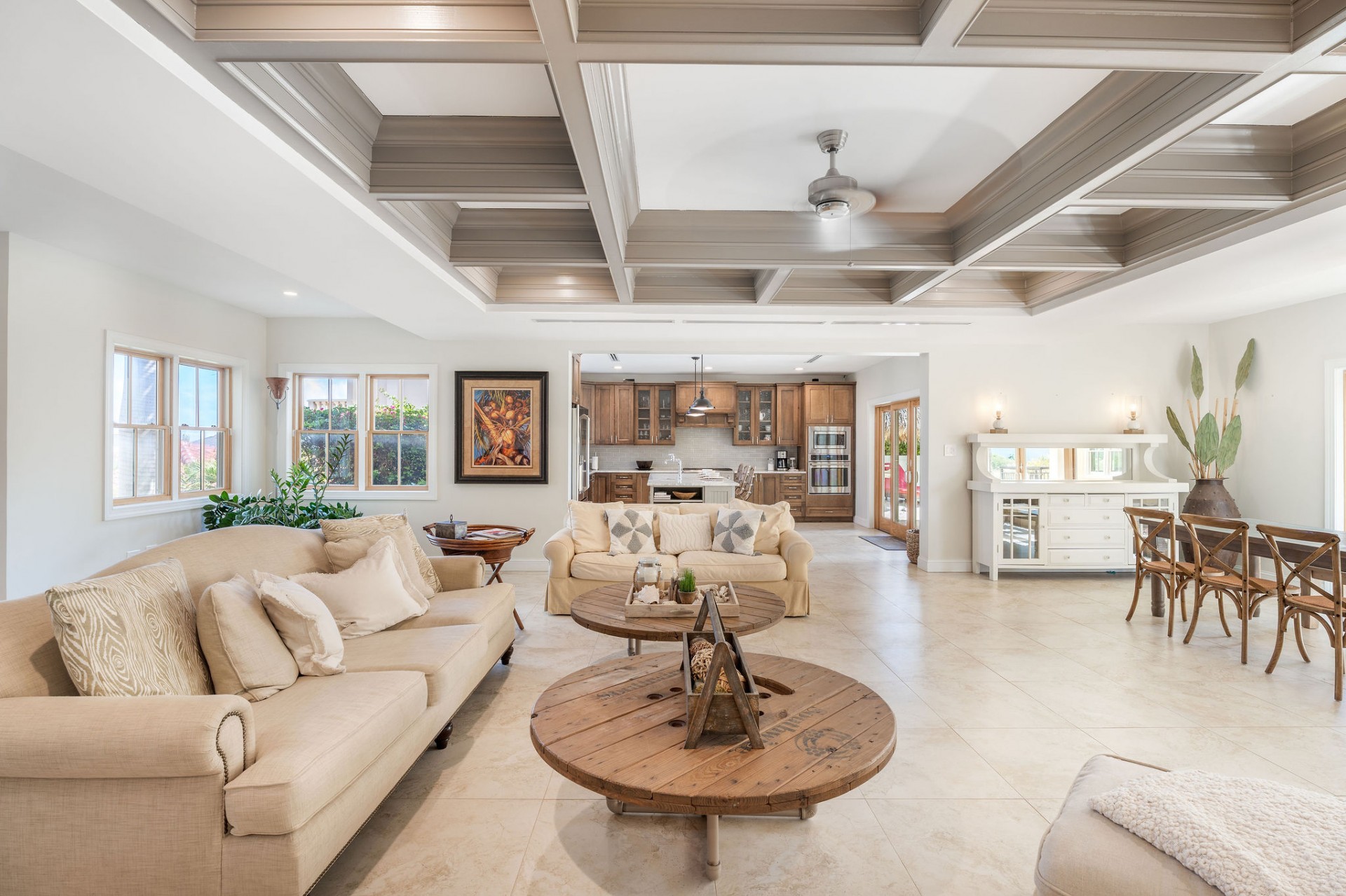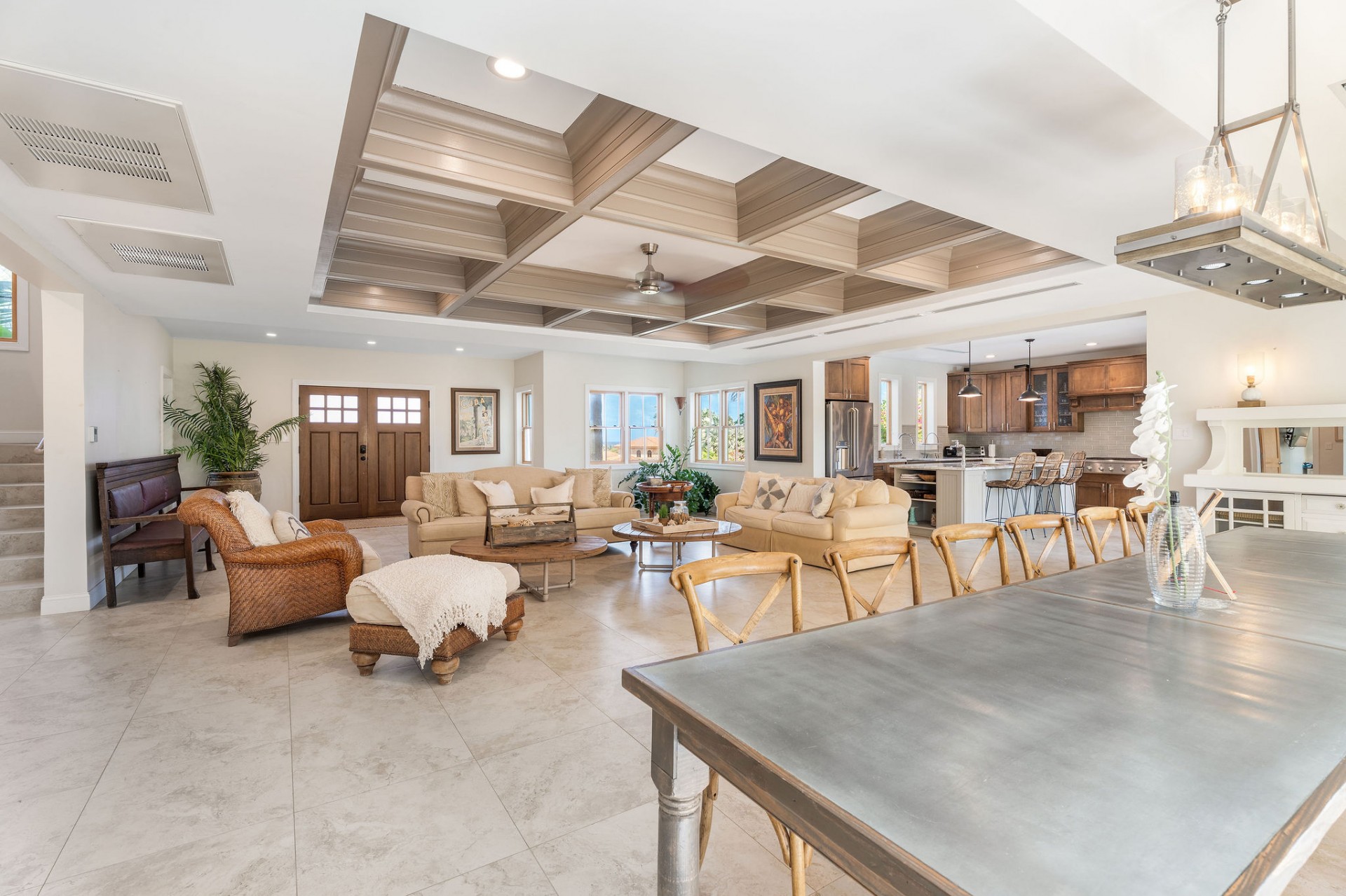 Stunning open-plan living, dining & kitchen with architectural ceiling