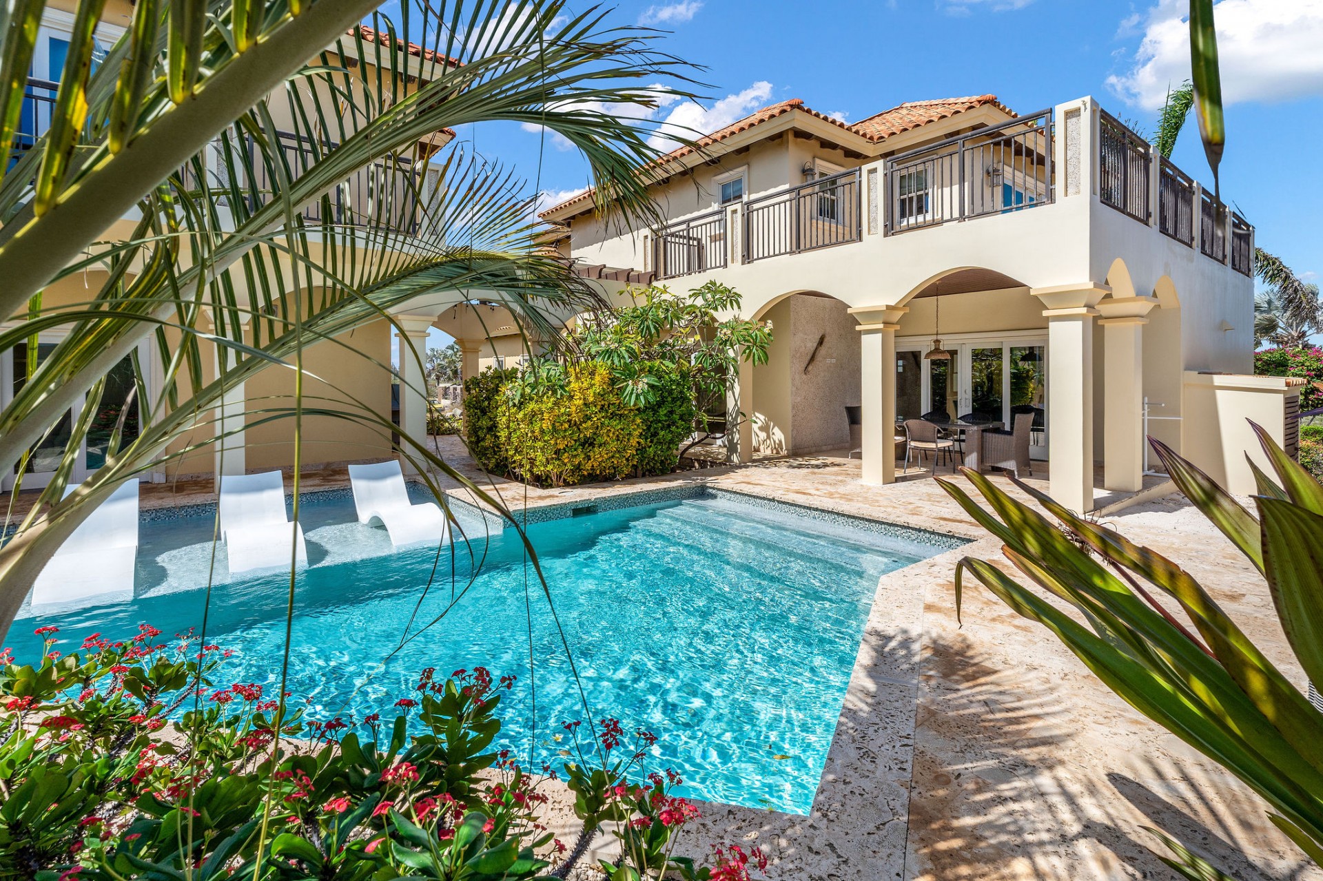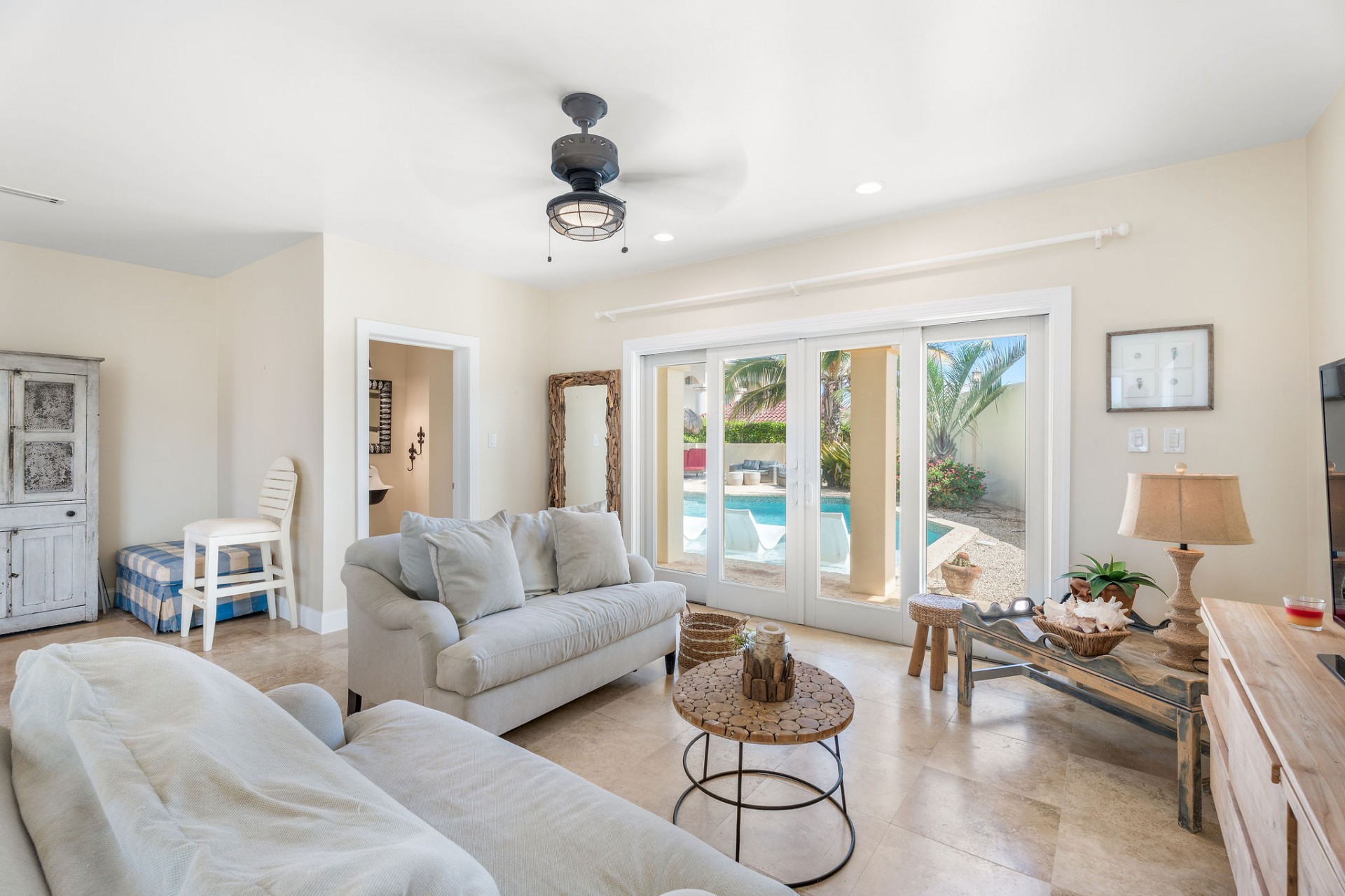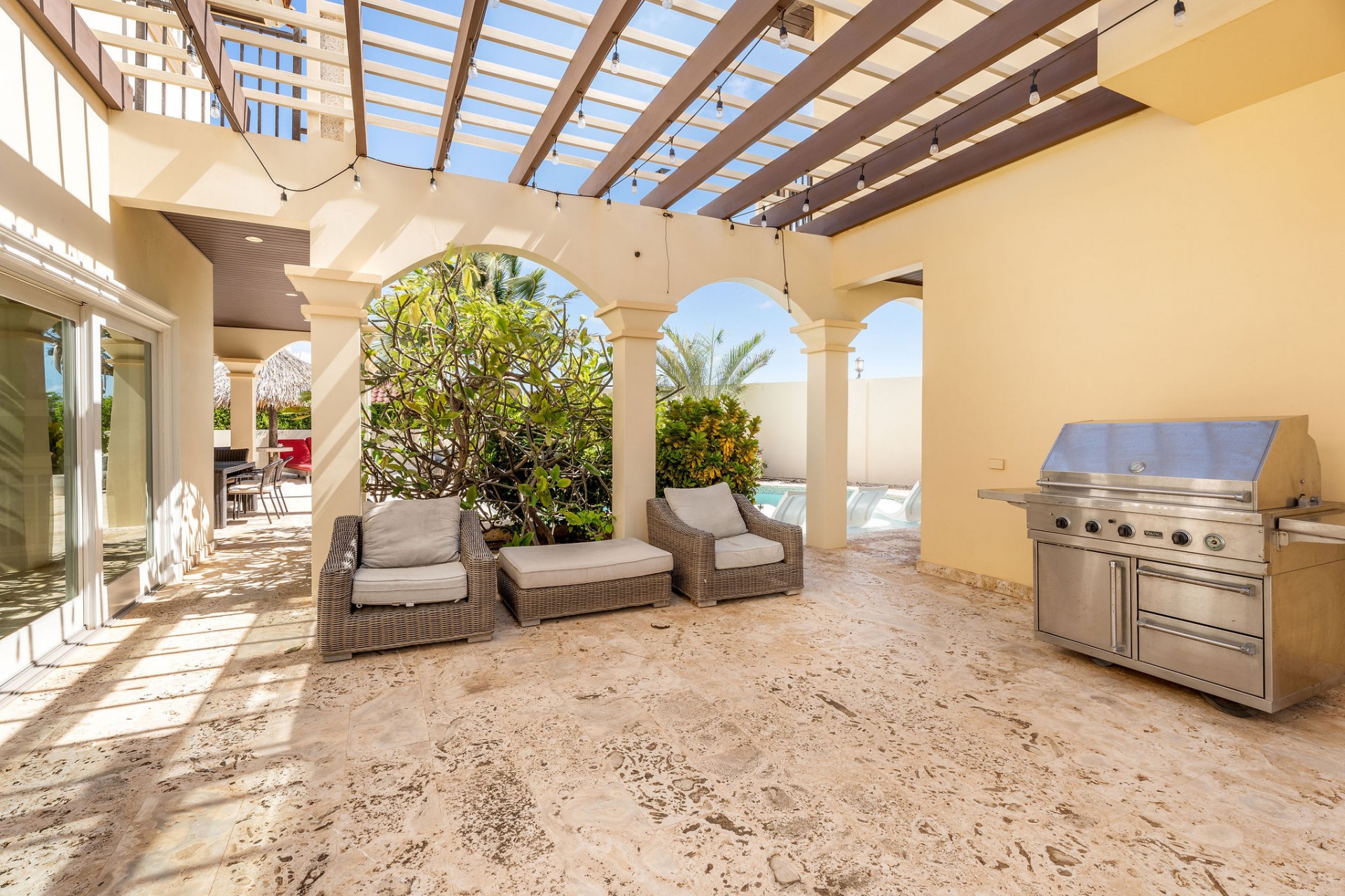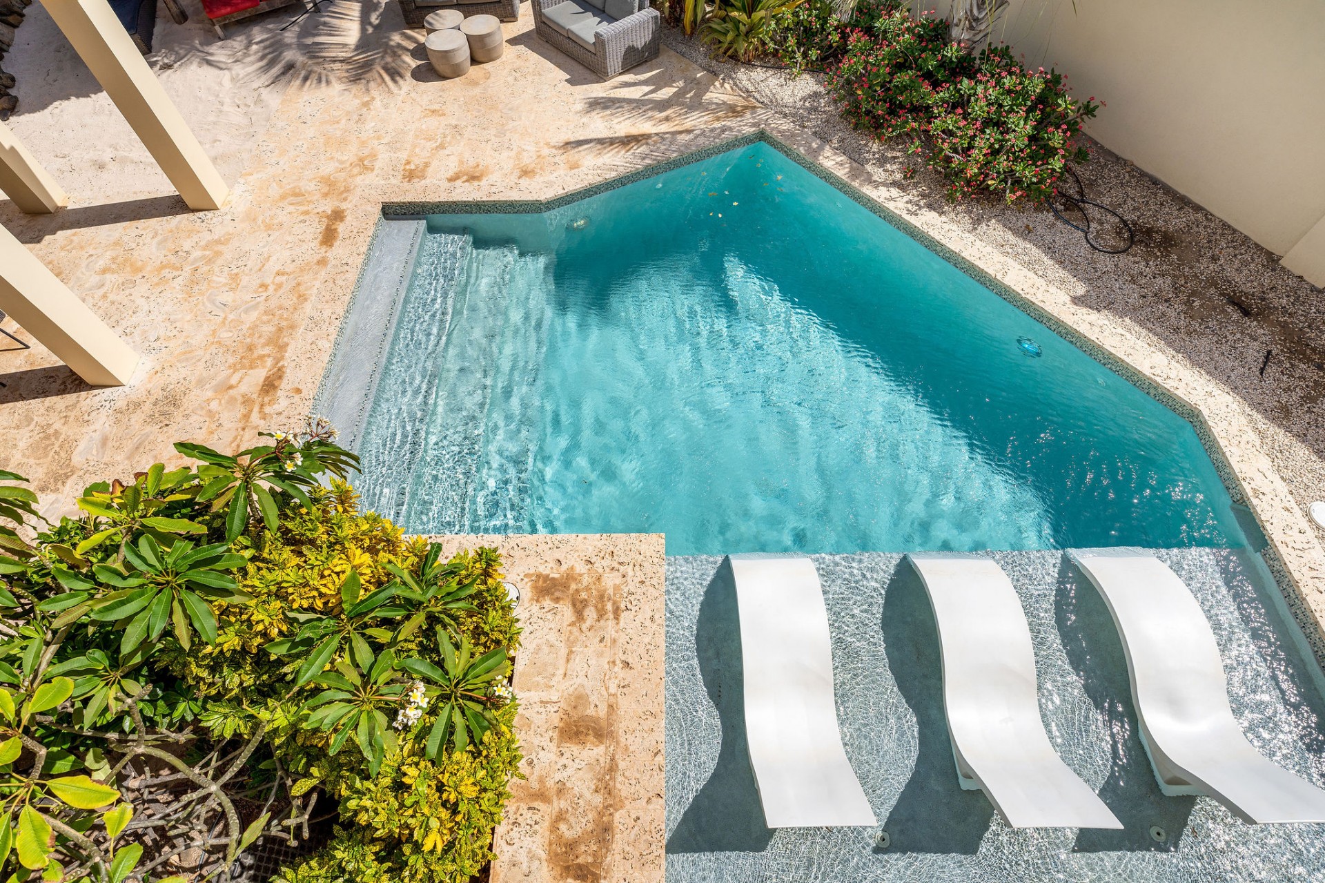 Seamless indoor–outdoor living with private beach-style lounging area
