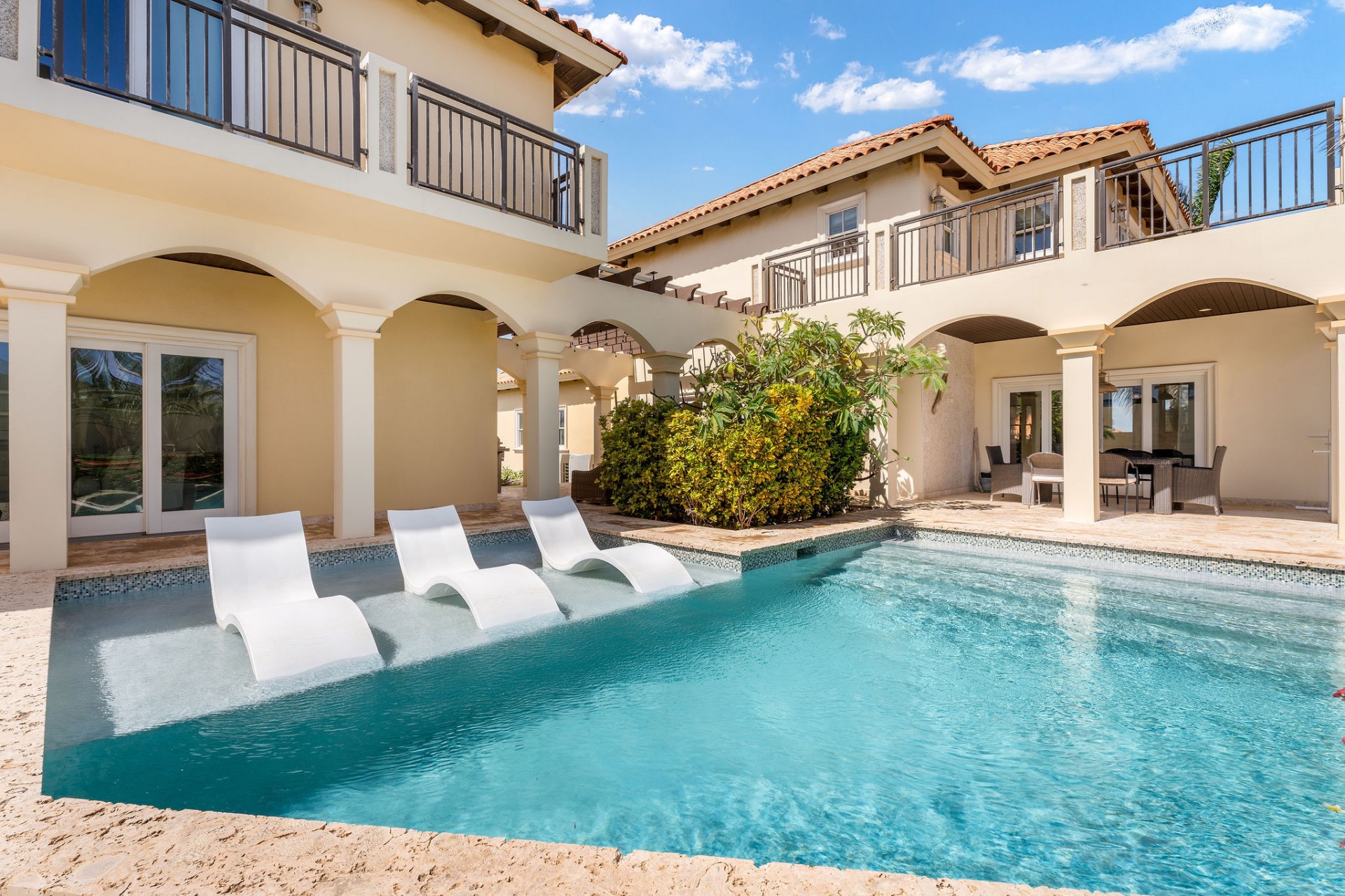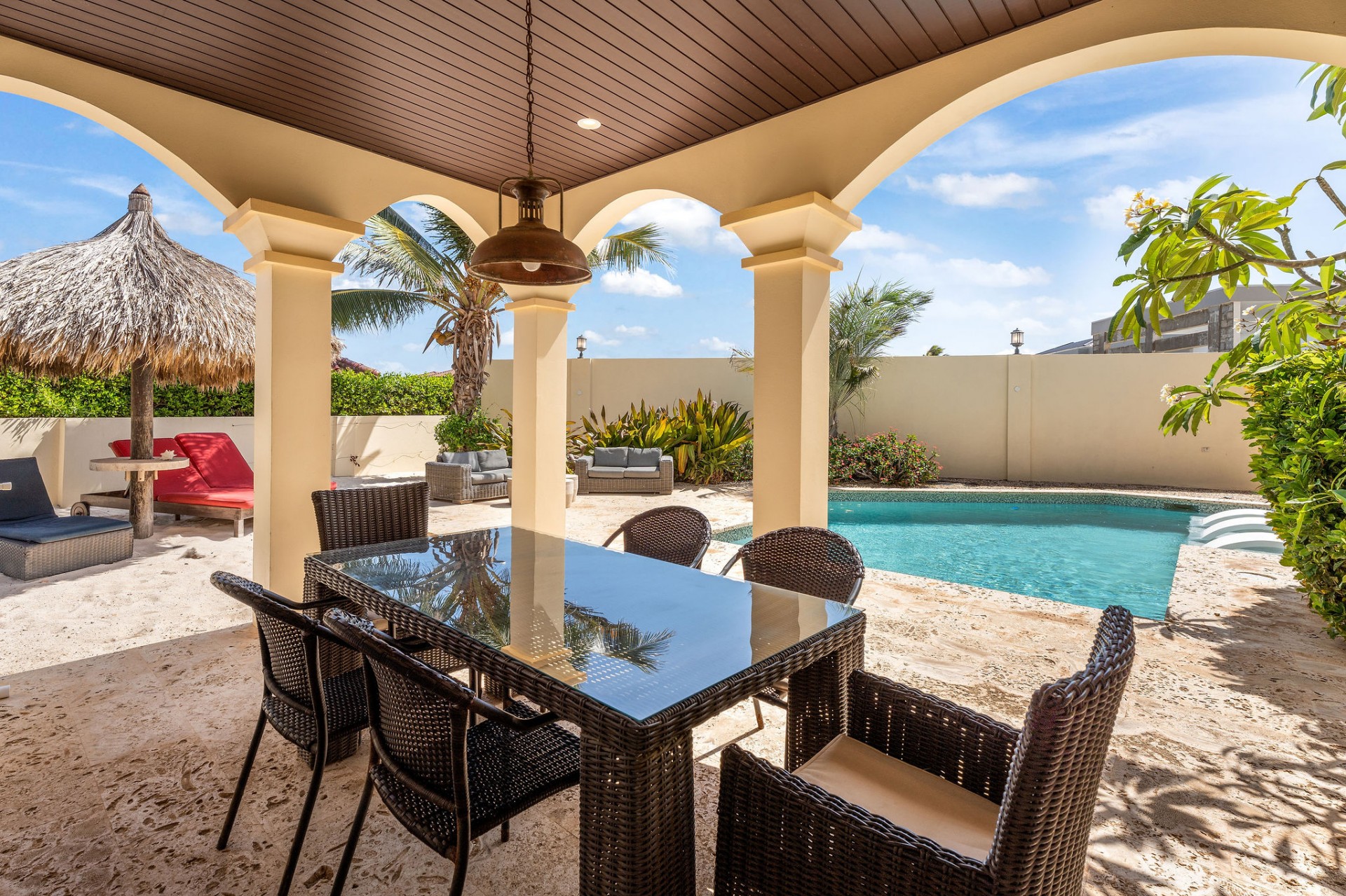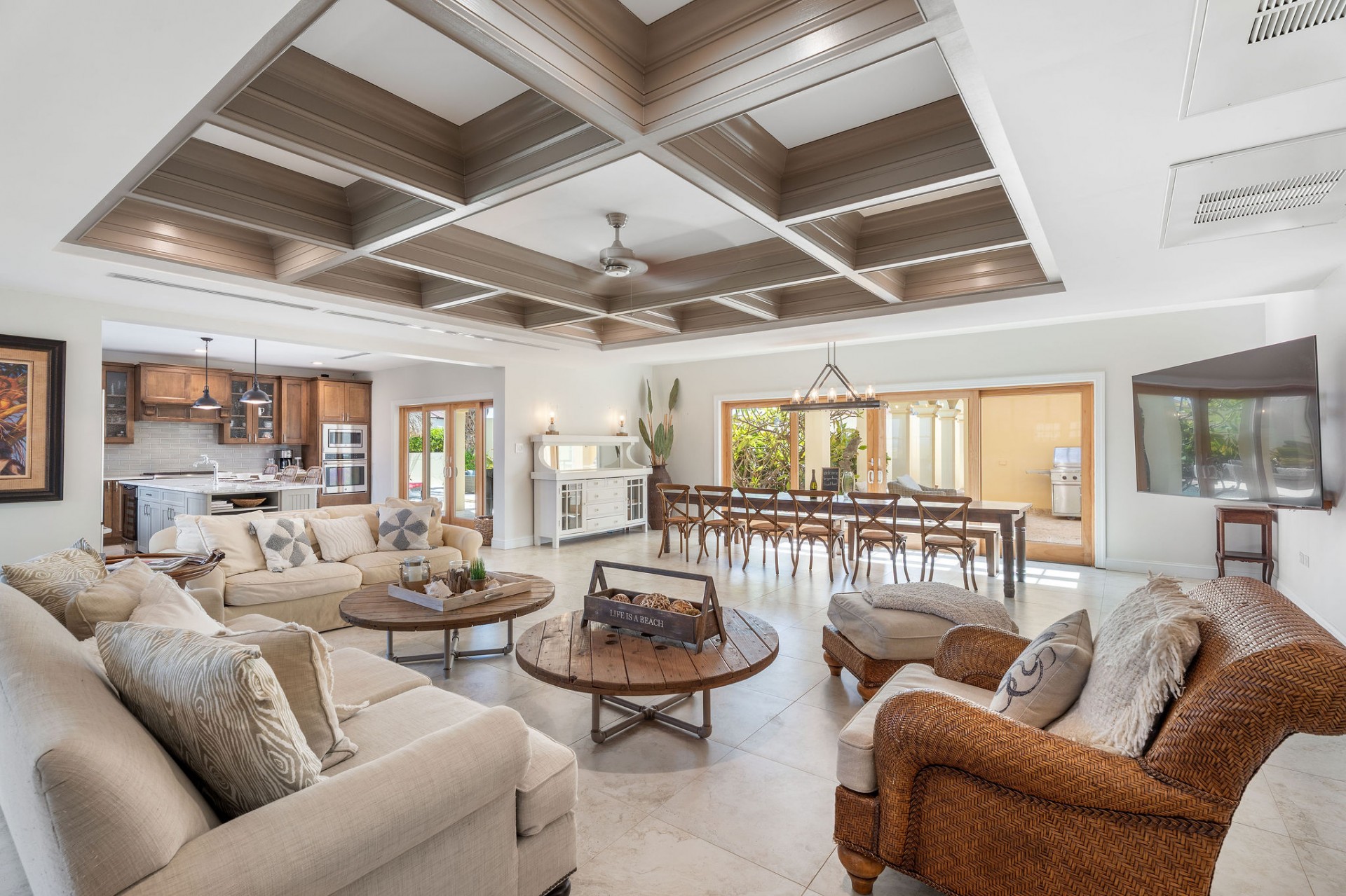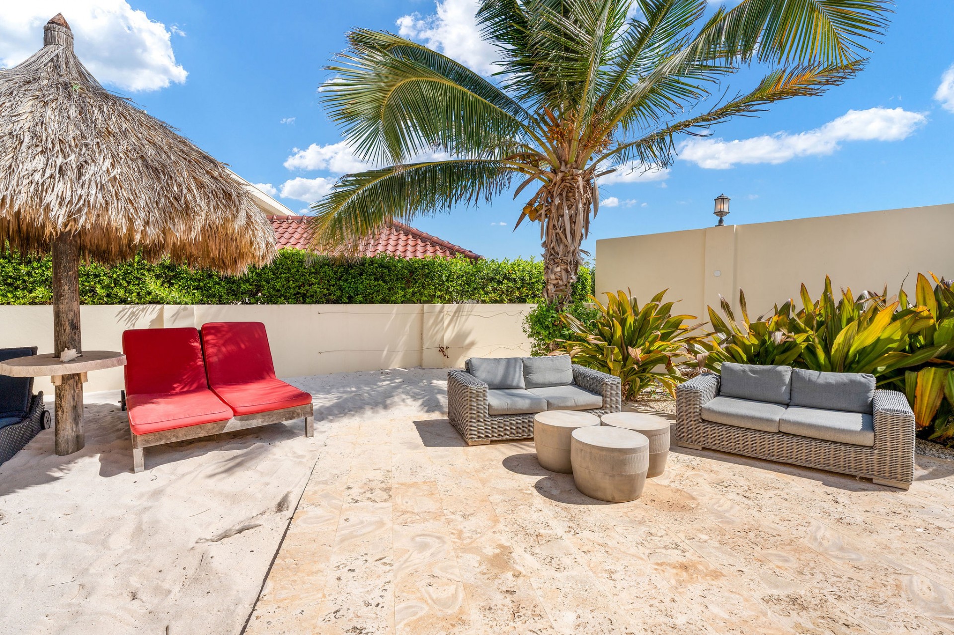 Seamless indoor–outdoor living with private beach-style lounging area