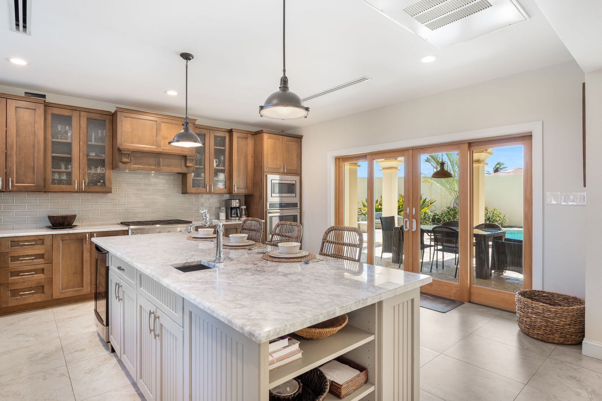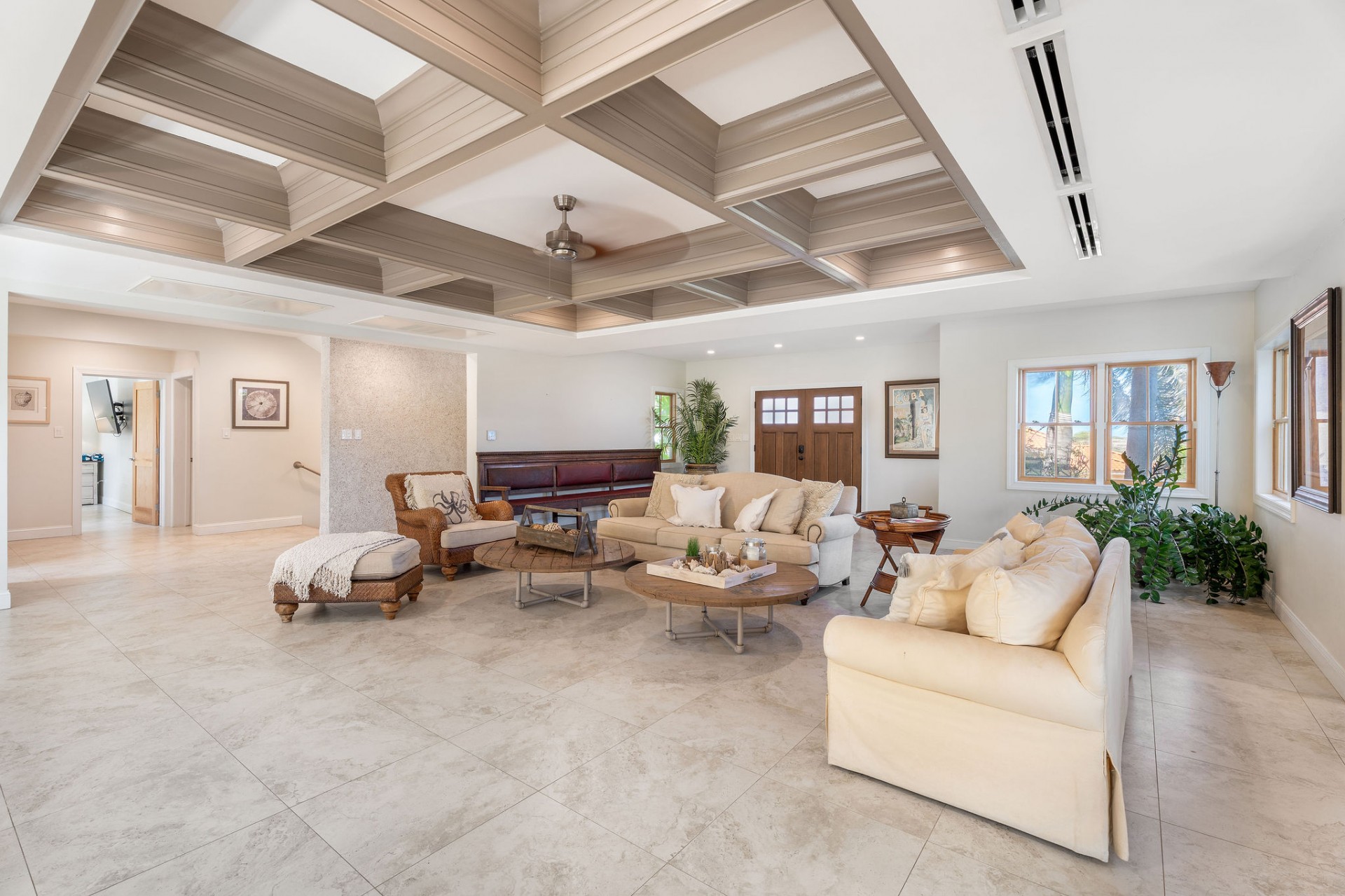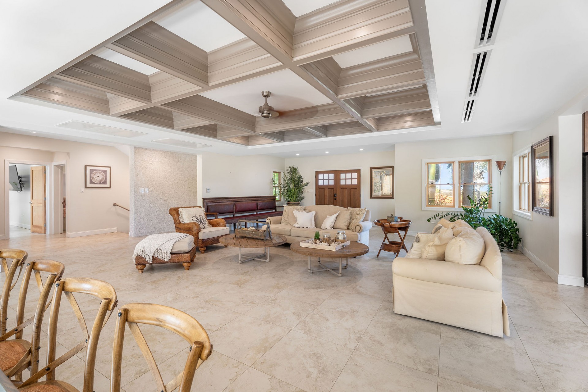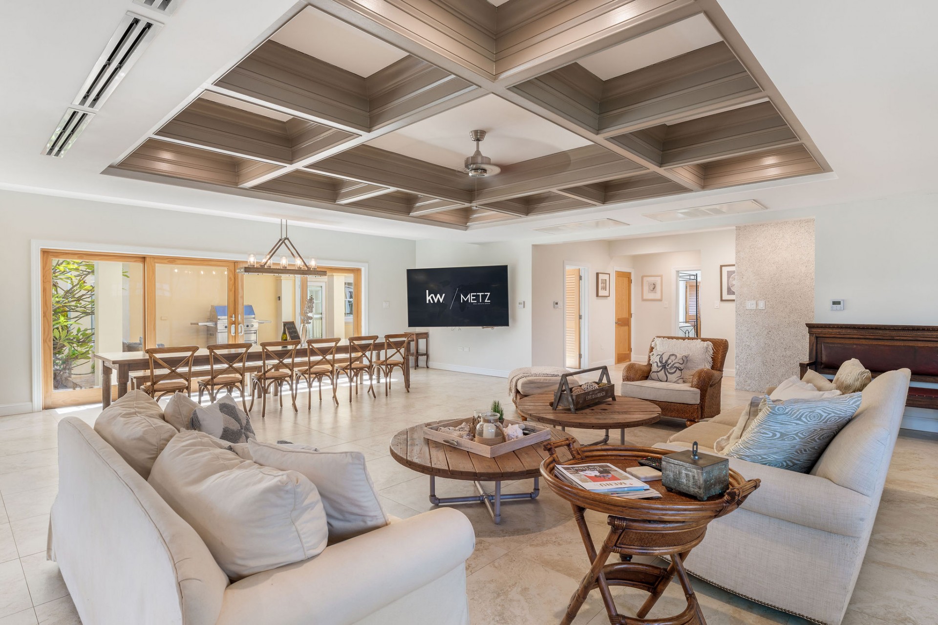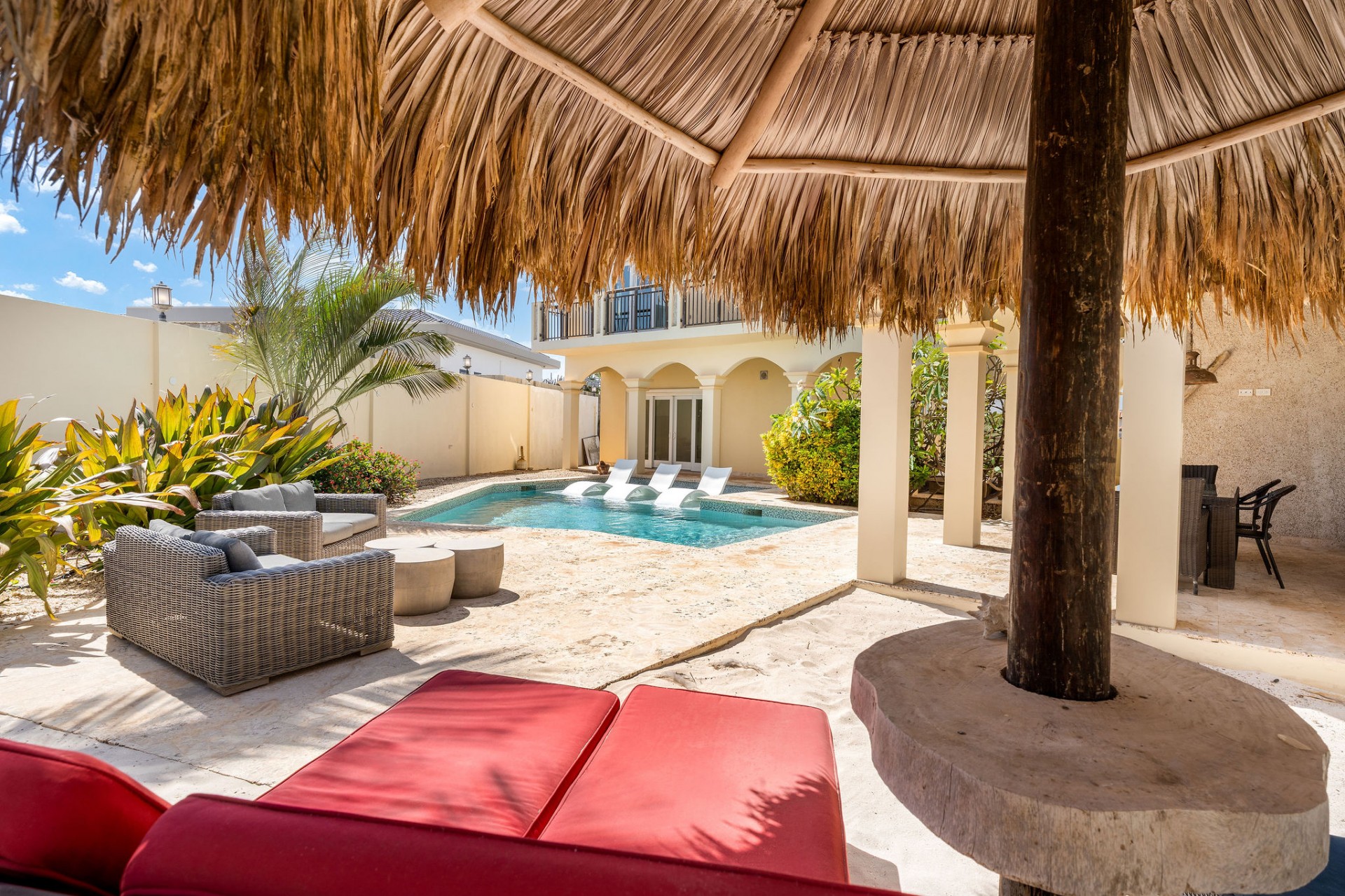 Seamless indoor–outdoor living with private beach-style lounging area