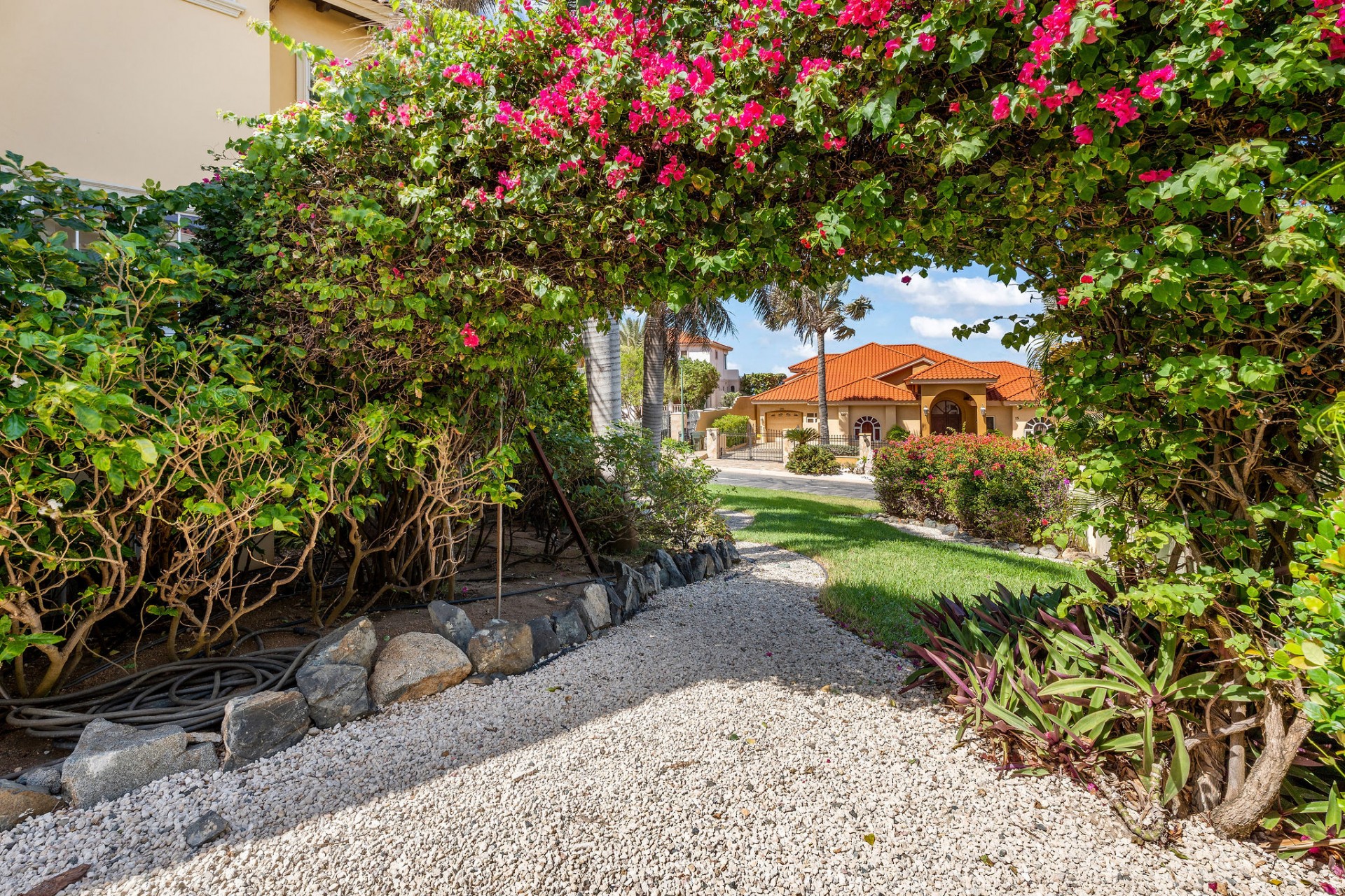 Surrounded by lush tropical landscaping and mature palm trees, the garden creates a serene and private oasis, perfectly complementing the elegant architecture of the home. Residents of Tierra del Sol enjoy access to a championship 18-hole golf course, a luxury clubhouse, fitness center, and spa, all within a secure, gated community known for its exclusivity, tranquility, and high-end lifestyle.