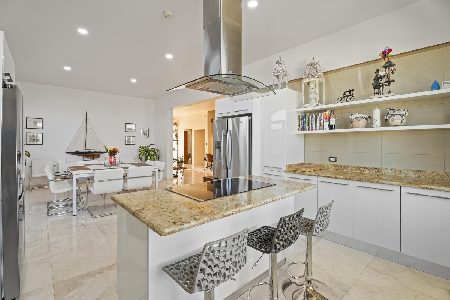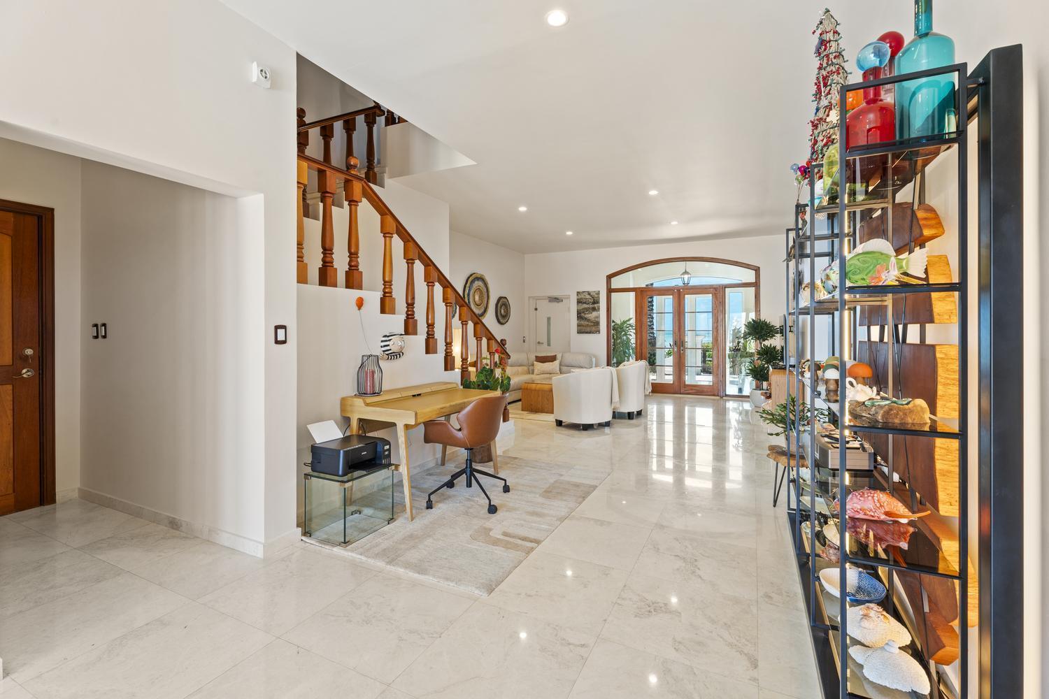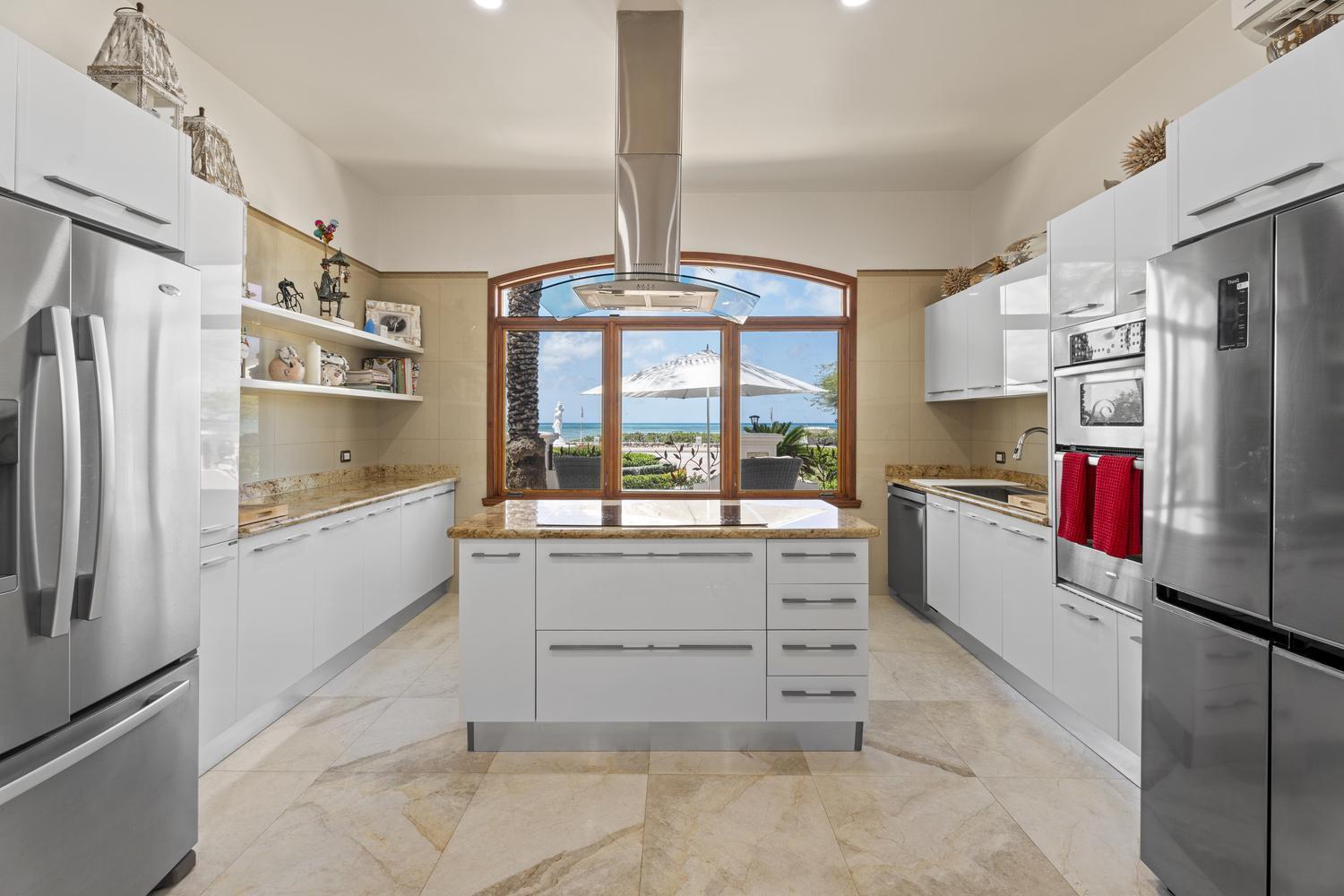 Fully renovated, fully furnished, and move-in ready, this estate combines timeless design with modern sophistication. From the elegant circular driveway, double front doors open into a spacious living area where the open design seamlessly connects to the backyard, creating an immediate sense of light and flow. A semi-open layout flows seamlessly into the fully equipped chef’s kitchen with a grand island – offering panoramic sea views that make cooking a true experience.