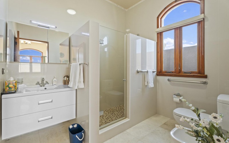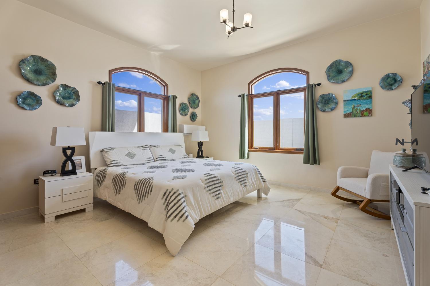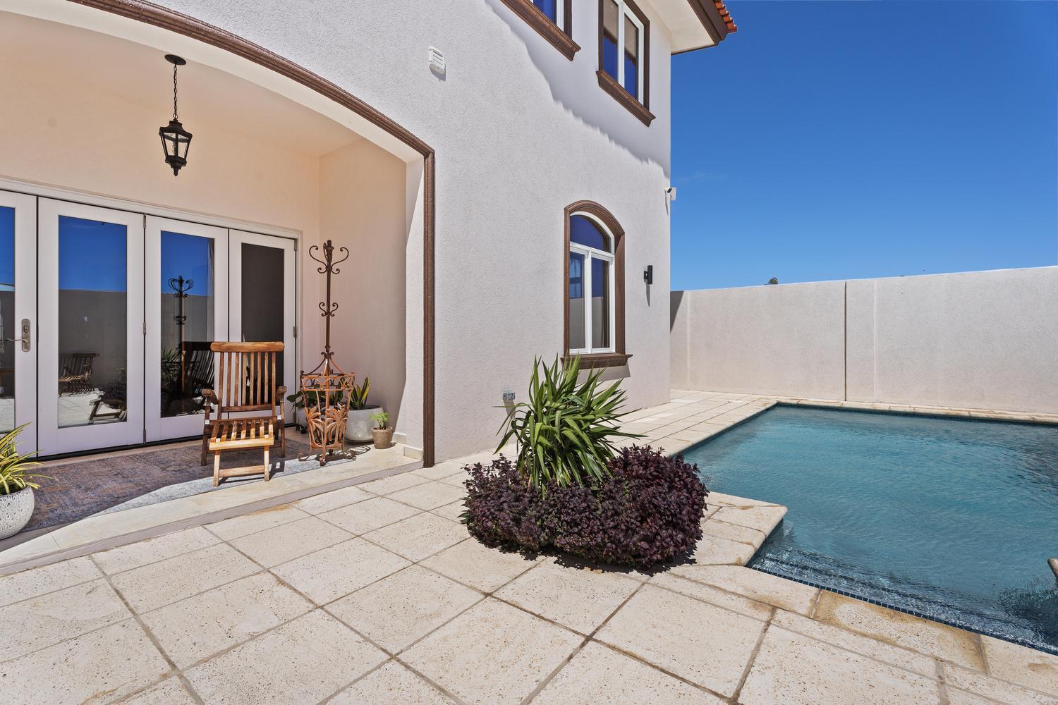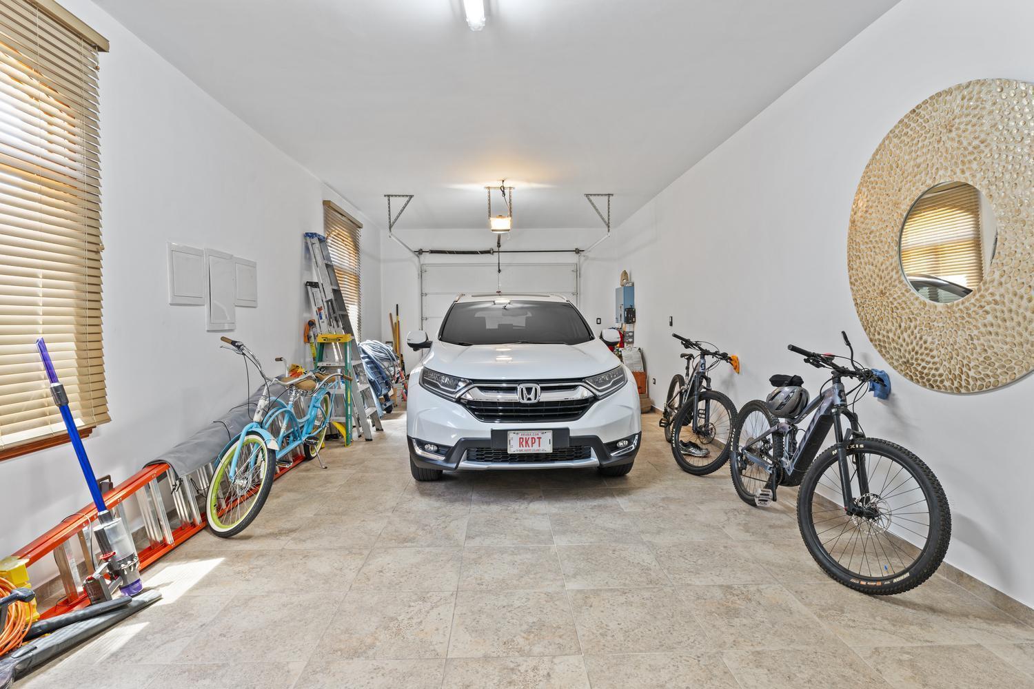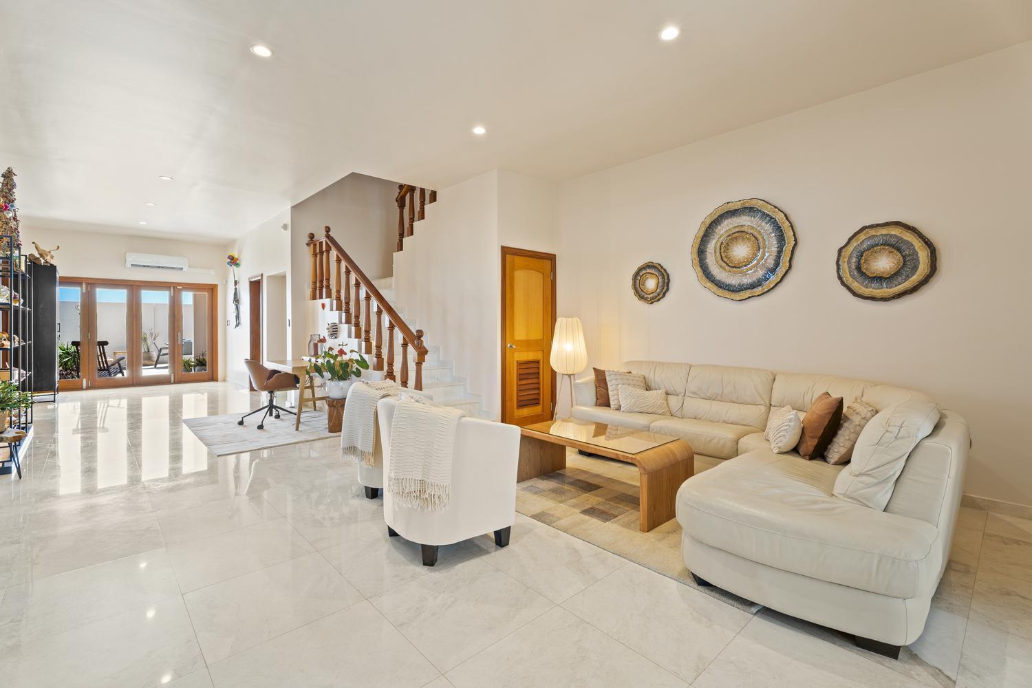 The villa offers 5 bedrooms and 4.5 bathrooms across two levels. On the ground floor, two bright and spacious bedrooms each feature their own ensuite bathroom, providing comfort and privacy. A stylish powder room and an attached two-car garage with direct access to a dedicated laundry room complete this level.