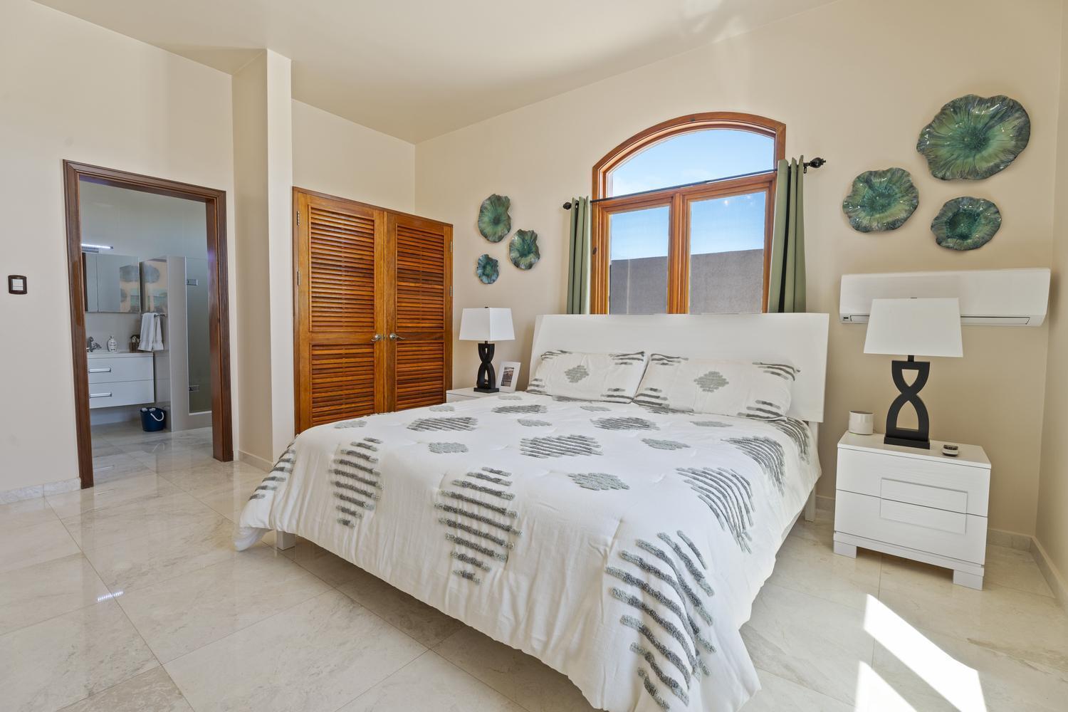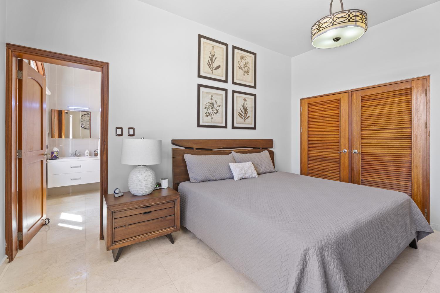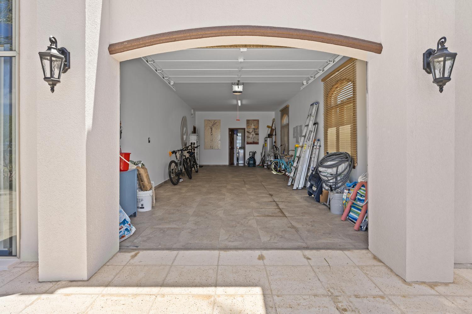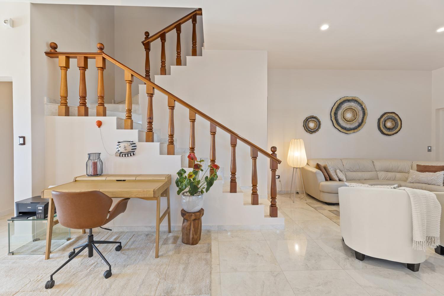 The villa offers 5 bedrooms and 4.5 bathrooms across two levels. On the ground floor, two bright and spacious bedrooms each feature their own ensuite bathroom, providing comfort and privacy. A stylish powder room and an attached two-car garage with direct access to a dedicated laundry room complete this level.