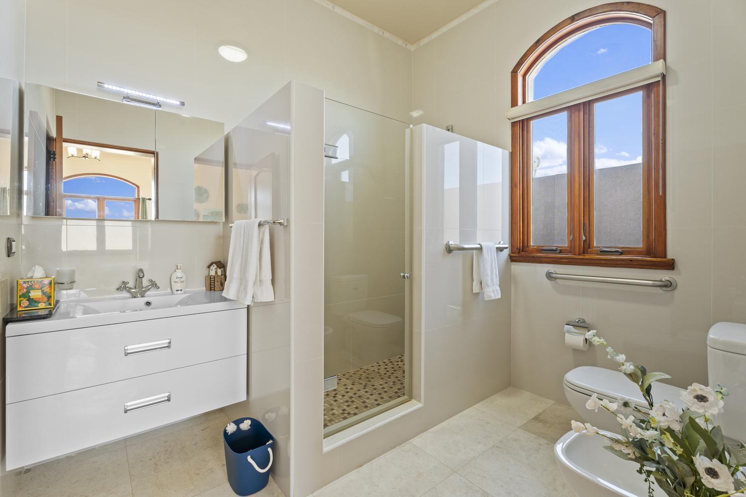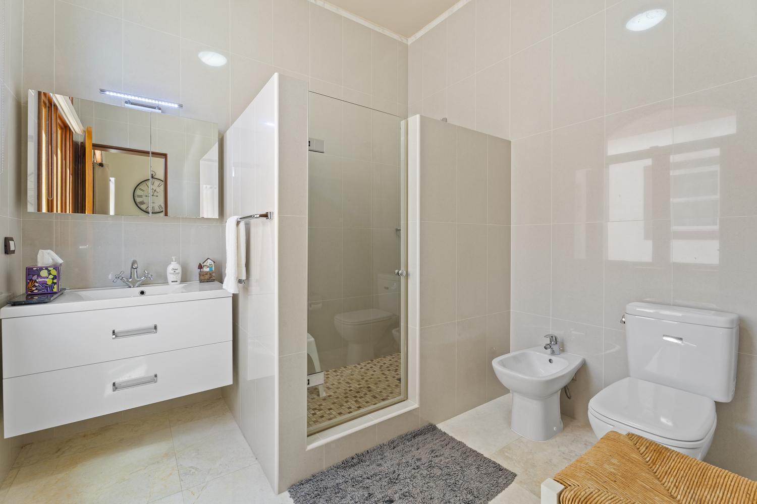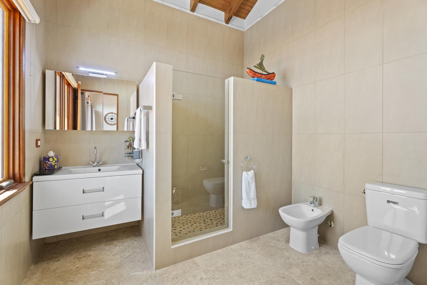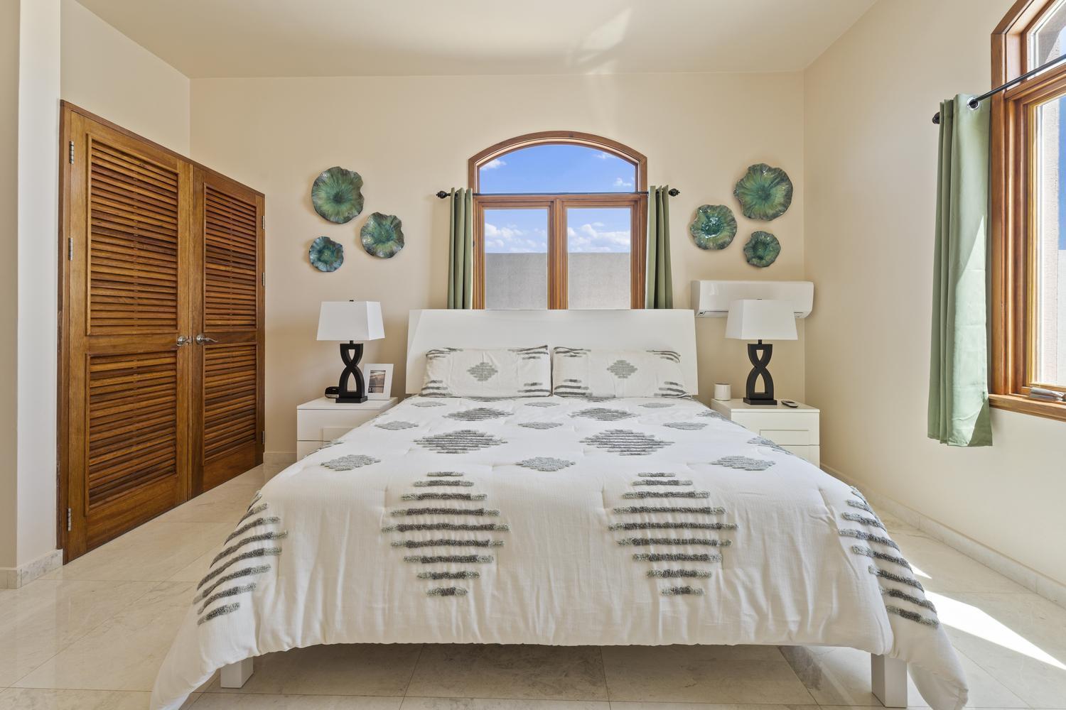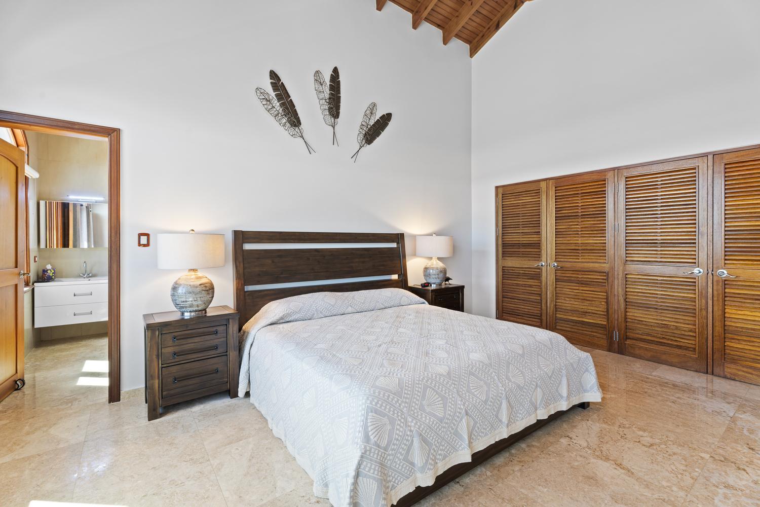 The villa offers 5 bedrooms and 4.5 bathrooms across two levels. On the ground floor, two bright and spacious bedrooms each feature their own ensuite bathroom, providing comfort and privacy. A stylish powder room and an attached two-car garage with direct access to a dedicated laundry room complete this level.