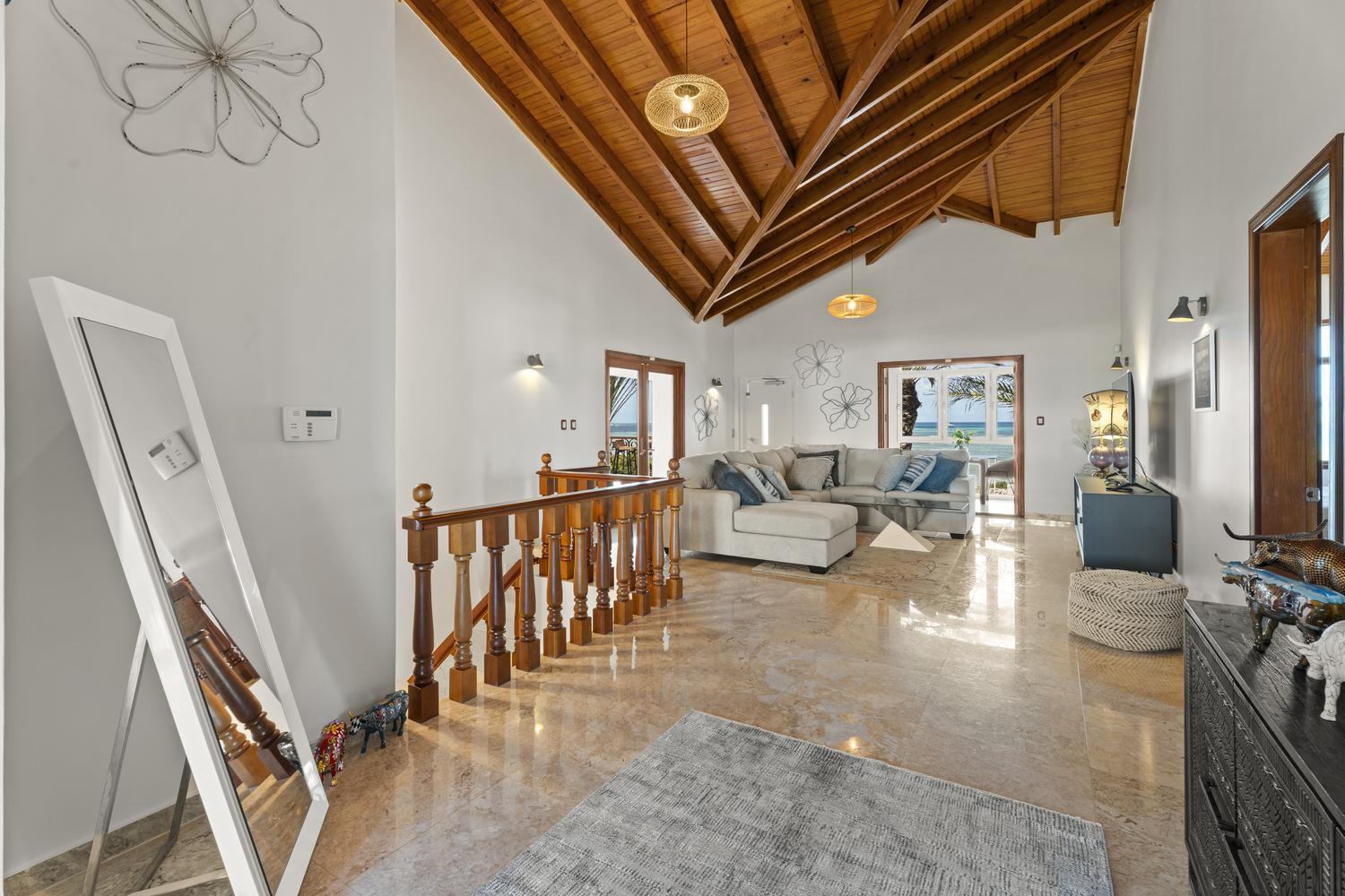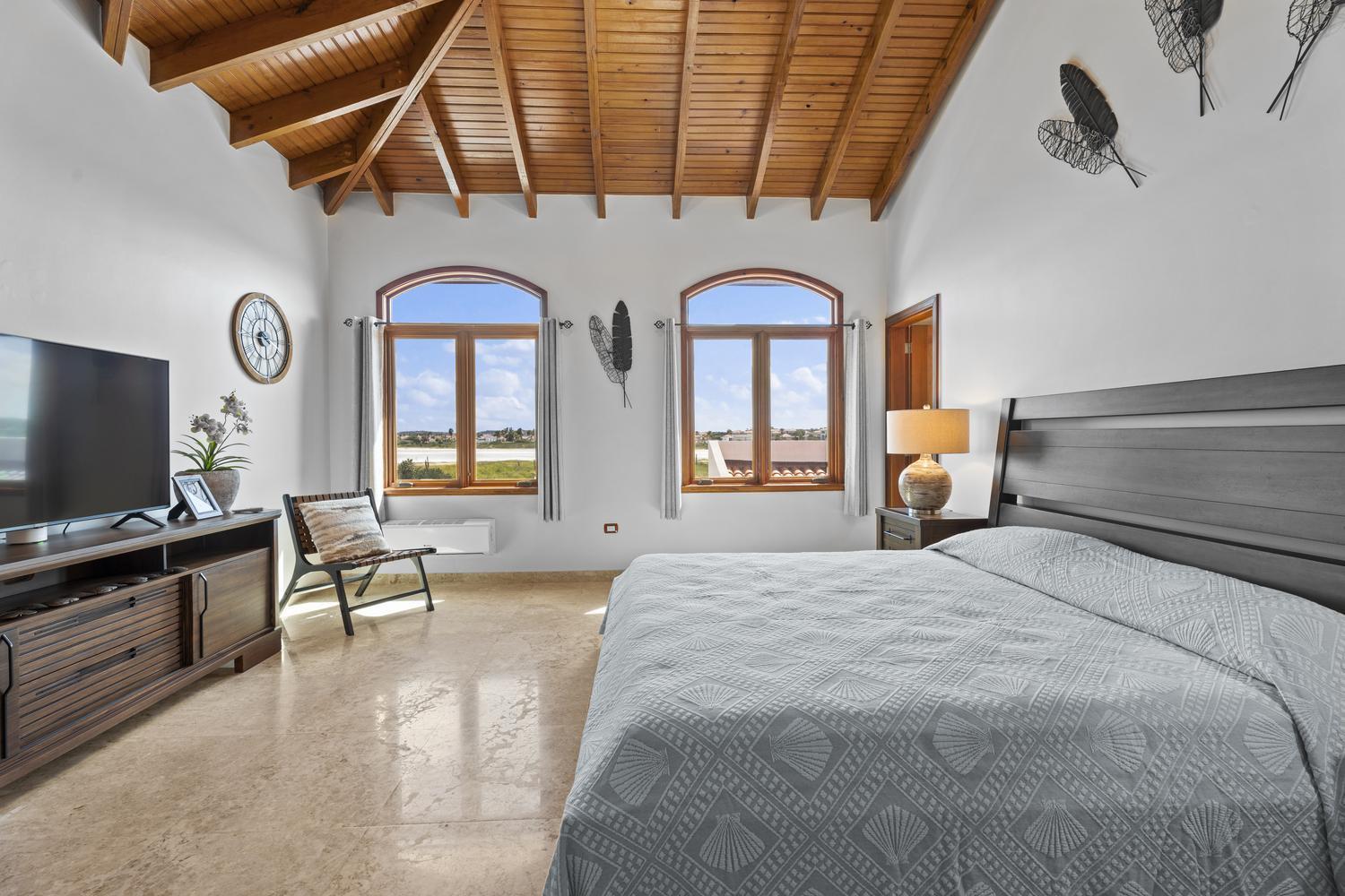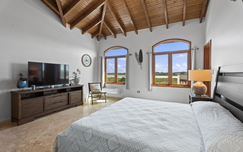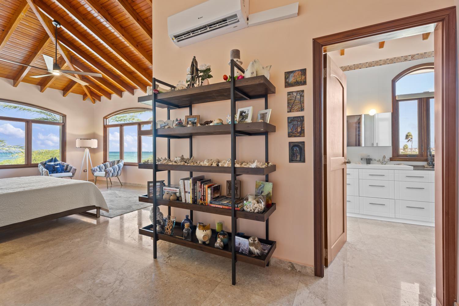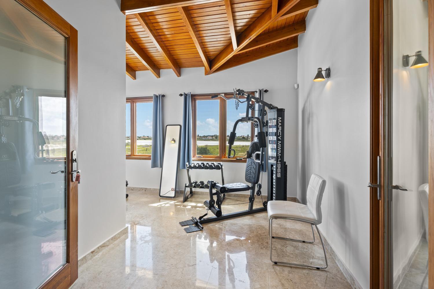 Upstairs, soaring ceilings define the second living area, with spectacular ocean views from every angle. An enclosed terrace offers a unique 360° panorama of the Caribbean Sea, while a large outdoor terrace expands the living space even further. The upper floor is home to three bedrooms: a spacious suite with its own ensuite bathroom, a versatile guest room, and the spectacular master suite with wraparound ocean views, a spa-like bathroom with jacuzzi, and a walk-in closet. Completing the upper level is a private gym overlooking the salina, while a second laundry room provides added ease and practicality.