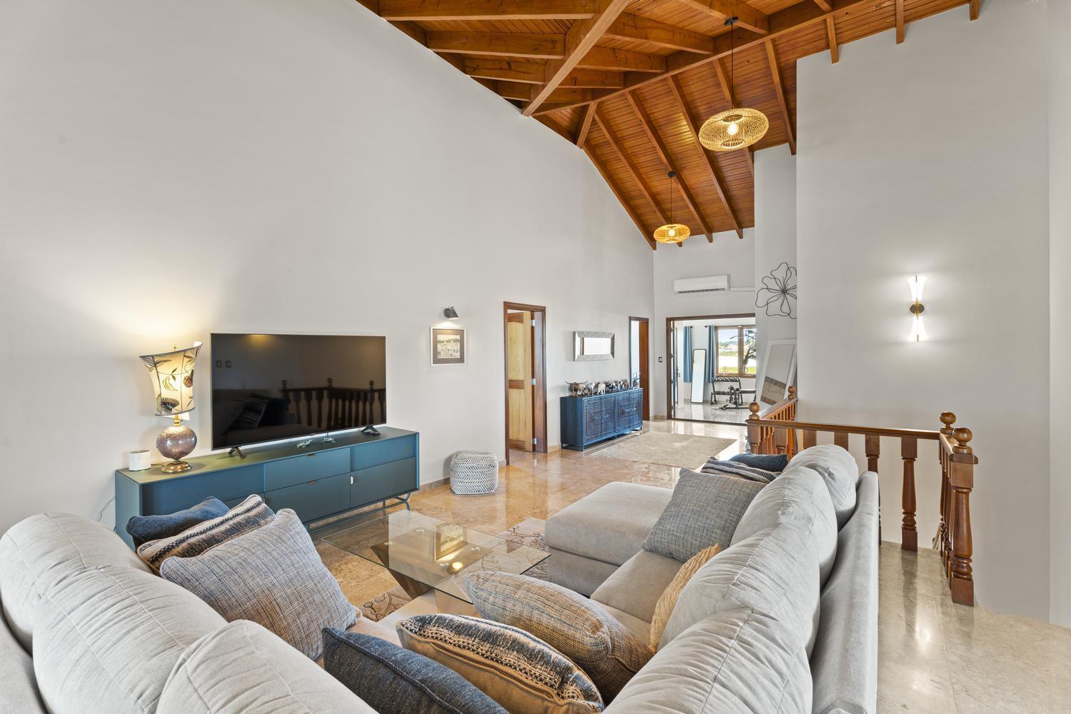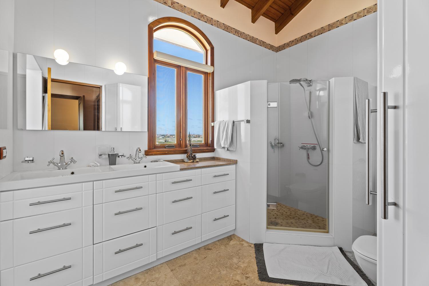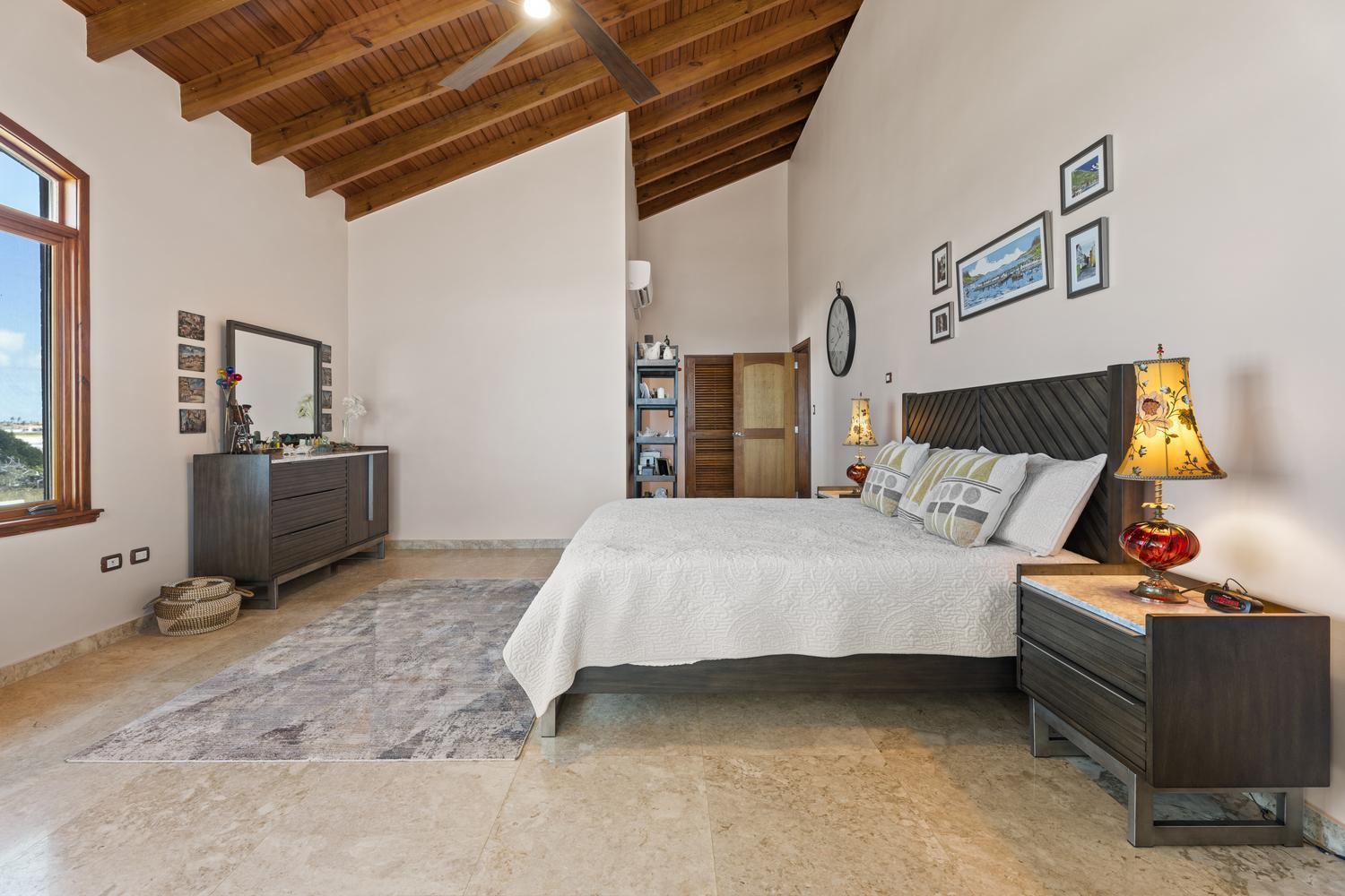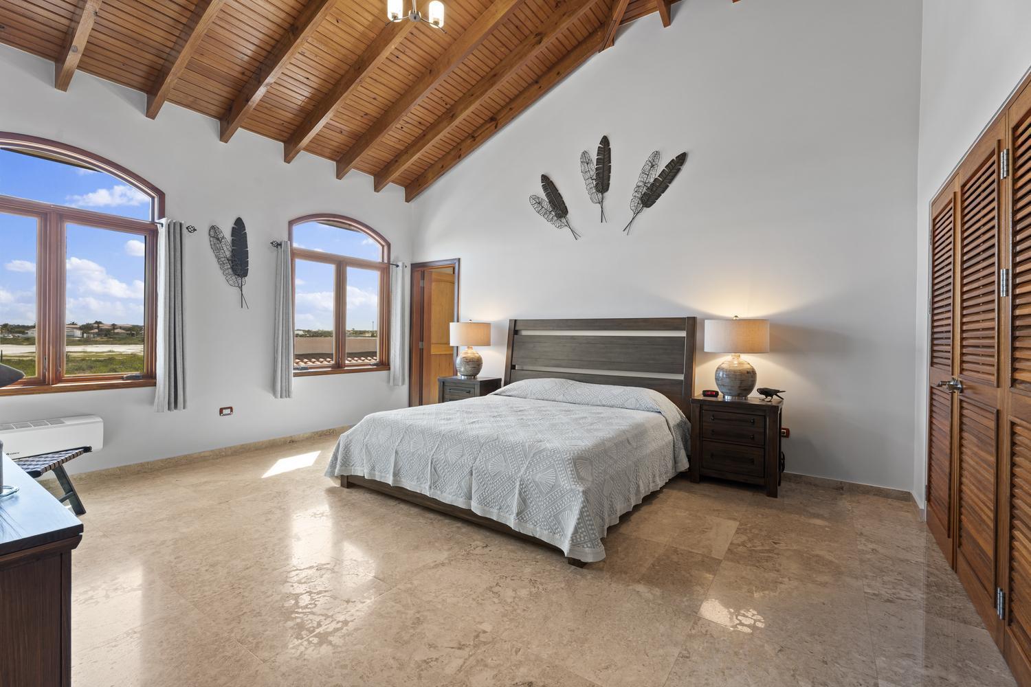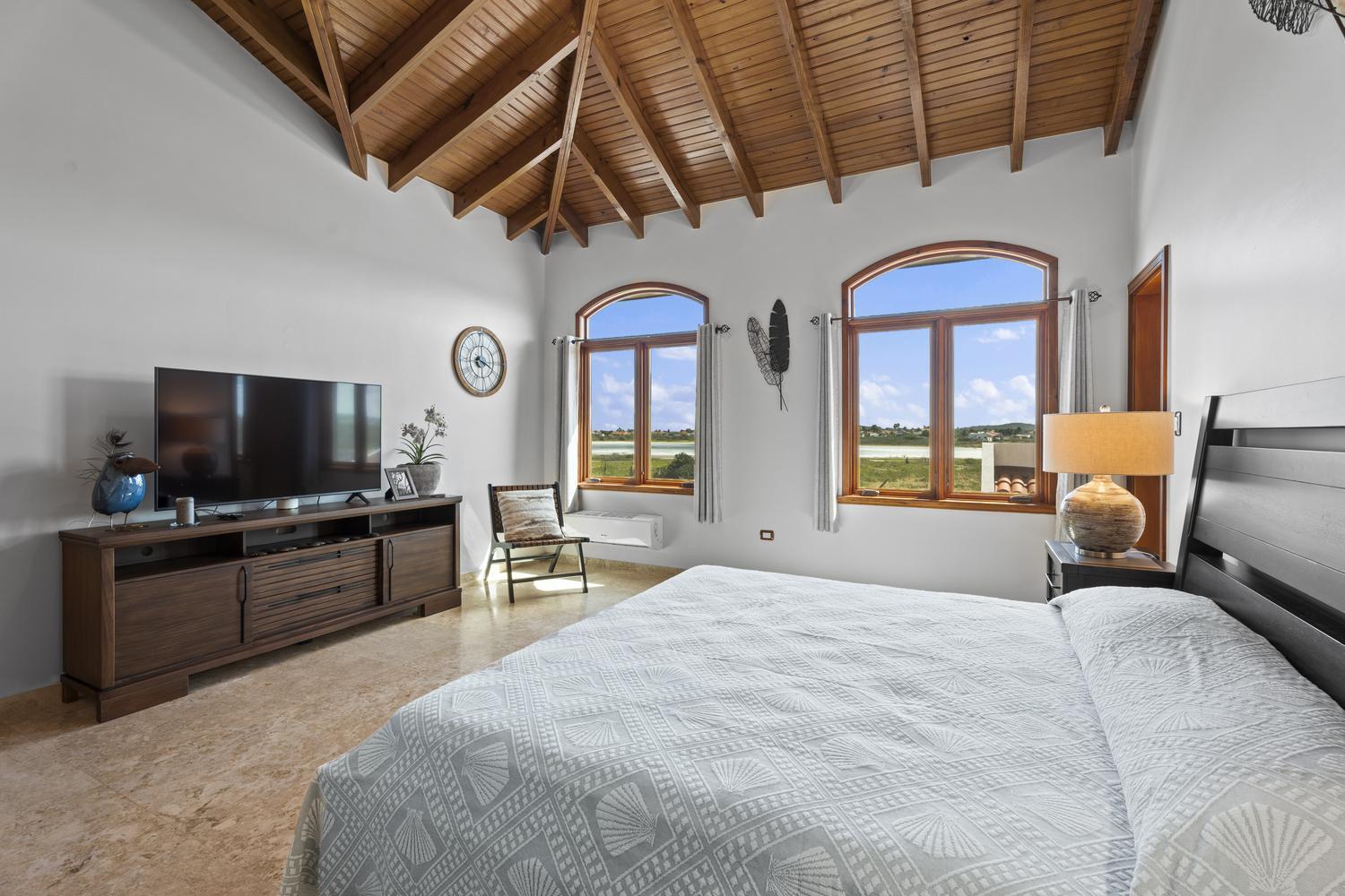 Upstairs, soaring ceilings define the second living area, with spectacular ocean views from every angle. An enclosed terrace offers a unique 360° panorama of the Caribbean Sea, while a large outdoor terrace expands the living space even further. The upper floor is home to three bedrooms: a spacious suite with its own ensuite bathroom, a versatile guest room, and the spectacular master suite with wraparound ocean views, a spa-like bathroom with jacuzzi, and a walk-in closet. Completing the upper level is a private gym overlooking the salina, while a second laundry room provides added ease and practicality.