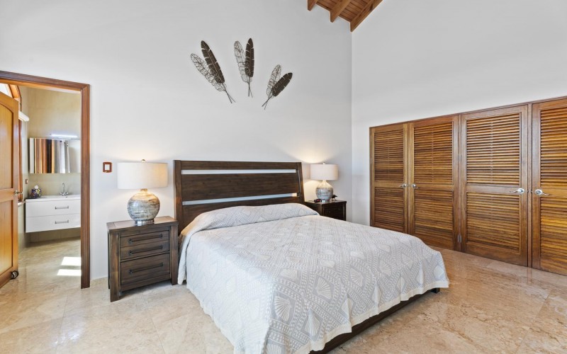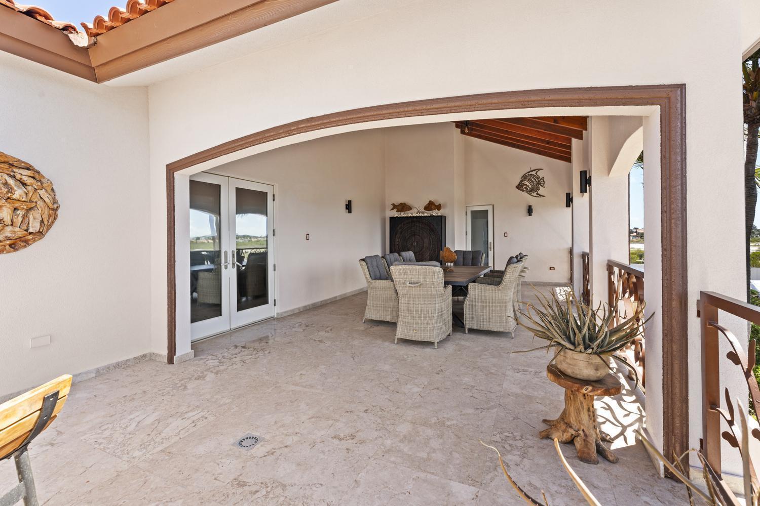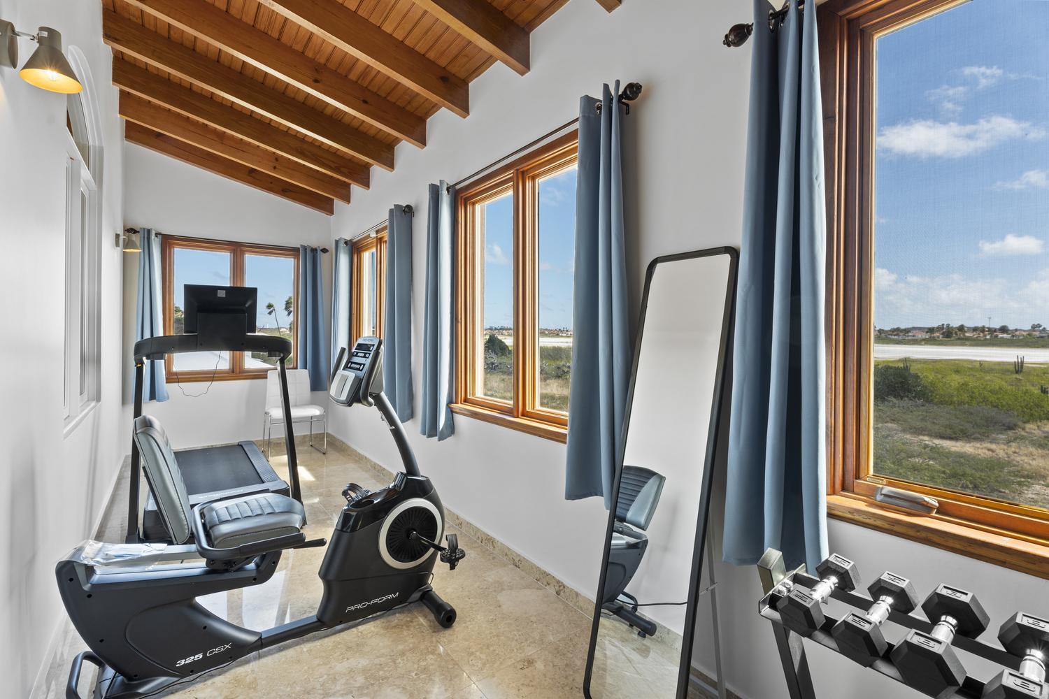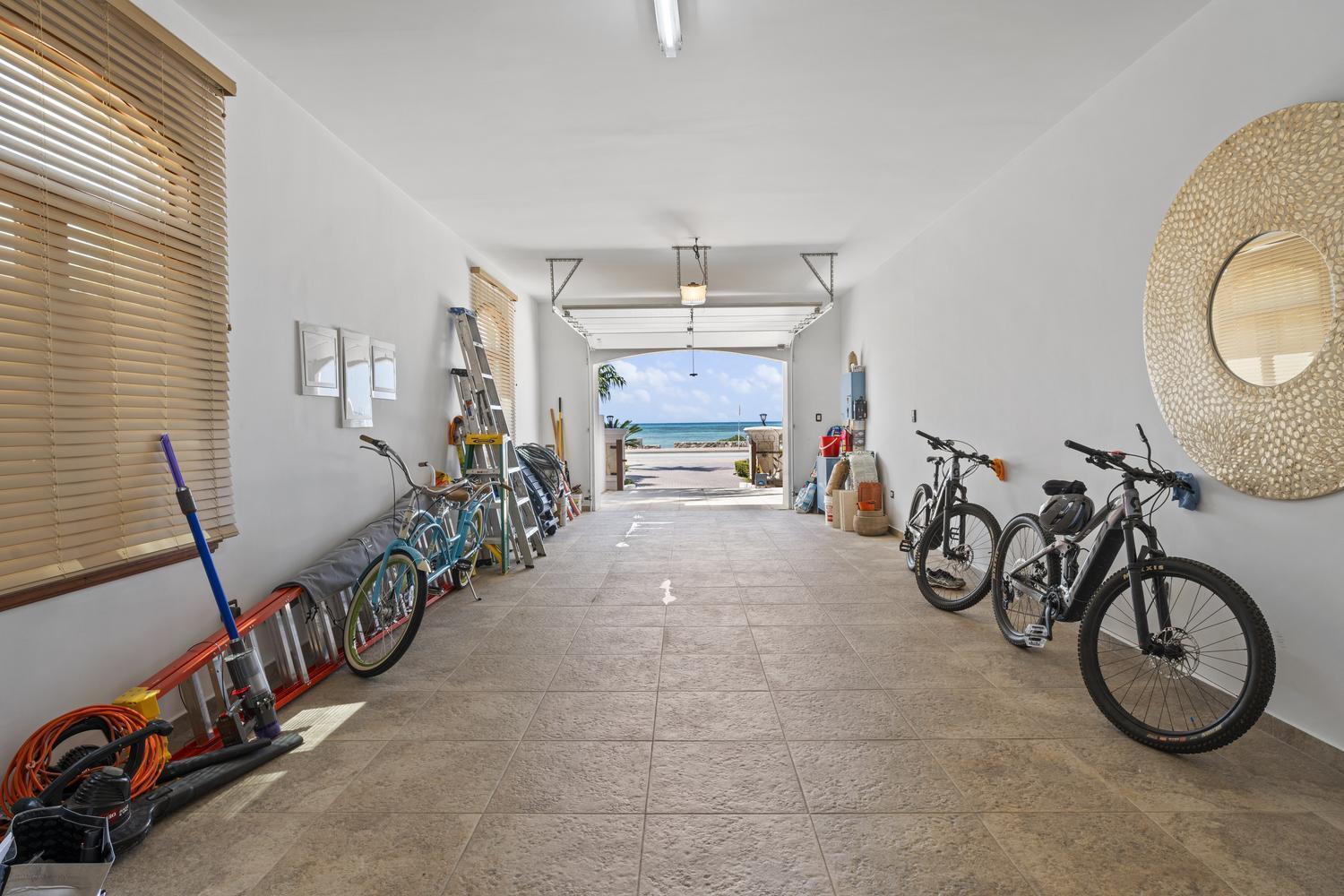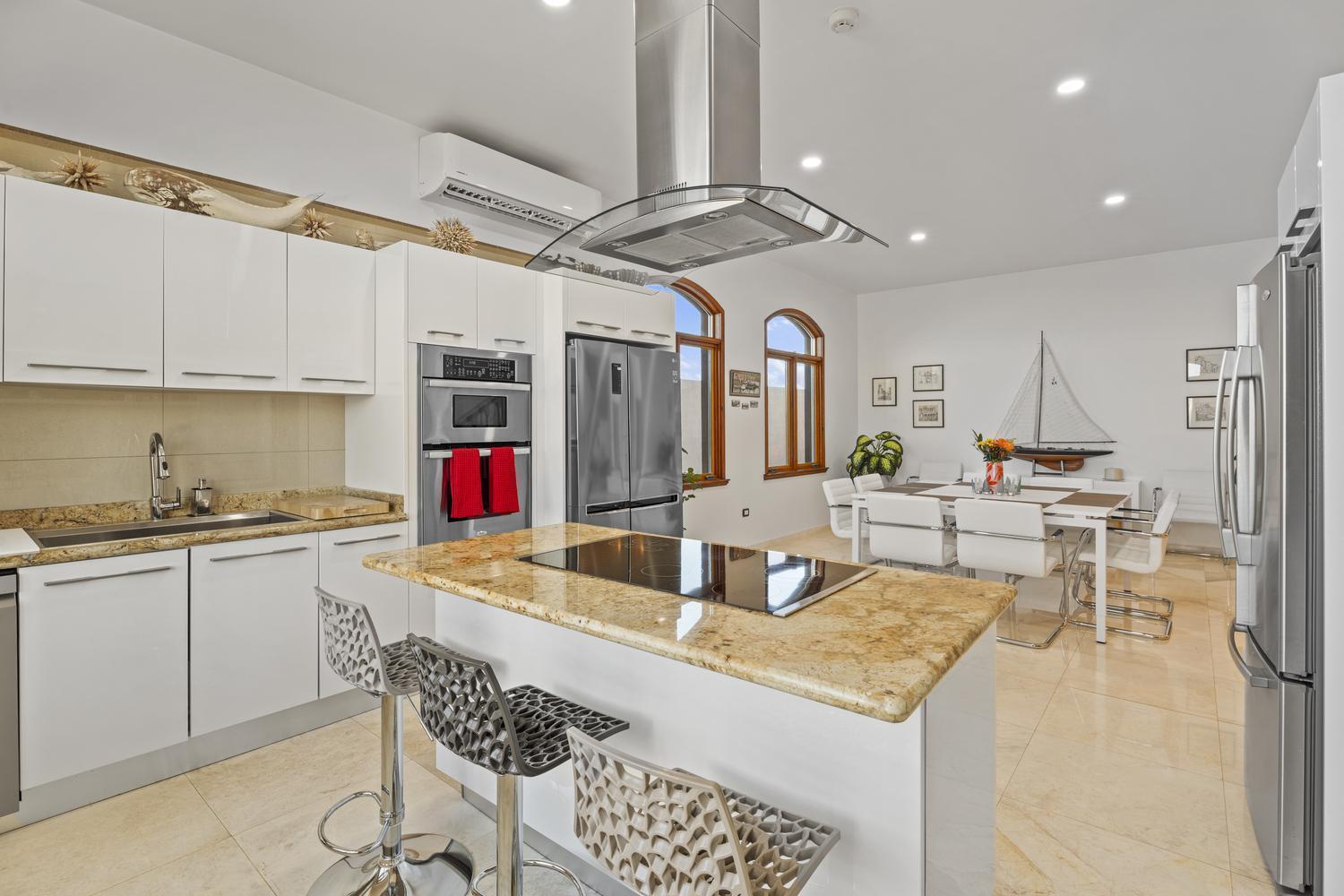 Upstairs, soaring ceilings define the second living area, with spectacular ocean views from every angle. An enclosed terrace offers a unique 360° panorama of the Caribbean Sea, while a large outdoor terrace expands the living space even further. The upper floor is home to three bedrooms: a spacious suite with its own ensuite bathroom, a versatile guest room, and the spectacular master suite with wraparound ocean views, a spa-like bathroom with jacuzzi, and a walk-in closet. Completing the upper level is a private gym overlooking the salina, while a second laundry room provides added ease and practicality.