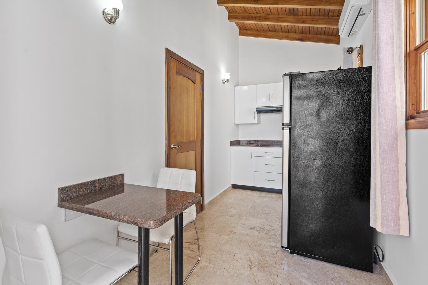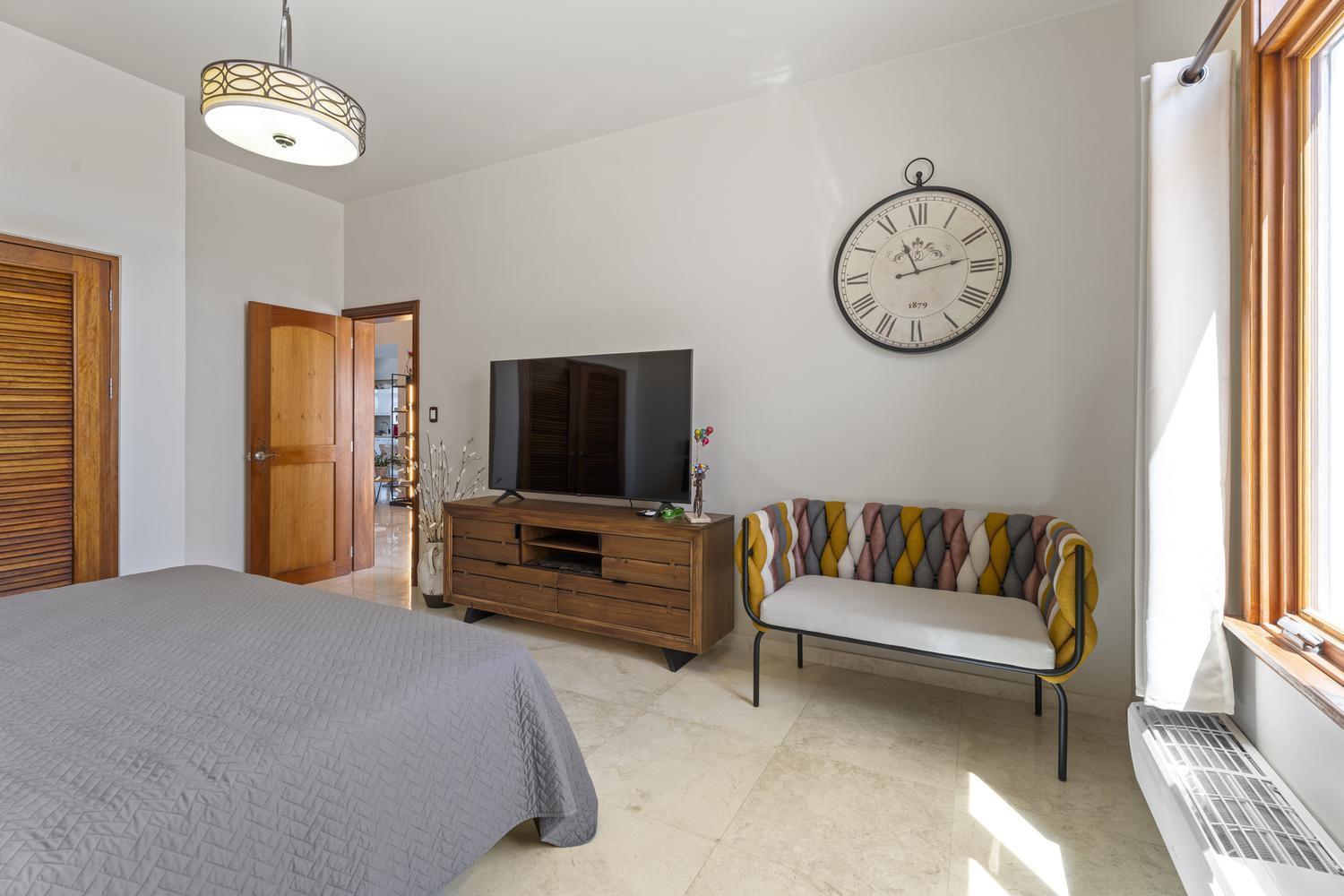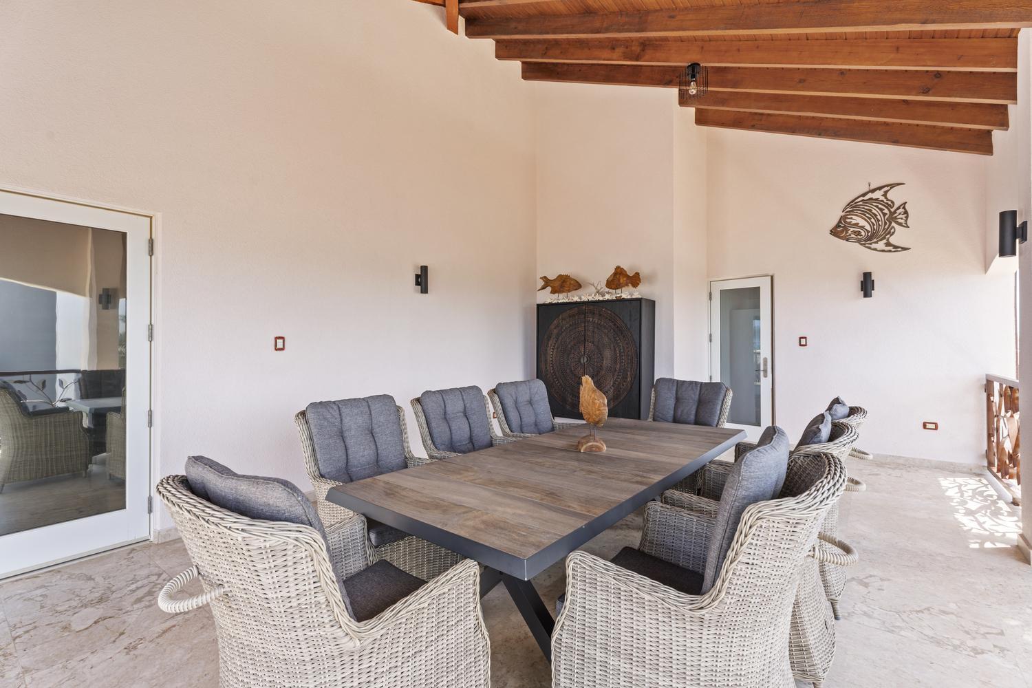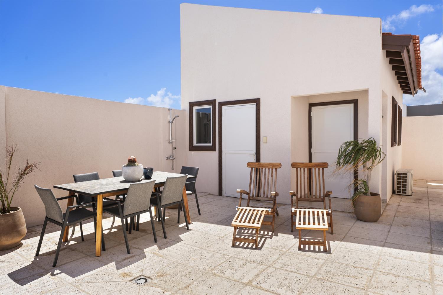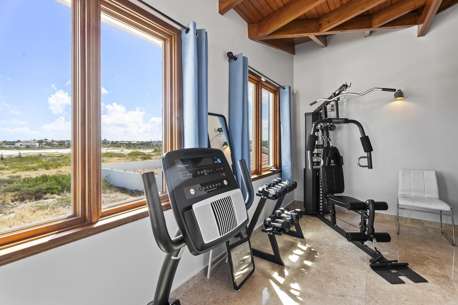 Upstairs, soaring ceilings define the second living area, with spectacular ocean views from every angle. An enclosed terrace offers a unique 360° panorama of the Caribbean Sea, while a large outdoor terrace expands the living space even further. The upper floor is home to three bedrooms: a spacious suite with its own ensuite bathroom, a versatile guest room, and the spectacular master suite with wraparound ocean views, a spa-like bathroom with jacuzzi, and a walk-in closet. Completing the upper level is a private gym overlooking the salina, while a second laundry room provides added ease and practicality.
