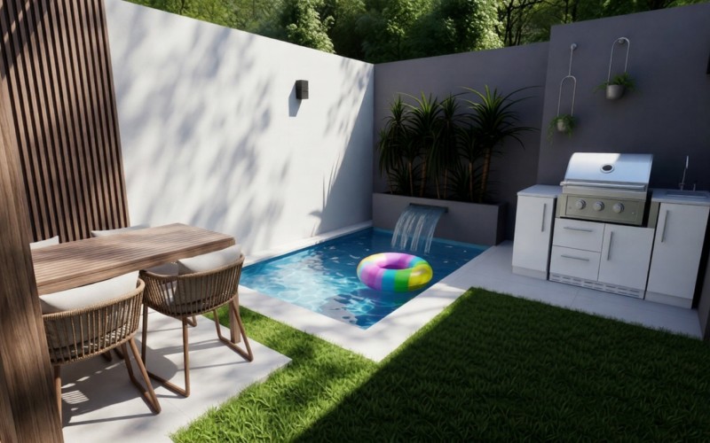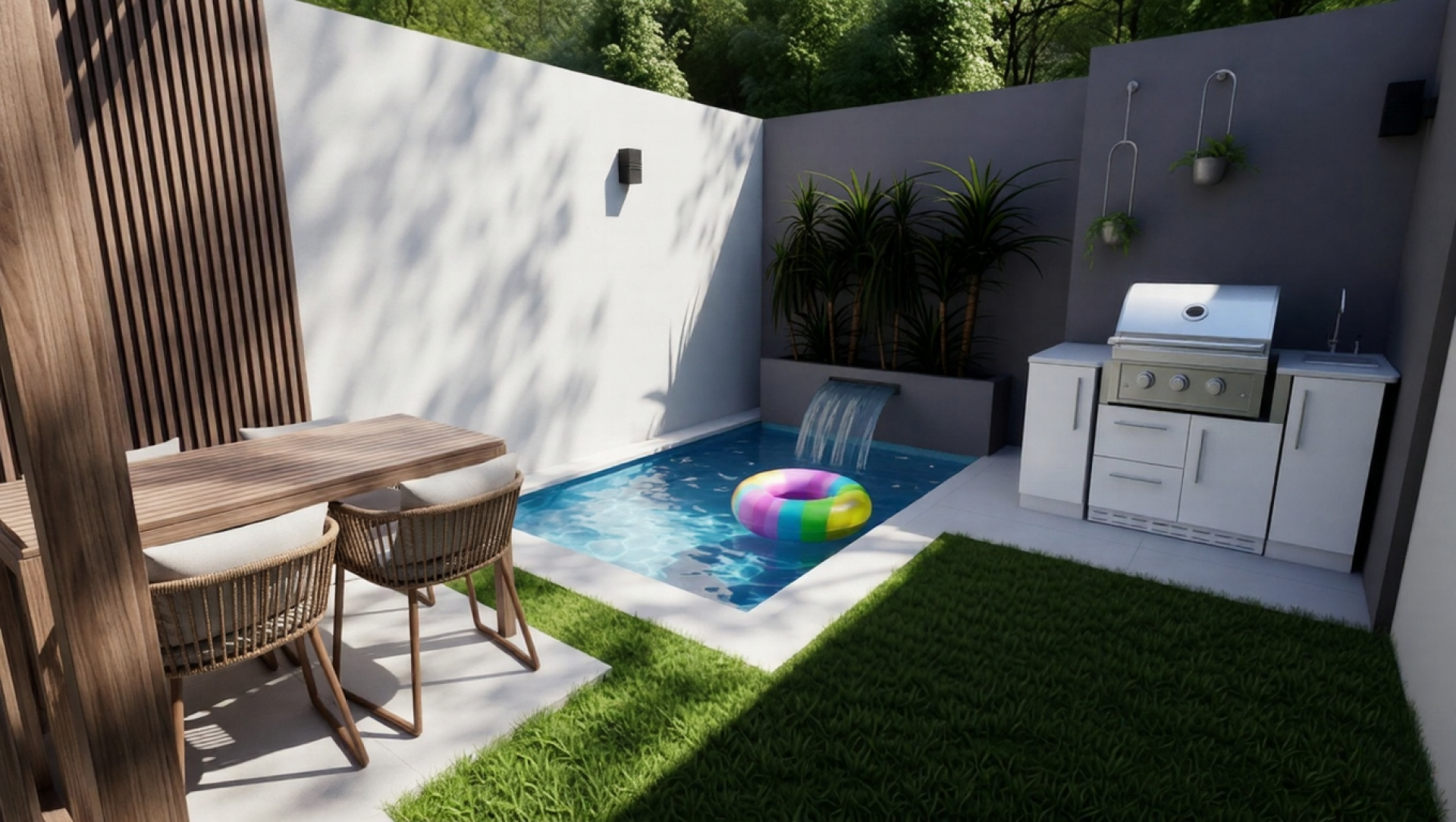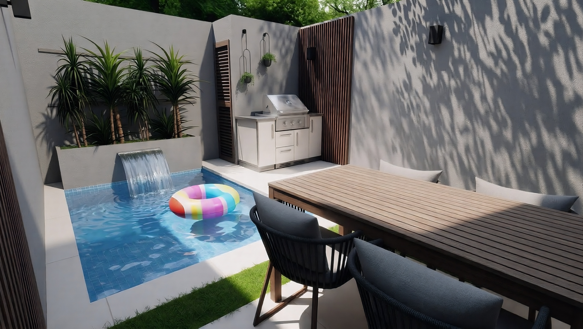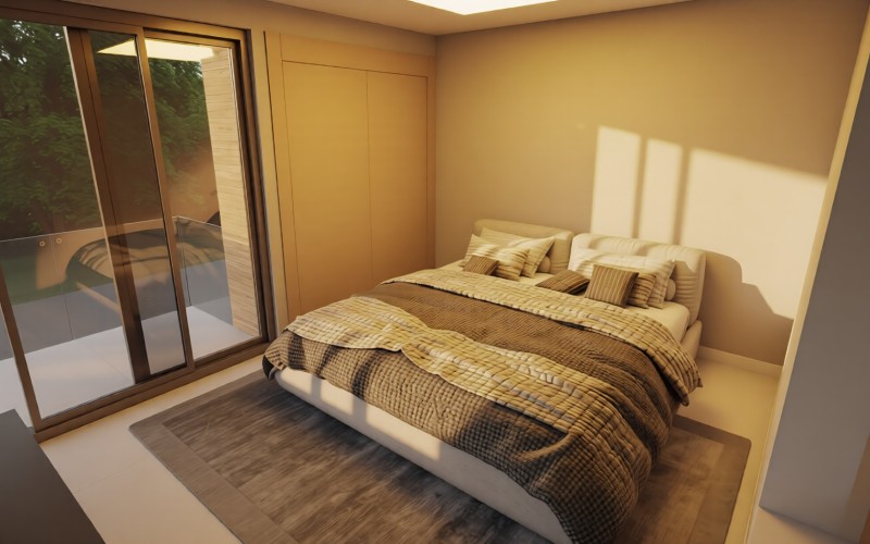 The ground floor features an open-concept layout, where the modern kitchen with island flows seamlessly into the living area. Sliding doors open to the private garden with pool and seating area, with the option to add a custom outdoor grill area — creating a comfortable and functional outdoor living space. A guest powder room completes this level.