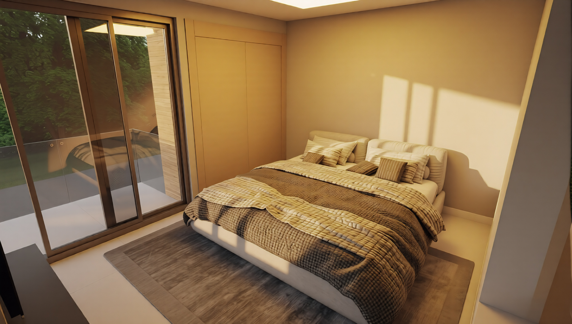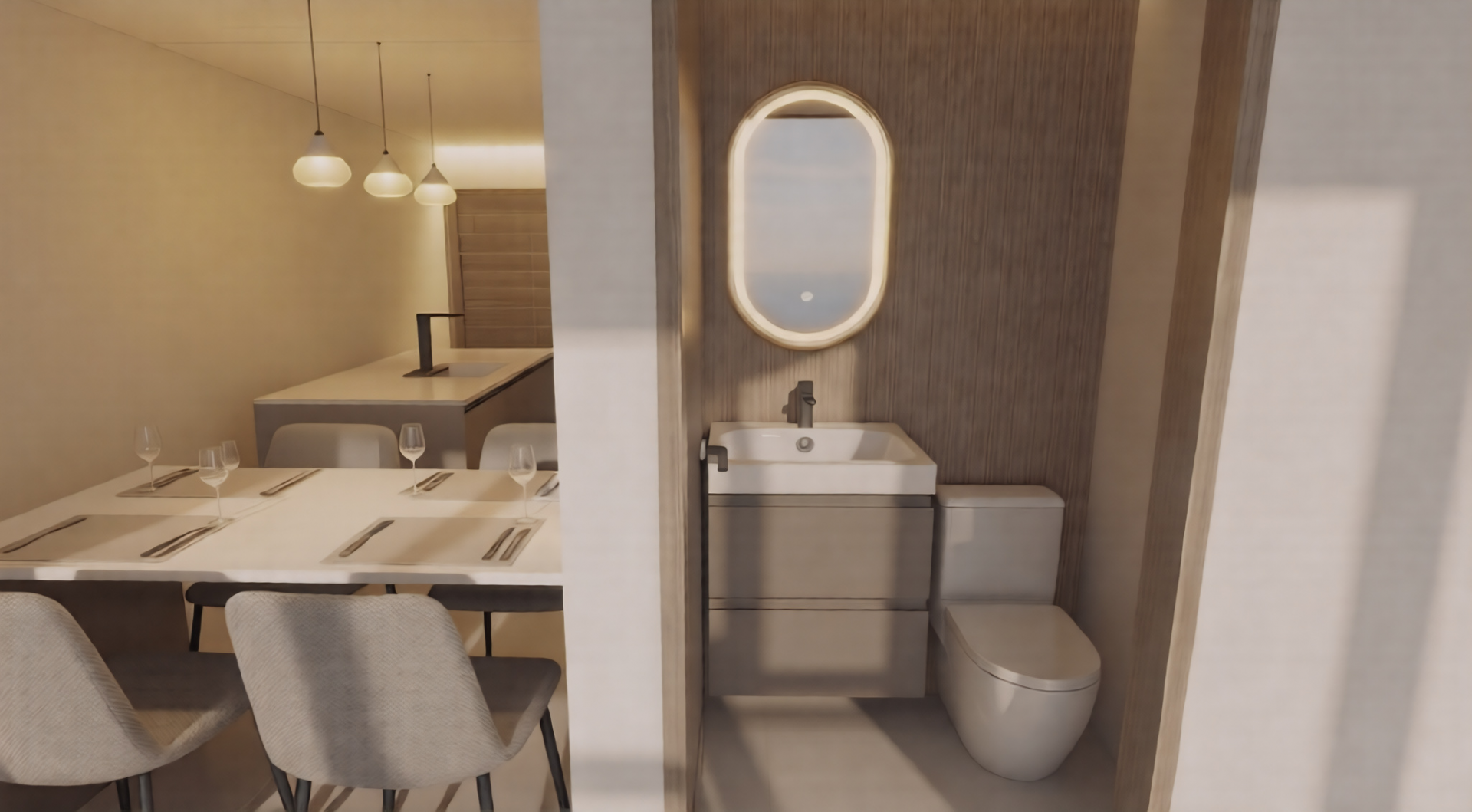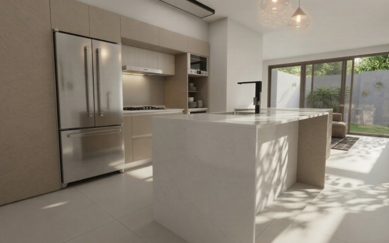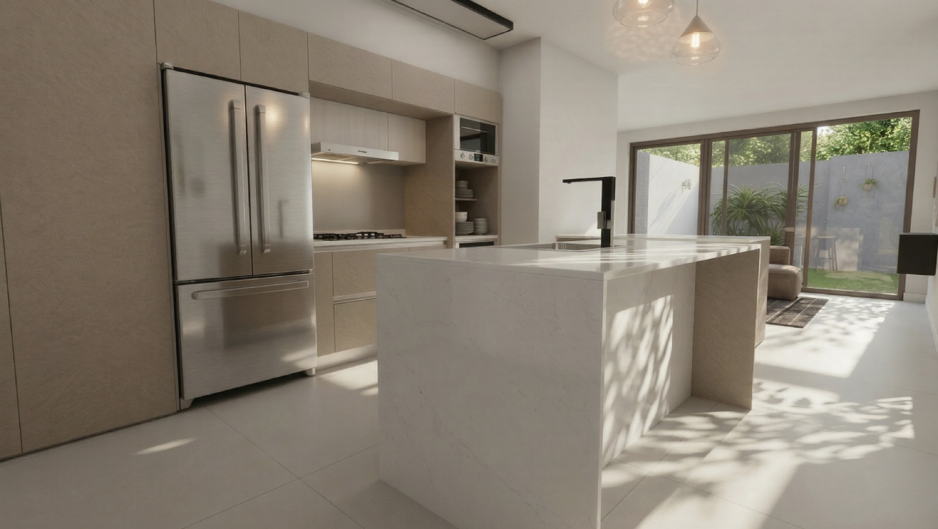 The ground floor features an open-concept layout, where the modern kitchen with island flows seamlessly into the living area. Sliding doors open to the private garden with pool and seating area, with the option to add a custom outdoor grill area — creating a comfortable and functional outdoor living space. A guest powder room completes this level.