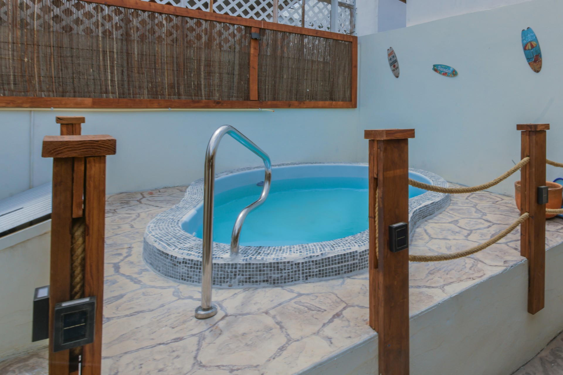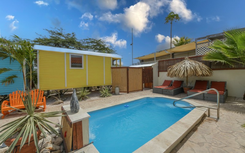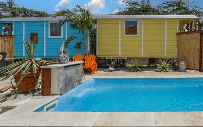 Outside, you’ll find two swimming pools: a smaller one for private use, and a larger pool that can be shared with guests or tenants staying in the units.