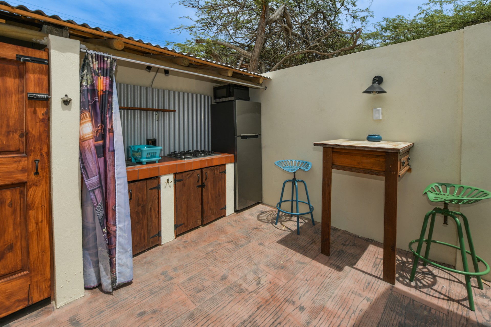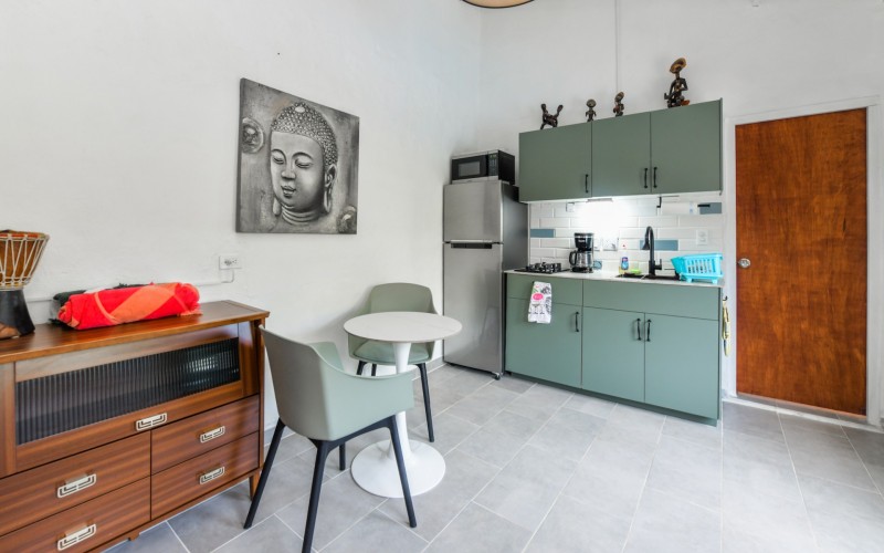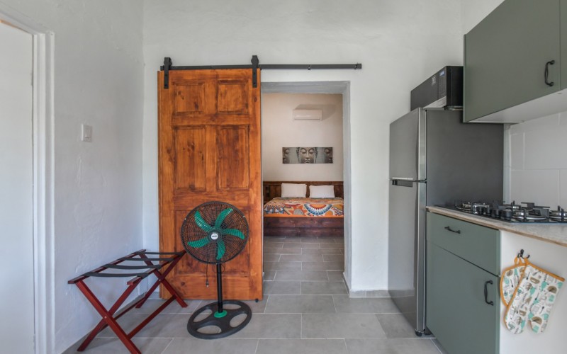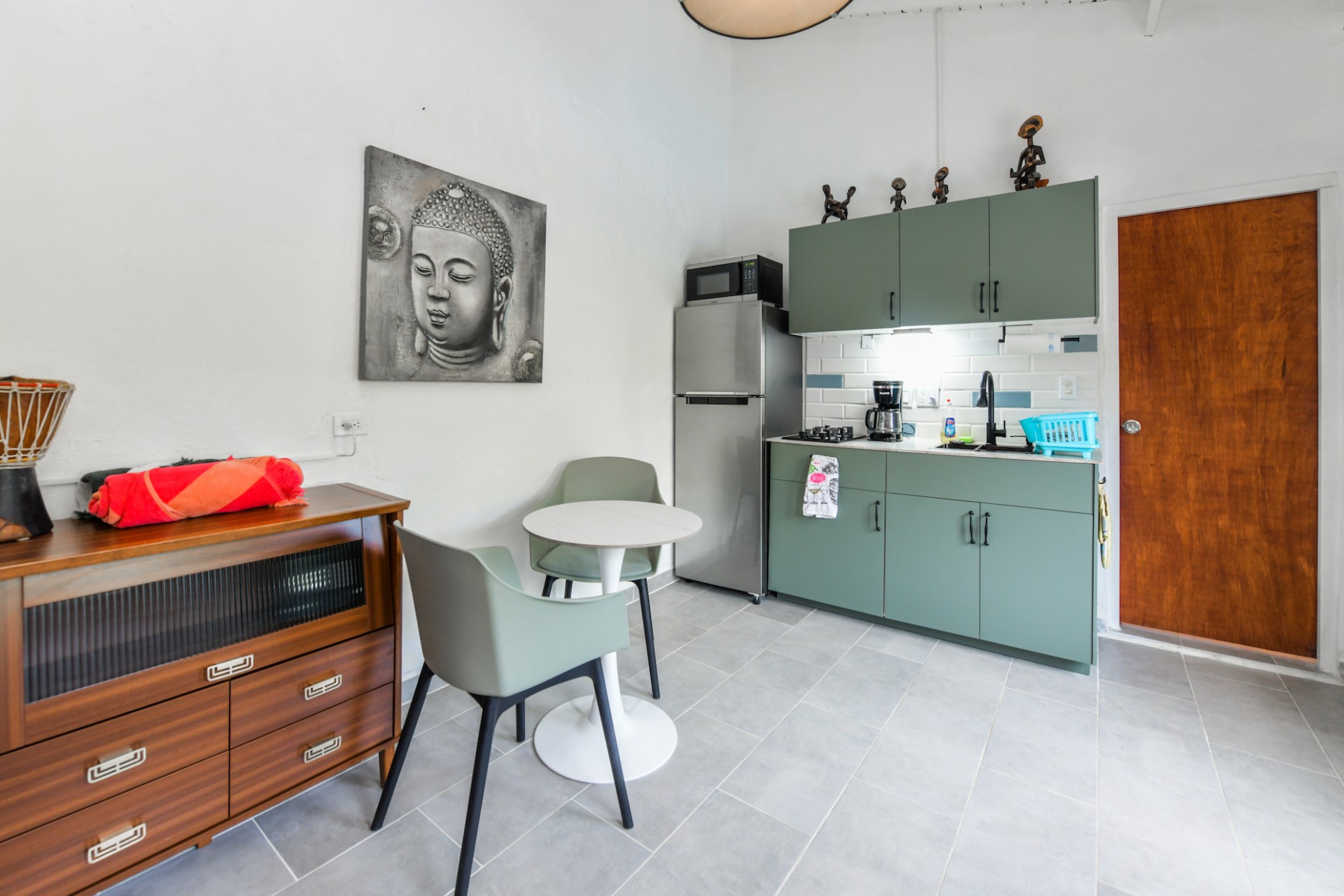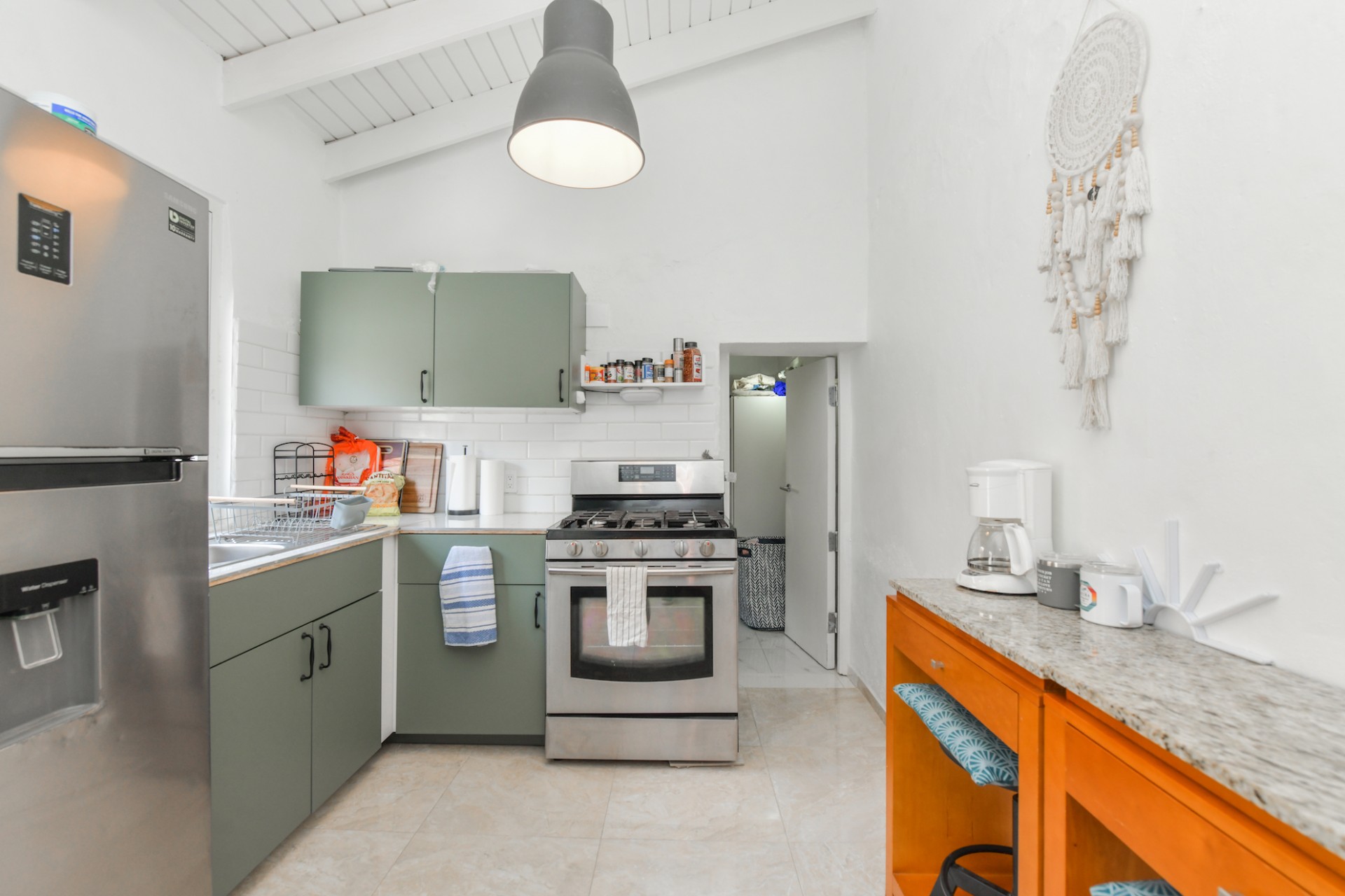 The original cunucu-style home, with an extension, has been thoughtfully divided into three 1-bedroom apartments, each with its own kitchen, bedroom, and bathroom.