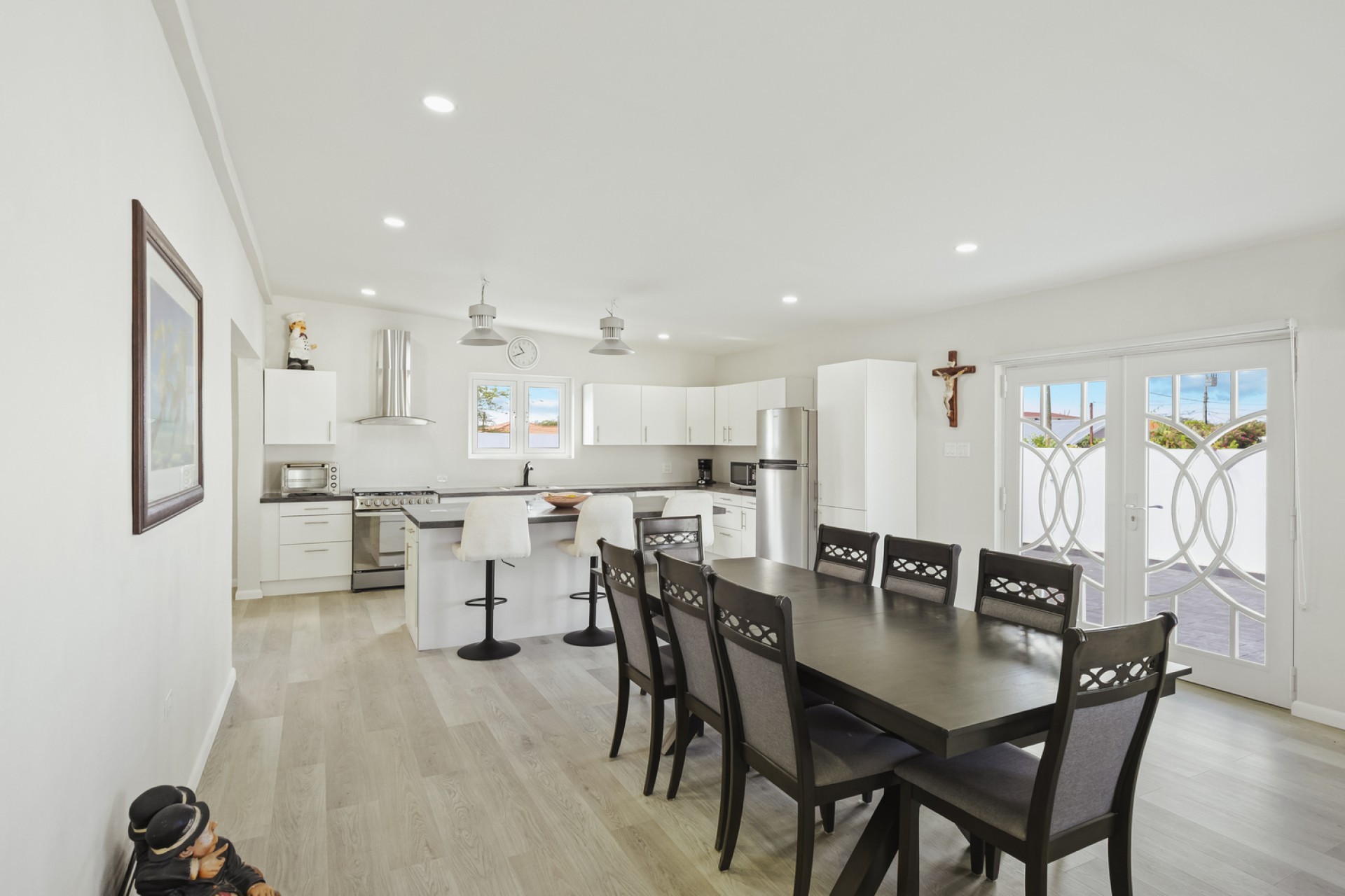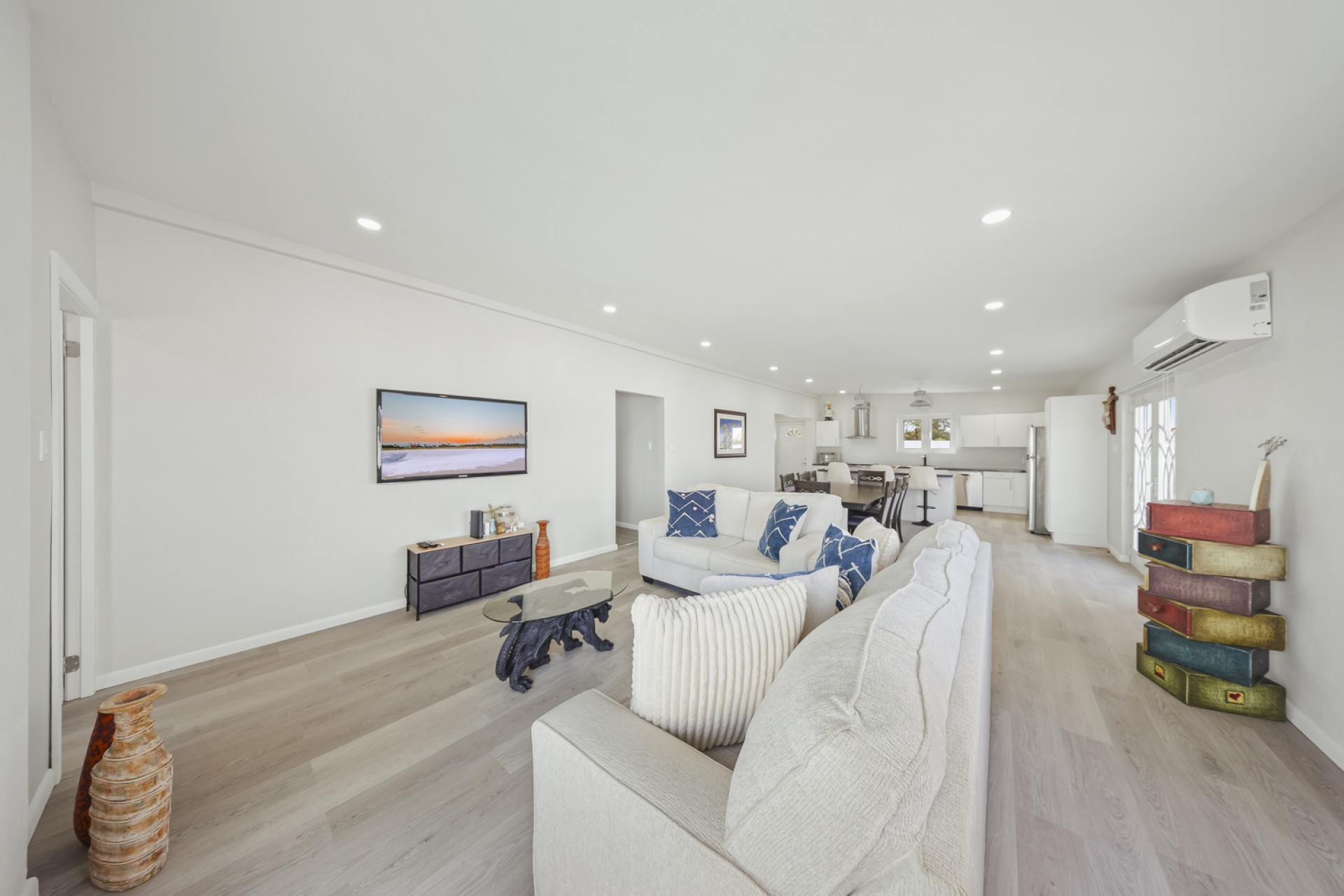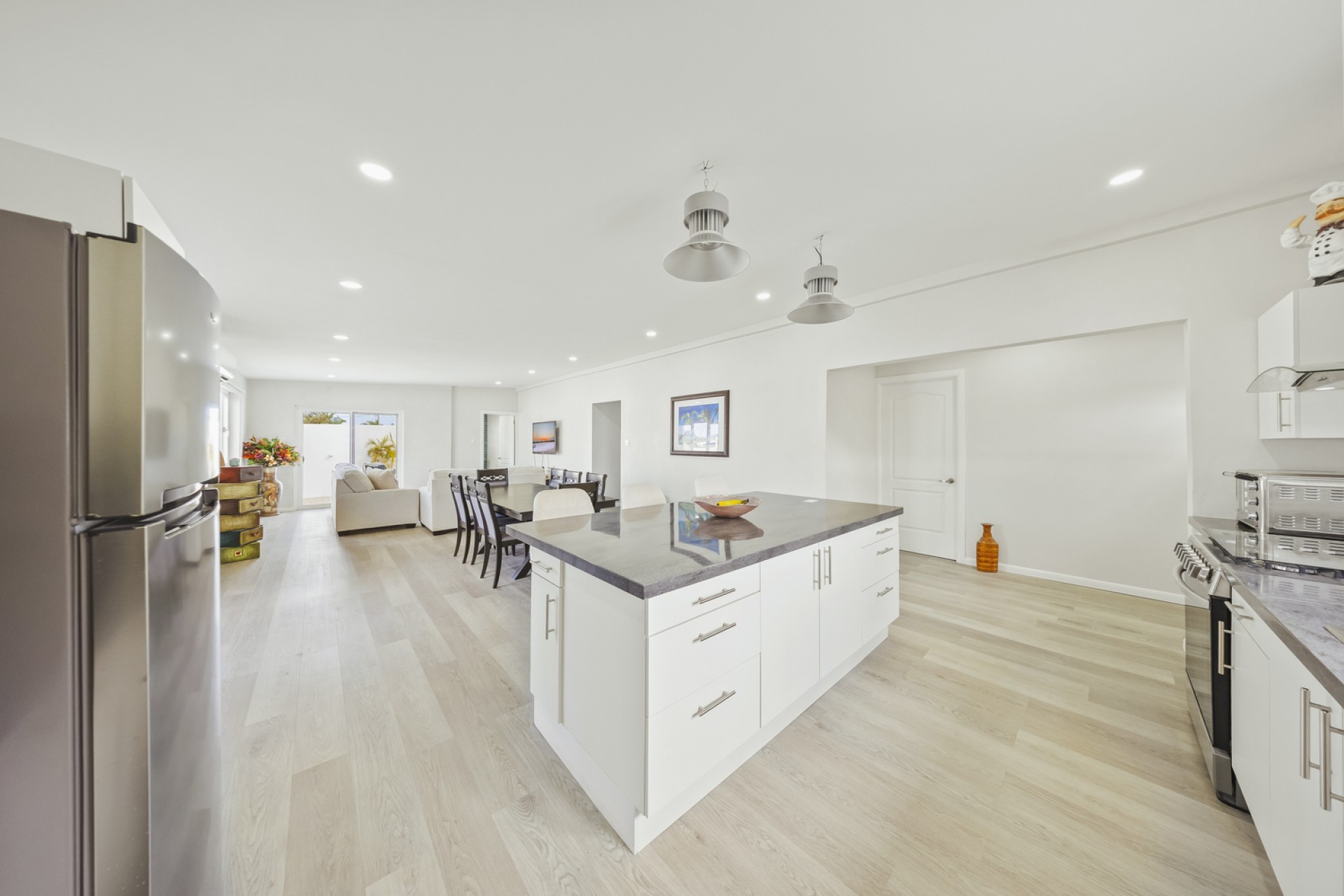 Inside, the home feels brand new. The open-concept layout centers around a sleek modern kitchen with a large island, high-end appliances, and ample storage, flowing seamlessly into the bright living area. Large sliding doors create a seamless indoor-outdoor living experience.