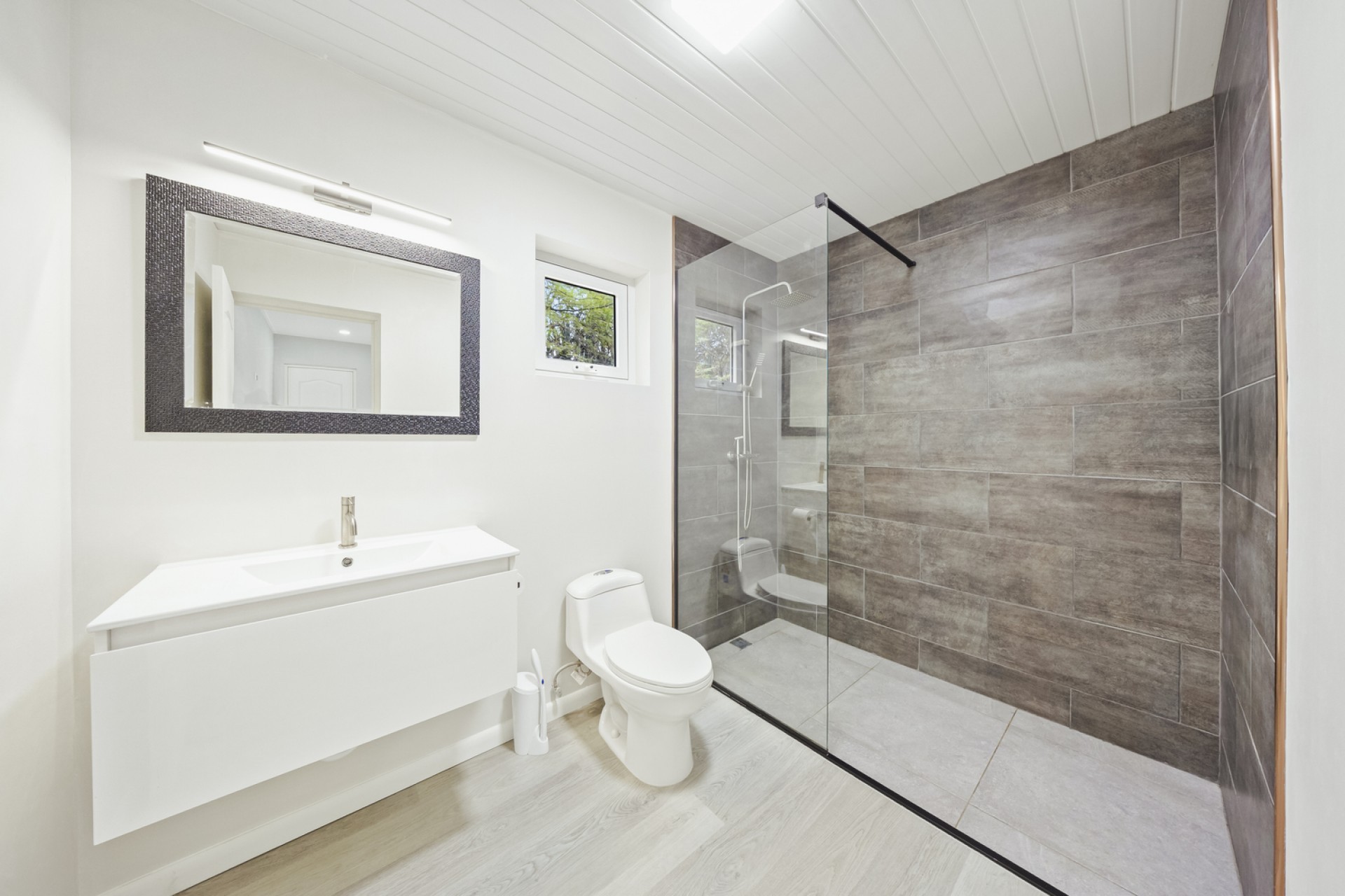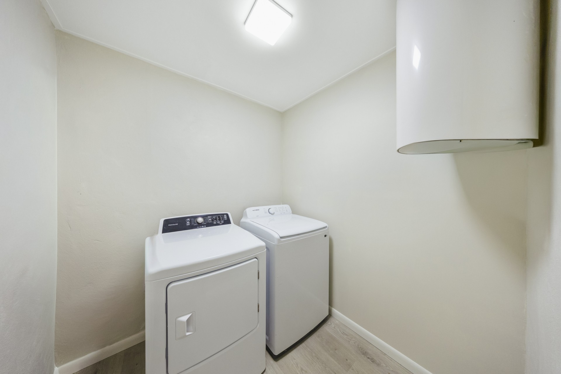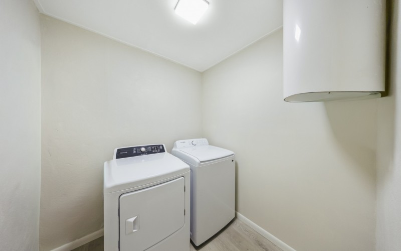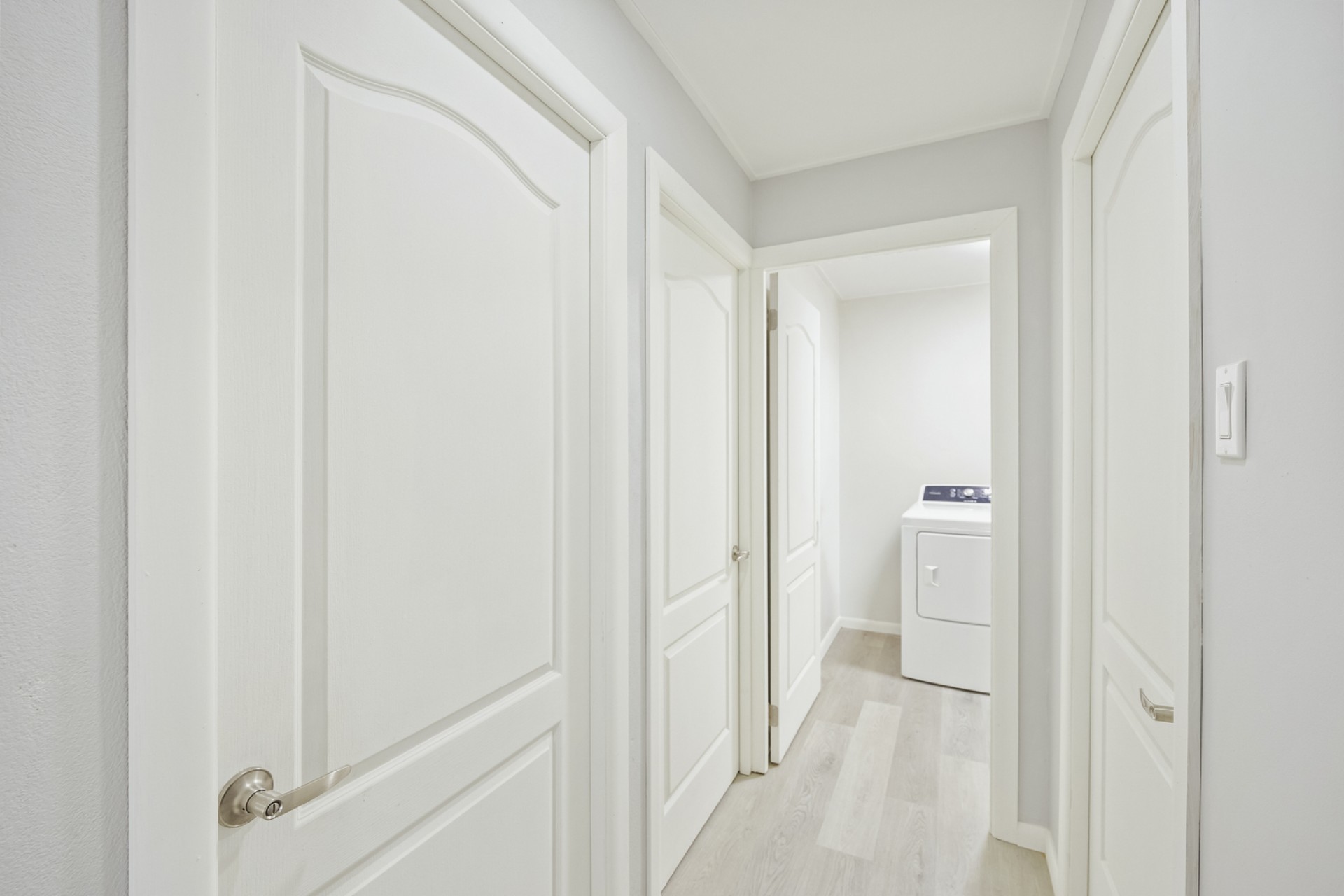 All four bedrooms feature en-suite bathrooms, finished in a clean, contemporary style. Two bathrooms include soaking tubs and walk-in showers, while the other two offer spacious walk-in showers. A dedicated laundry room with washer and dryer adds everyday convenience, and a stylish half bathroom completes the layout.