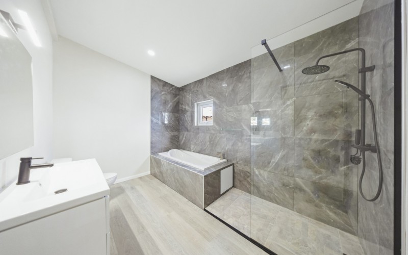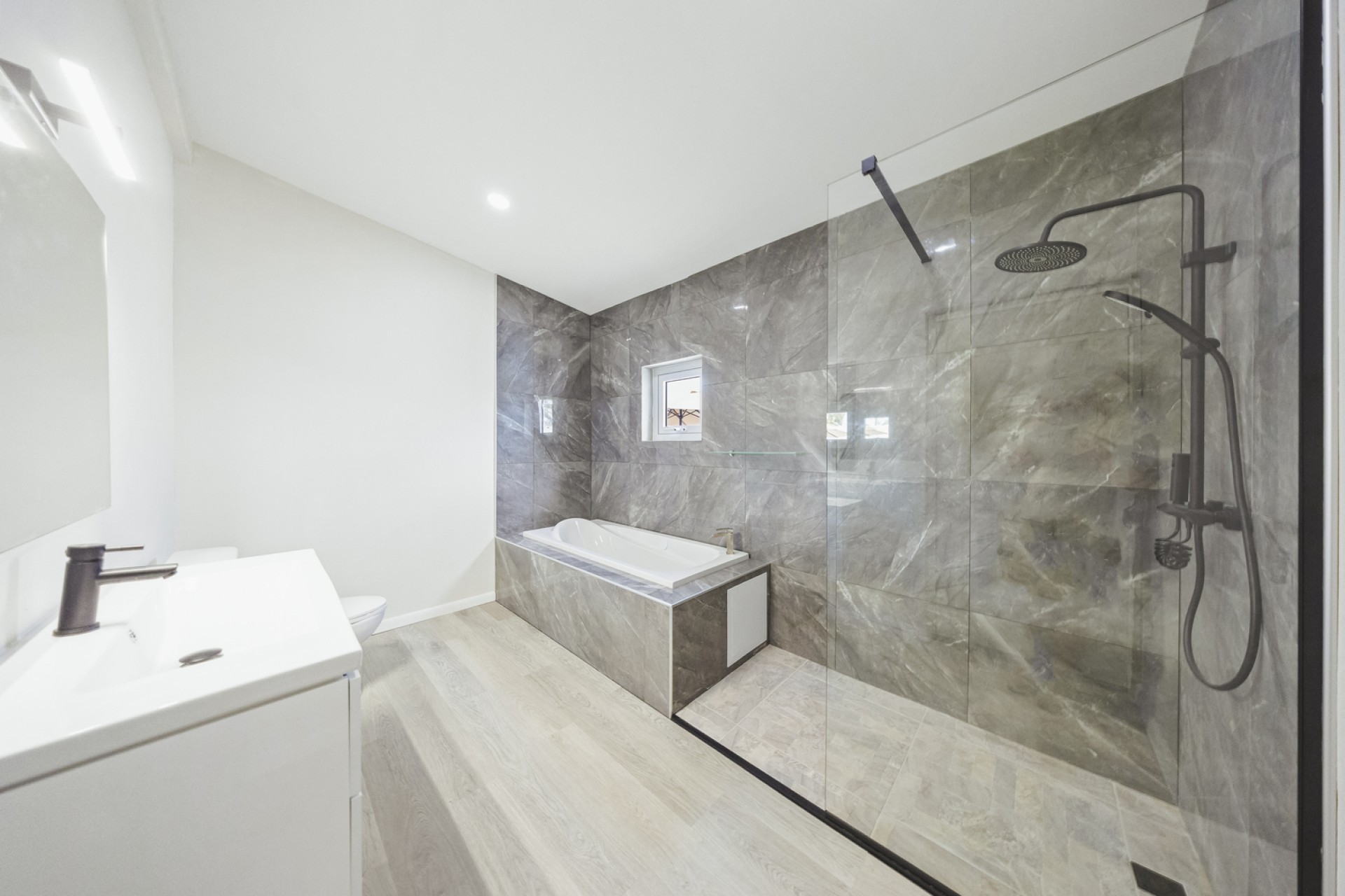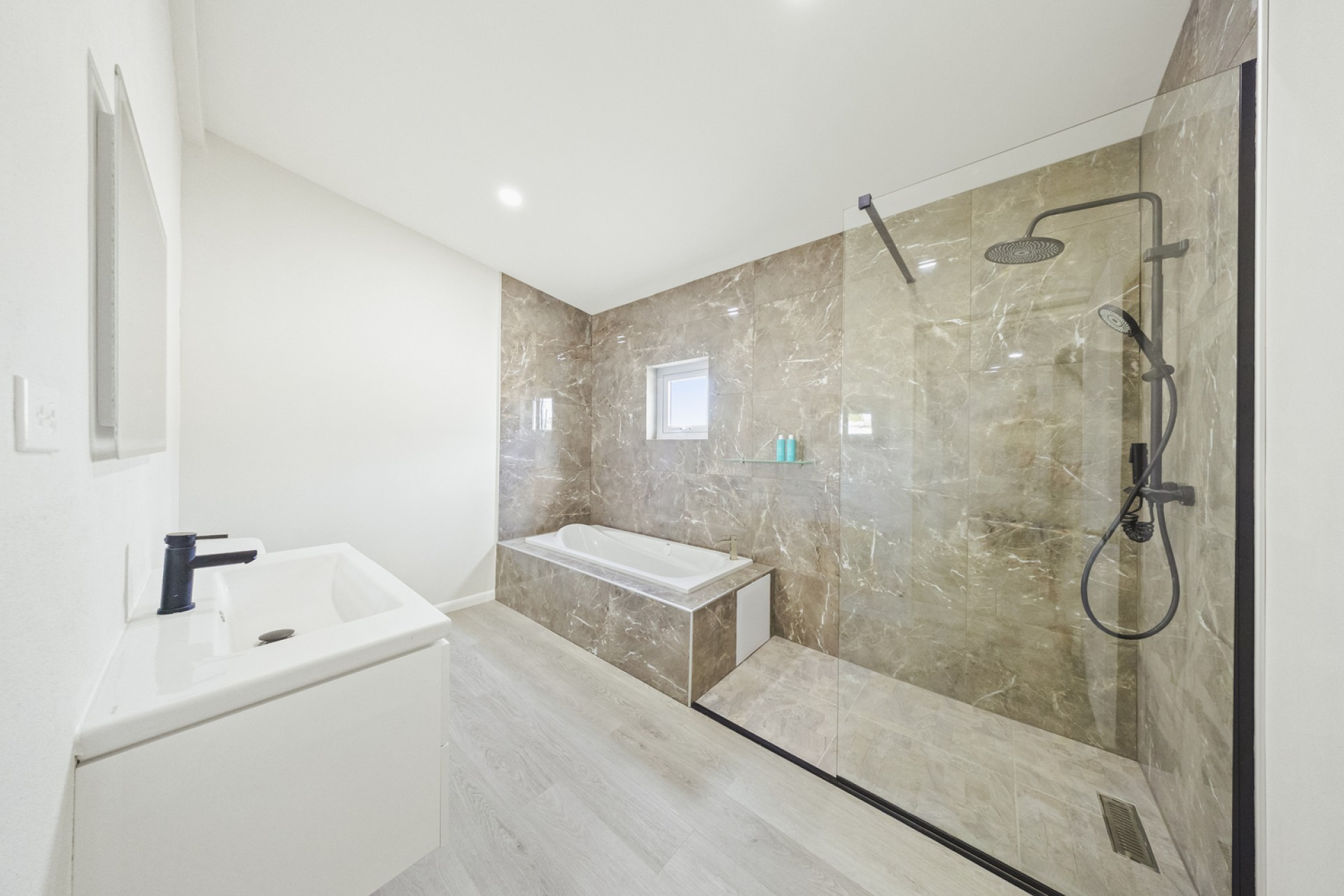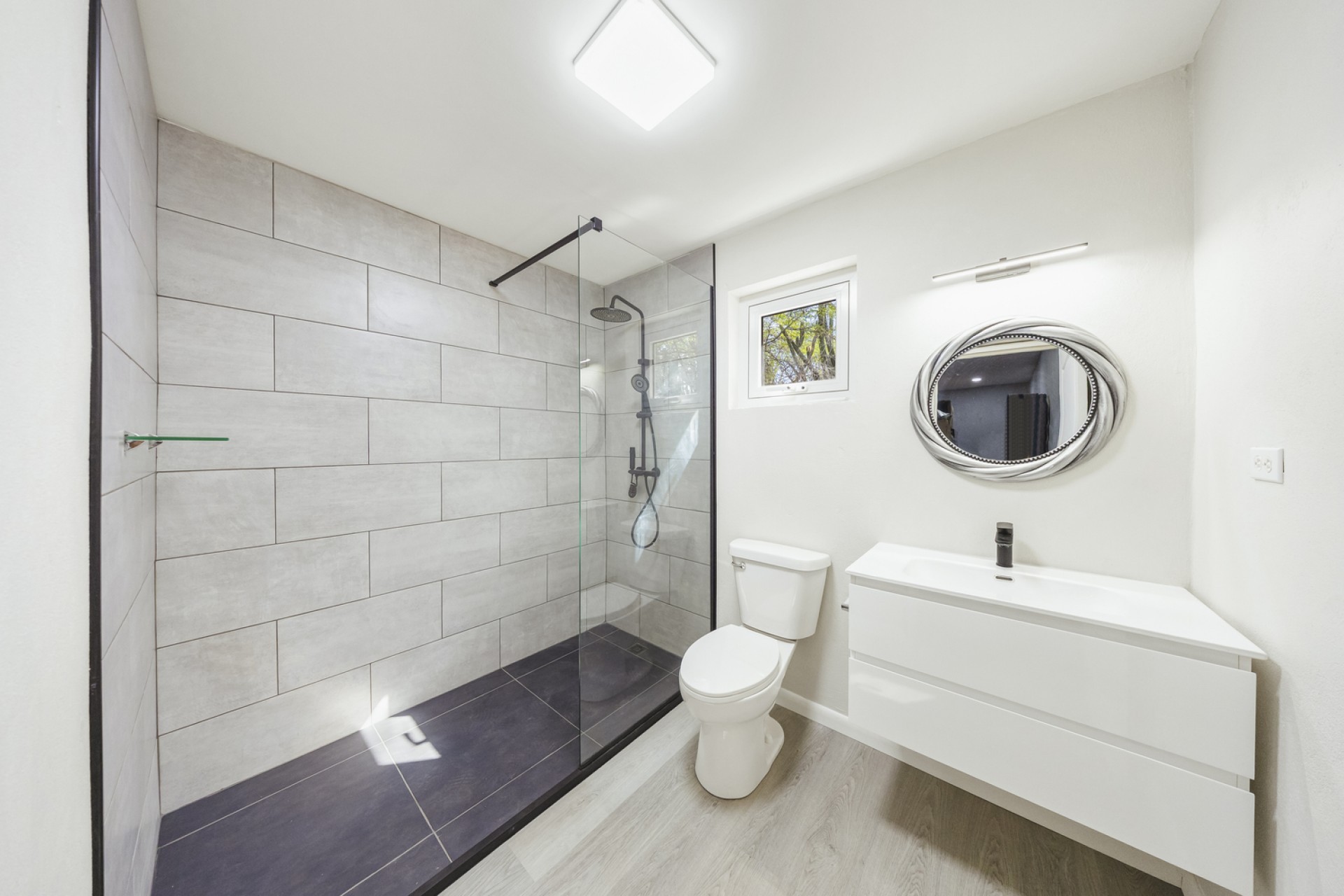 All four bedrooms feature en-suite bathrooms, finished in a clean, contemporary style. Two bathrooms include soaking tubs and walk-in showers, while the other two offer spacious walk-in showers. A dedicated laundry room with washer and dryer adds everyday convenience, and a stylish half bathroom completes the layout.