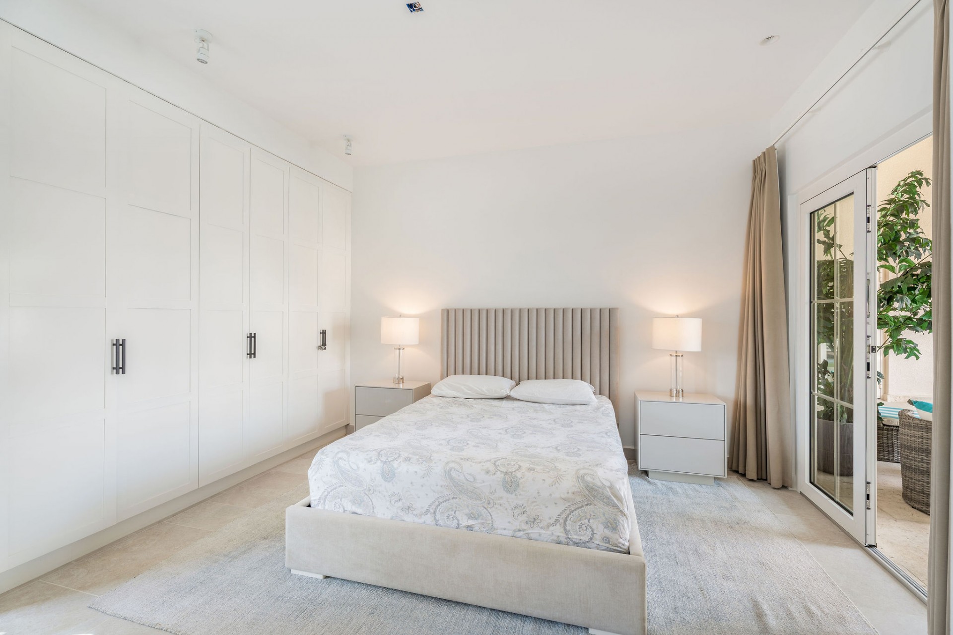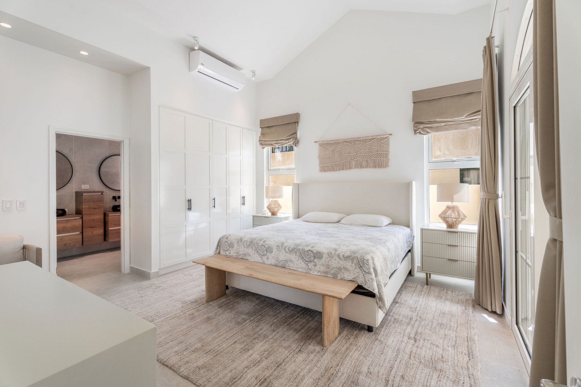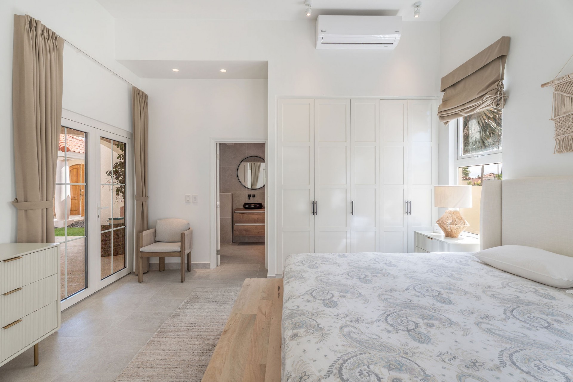 The master bedroom features a high ceiling, an en-suite bathroom, and direct access to the garden patio through its own sliding doors, creating a private and serene retreat. The two additional bedrooms are equally well-proportioned, bright, and inviting, making the home perfectly suited for family living, guests, or a combination of personal use and rental potential.