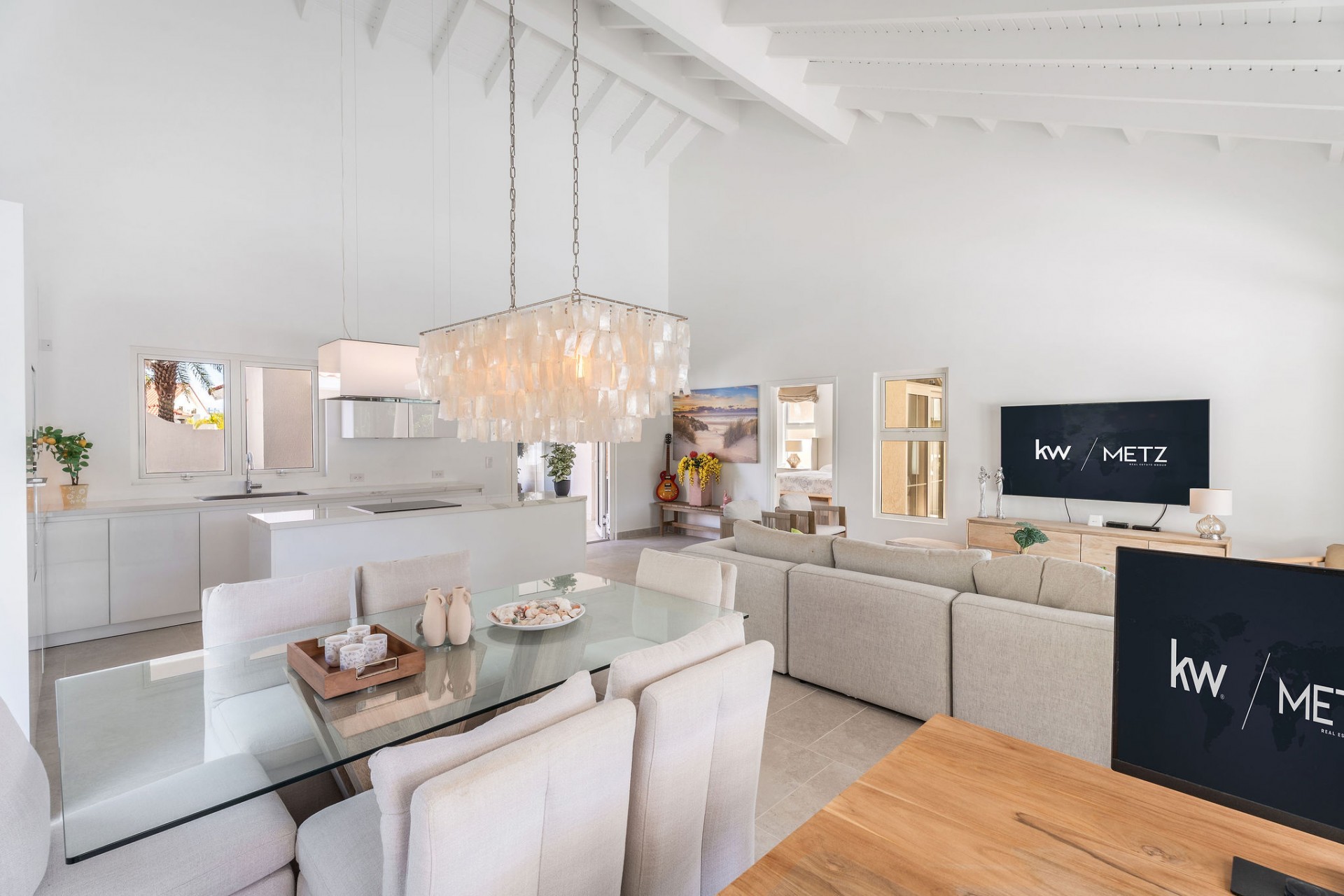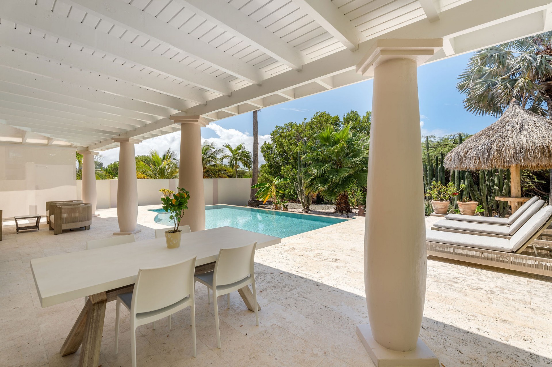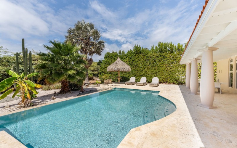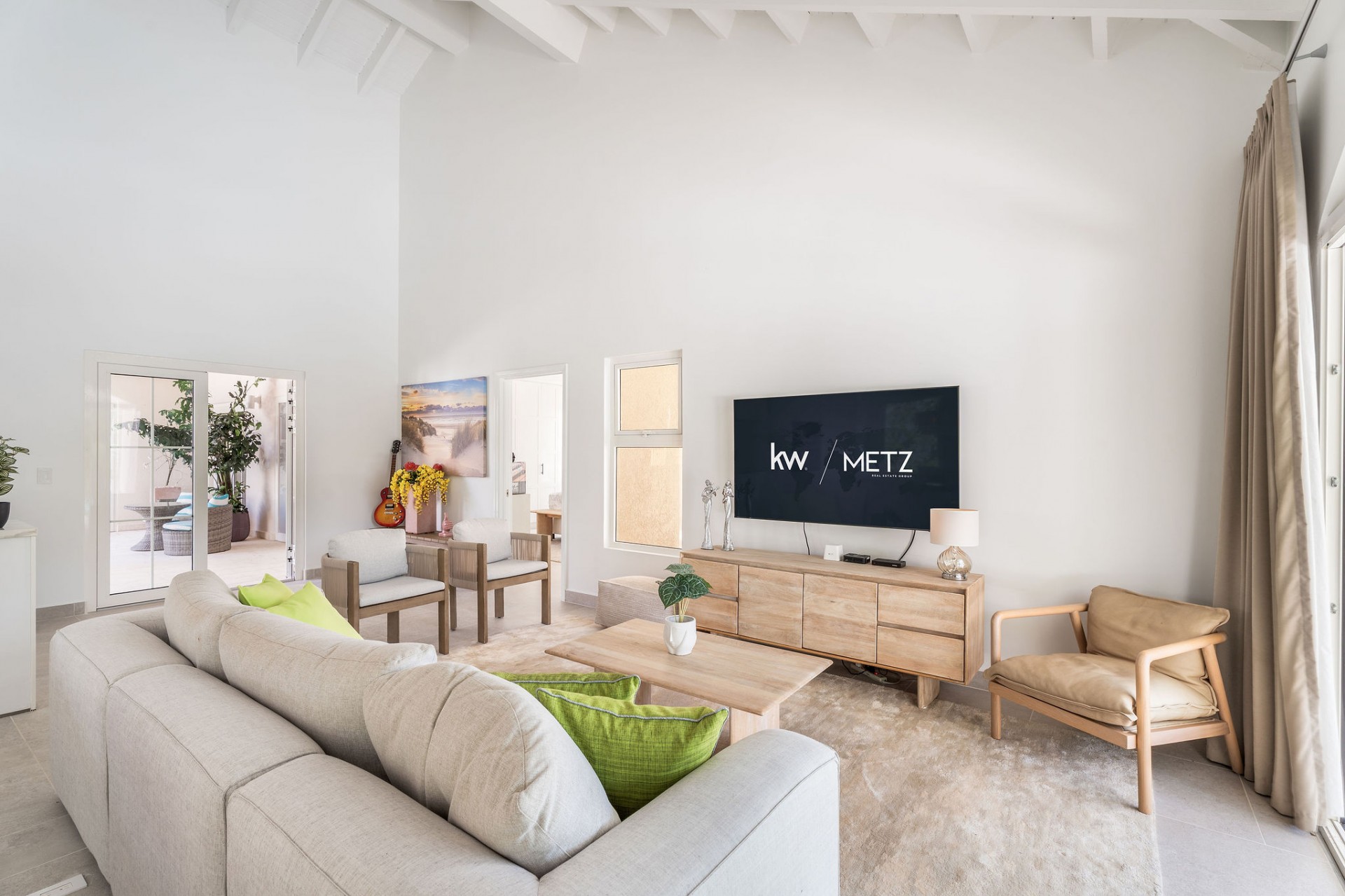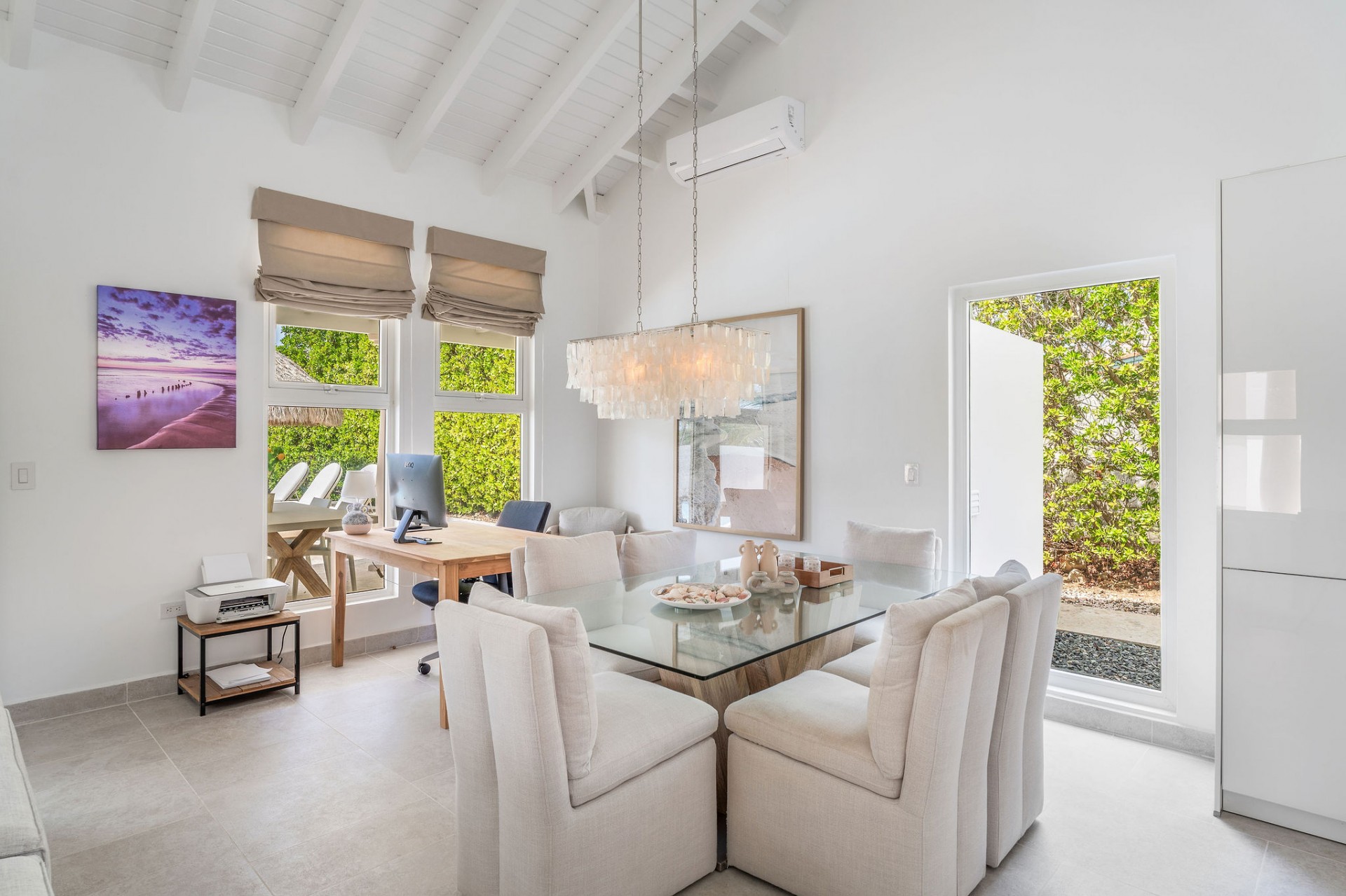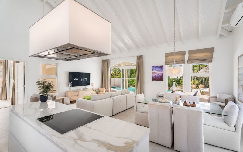 The outdoor living spaces are where this property also truly shines. The garden is a tranquil oasis, thoughtfully landscaped and surrounded by greenery, offering multiple seating and relaxation areas. A spacious covered porch provides the perfect setting for outdoor dining or lounging, while a charming palapa invites you to unwind in the fresh Caribbean breeze. Natural stone flooring throughout the outdoor areas enhances the spa-like ambiance, making this home ideal for both entertaining and everyday relaxation. A great addition to this beautifull property is the 2 car garage, both for storage and perfect to park indoors.
