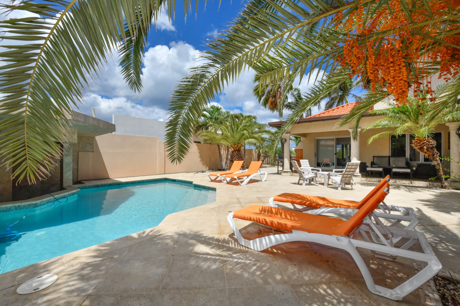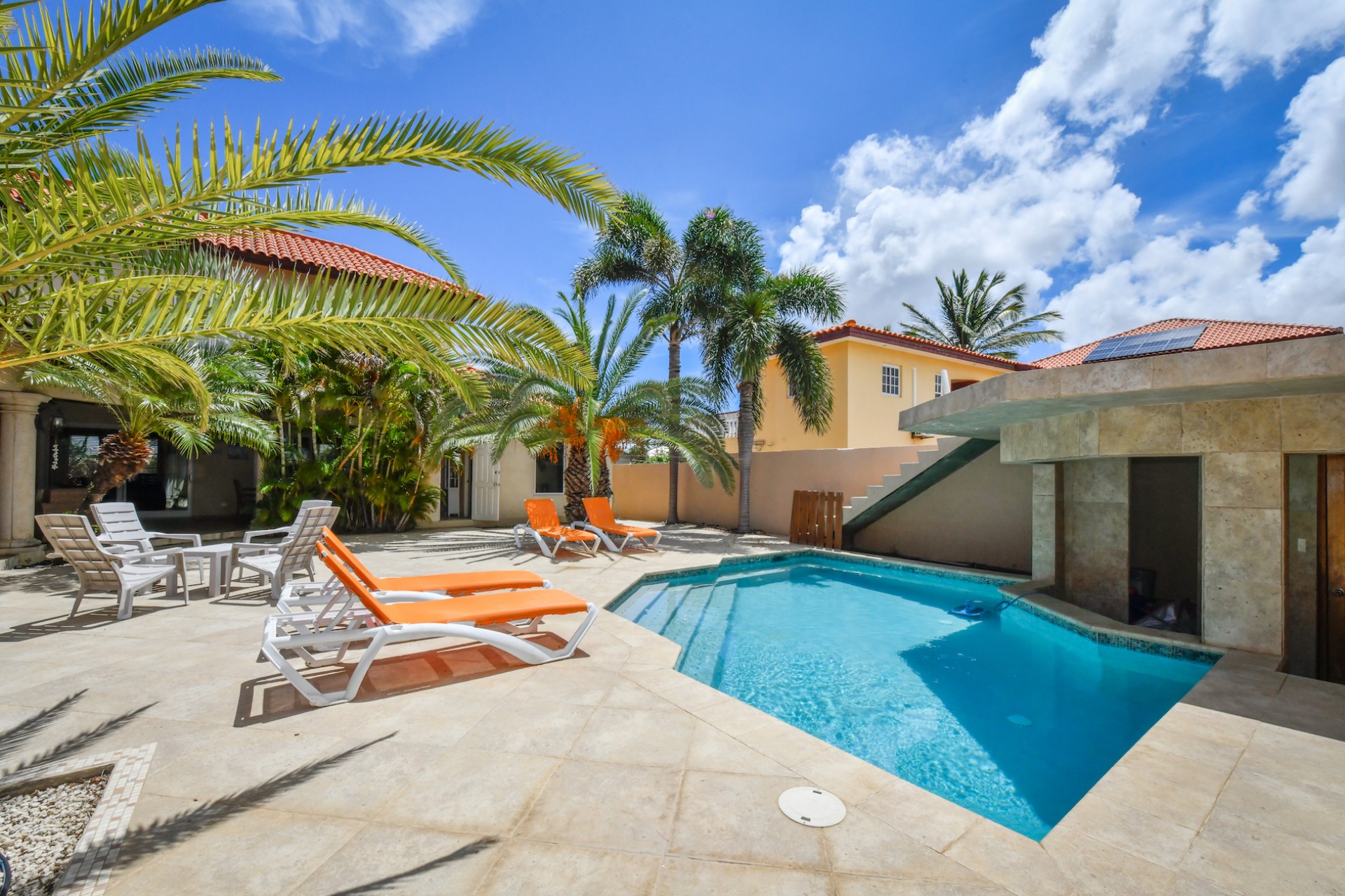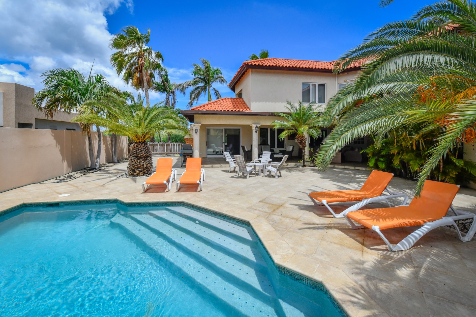 Set on a spacious 720 m² lot, the fully gated property is designed for effortless indoor-outdoor living. A beautifully landscaped tropical garden surrounds the home, creating a serene and private atmosphere. The villa features two comfortable living areas, a modern kitchen, and seamless access to the lush outdoor space with multiple seating areas and a sparkling swimming pool — perfect for entertaining or simply enjoying Aruba’s year-round sunshine.