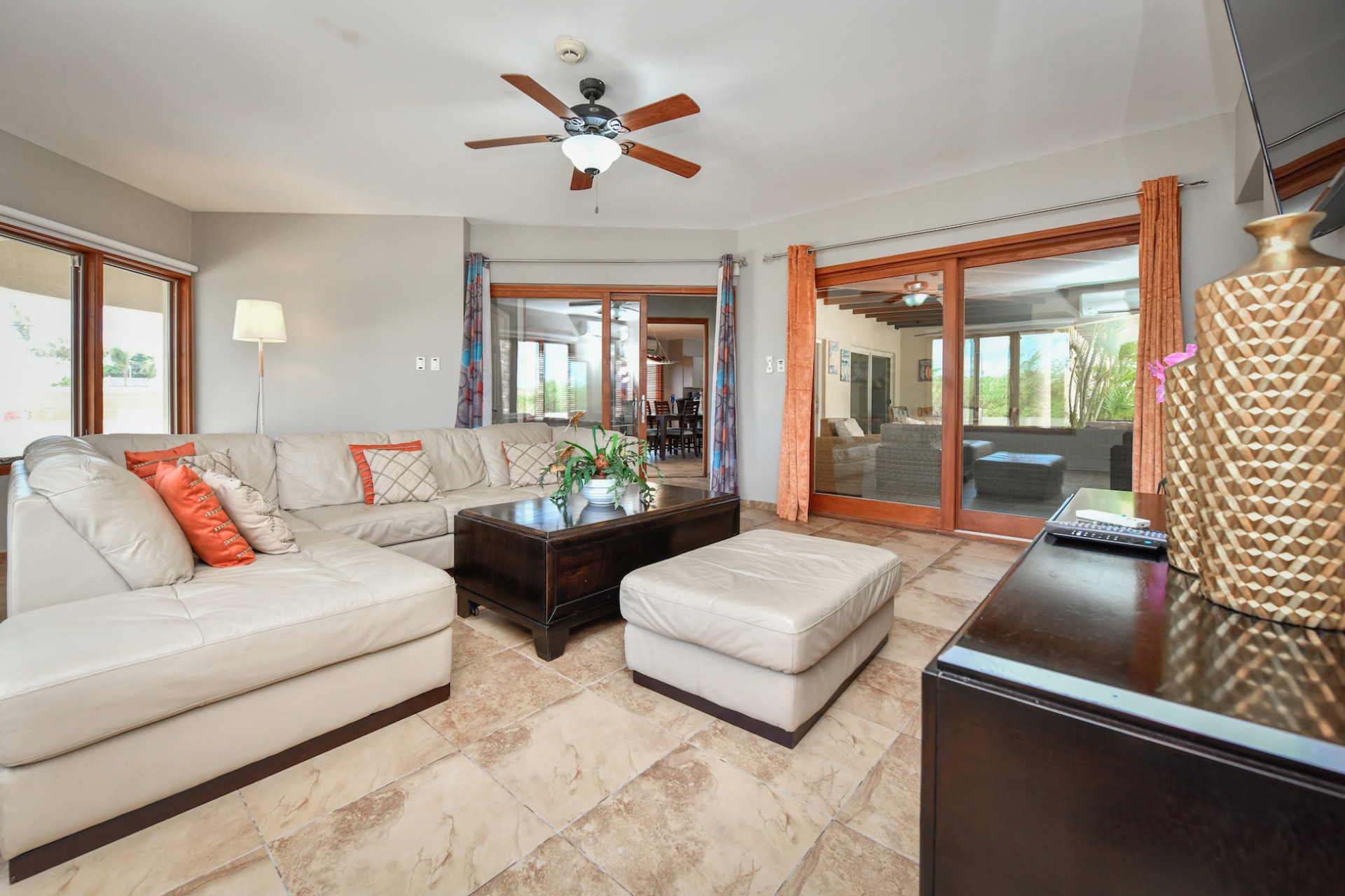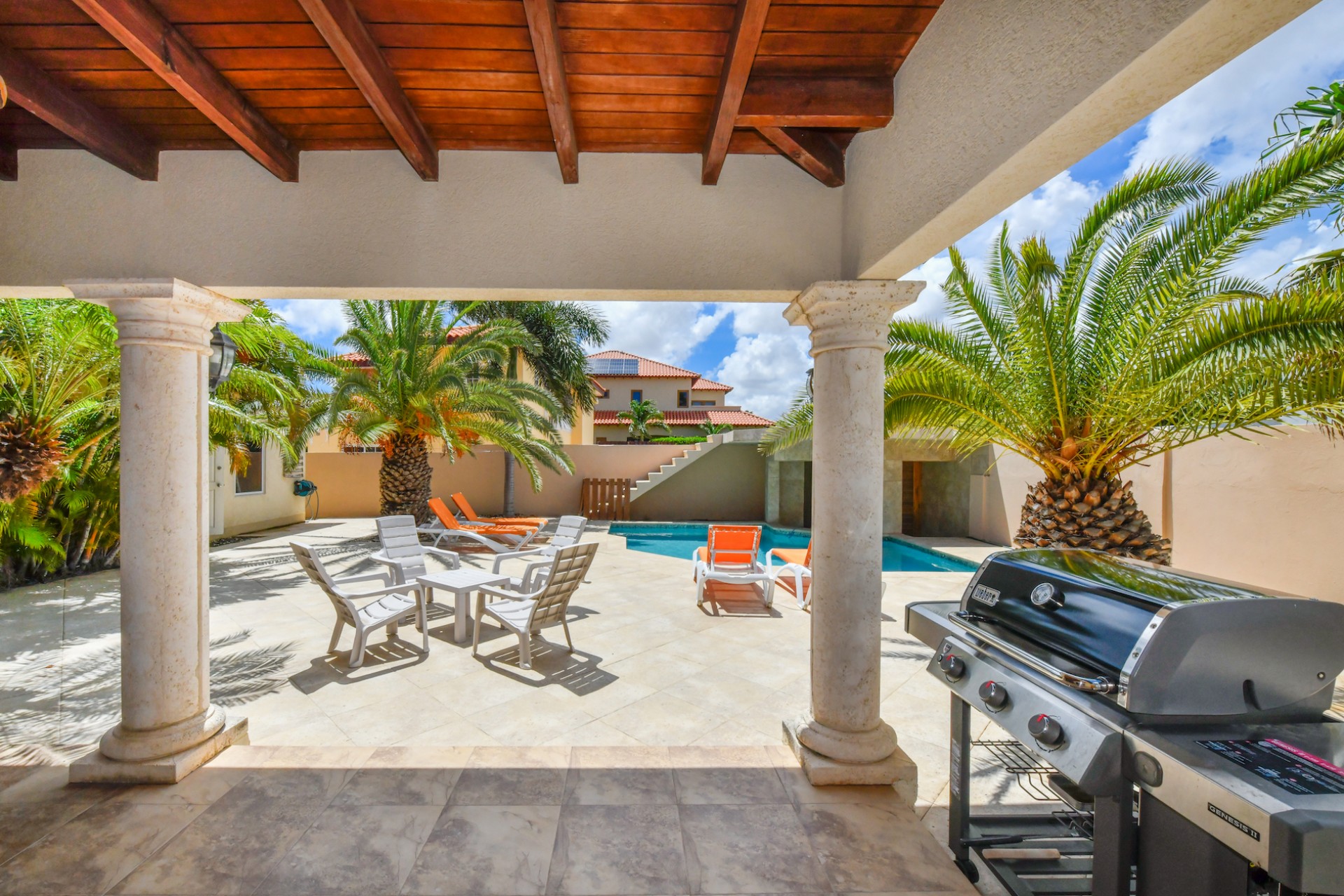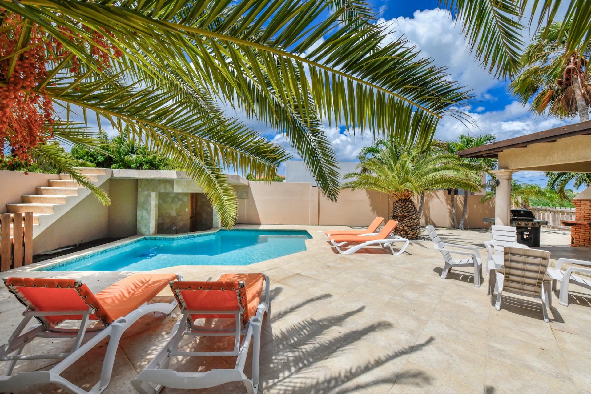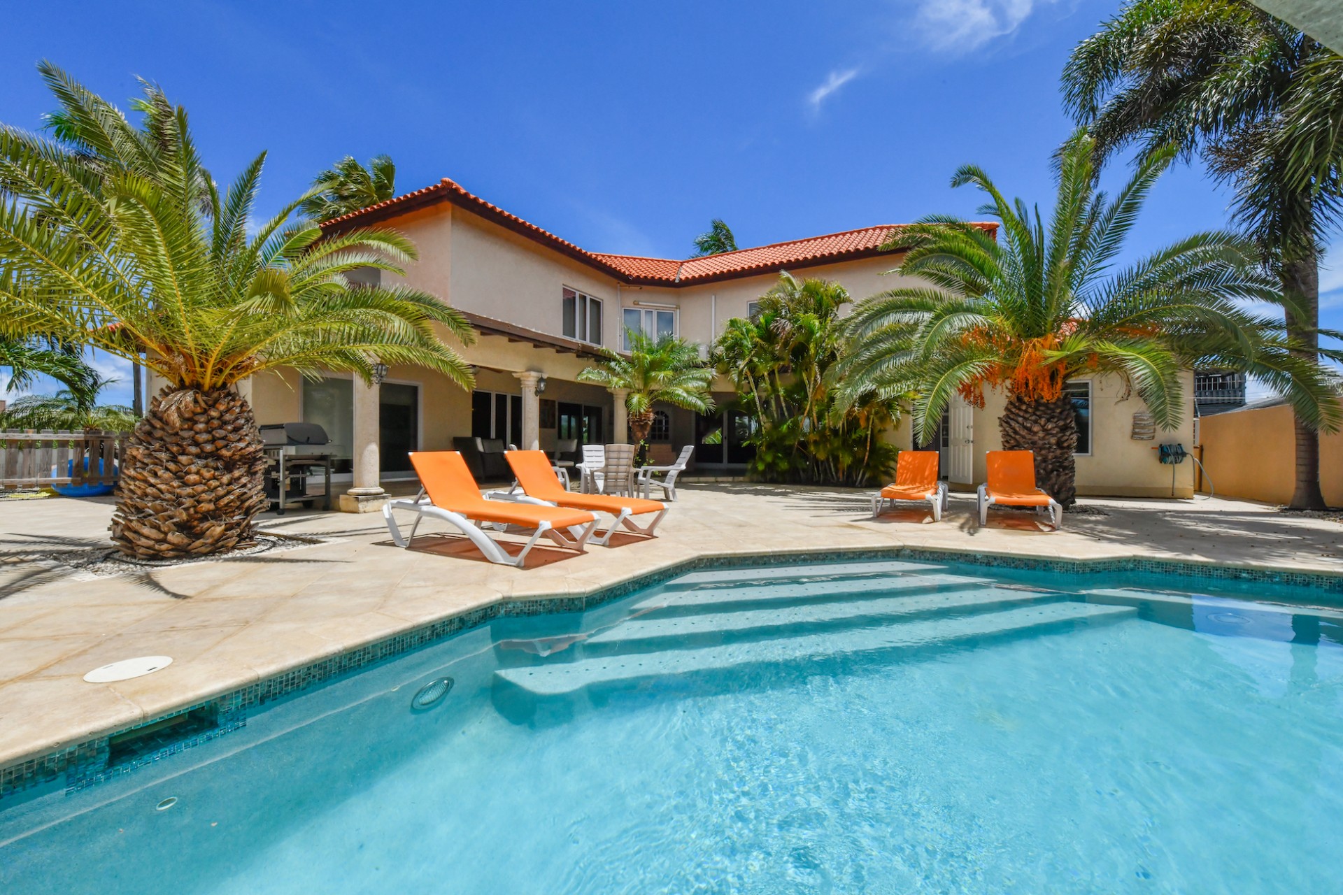 Set on a spacious 720 m² lot, the fully gated property is designed for effortless indoor-outdoor living. A beautifully landscaped tropical garden surrounds the home, creating a serene and private atmosphere. The villa features two comfortable living areas, a modern kitchen, and seamless access to the lush outdoor space with multiple seating areas and a sparkling swimming pool — perfect for entertaining or simply enjoying Aruba’s year-round sunshine.