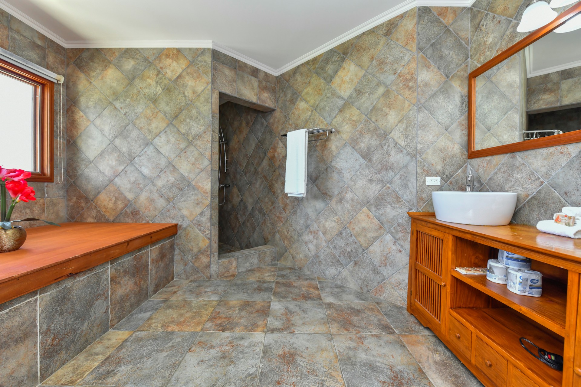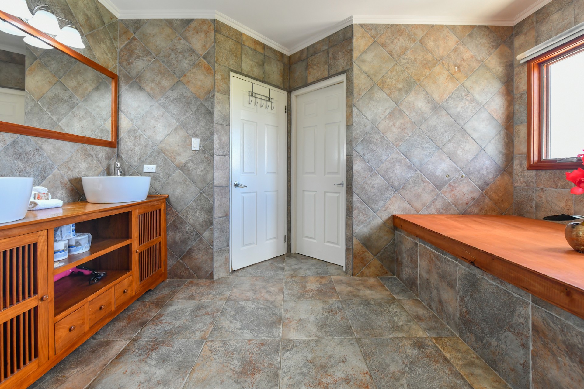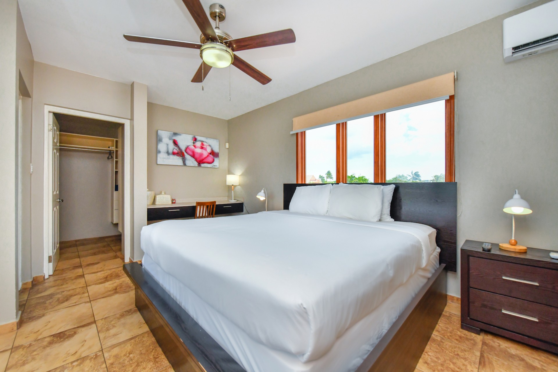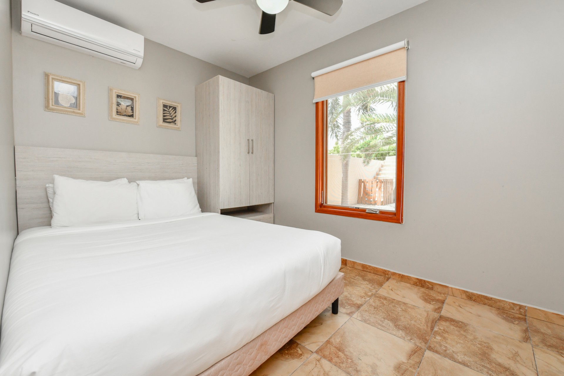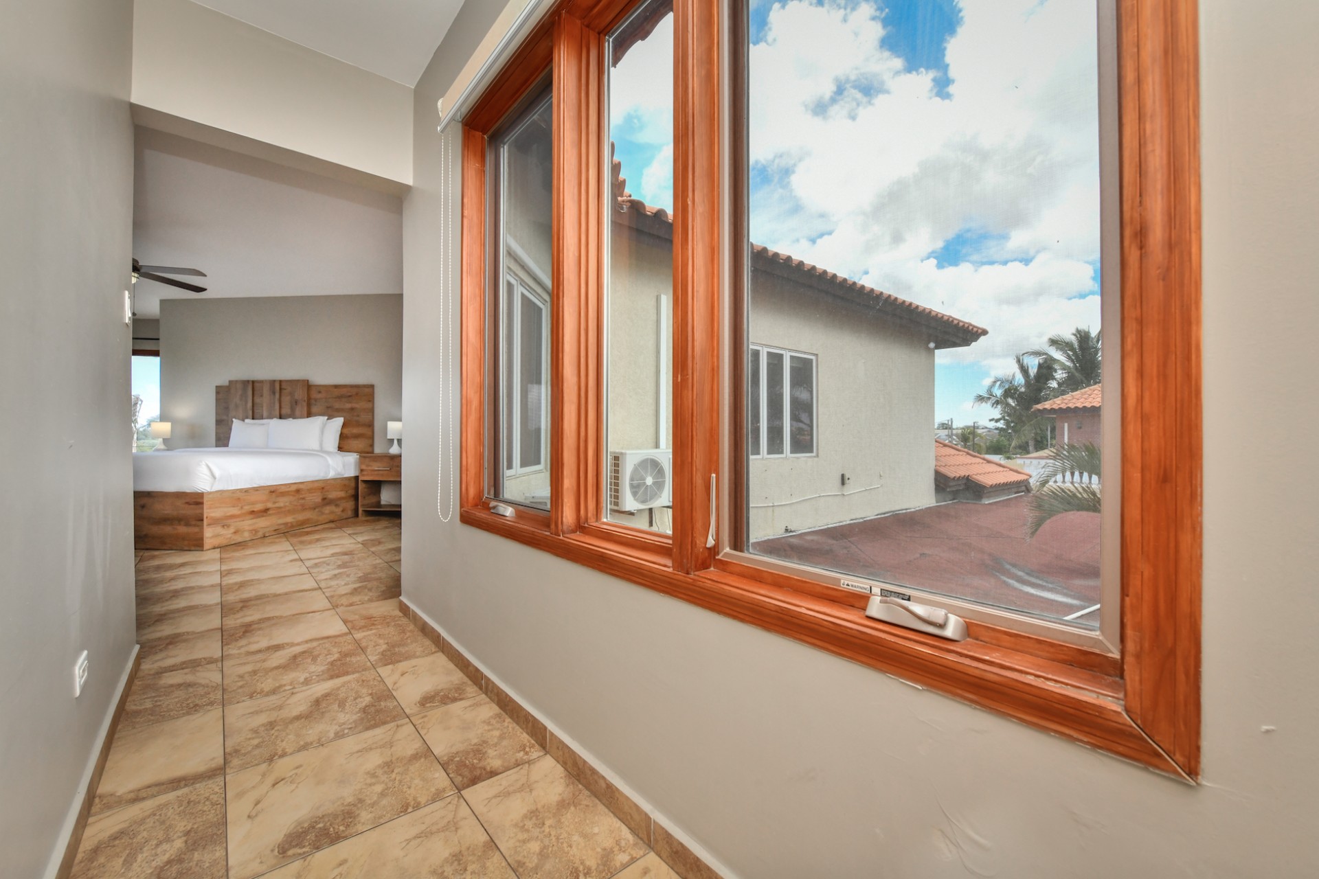 The villa features four bedrooms thoughtfully distributed over two levels. Two bedrooms are located upstairs, each with access to a private balcony, while the two downstairs bedrooms open directly to the garden, creating a seamless indoor-outdoor living experience. Three of the bedrooms are generously sized and include walk-in closets, while the fourth bedroom offers a comfortable space for guests, children, or a home office.